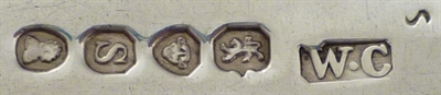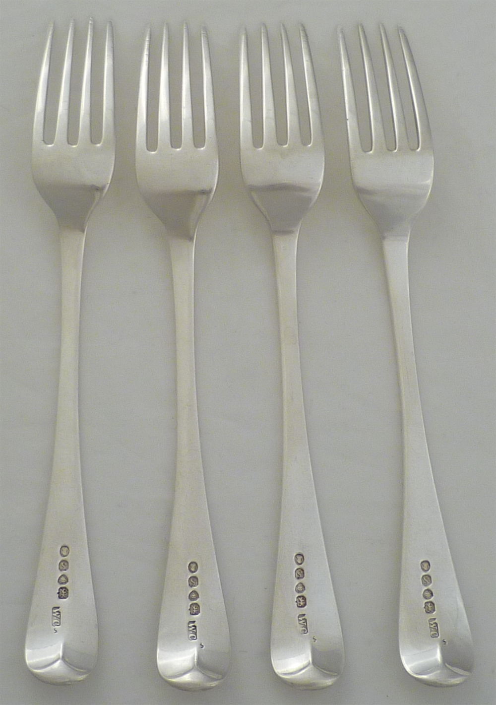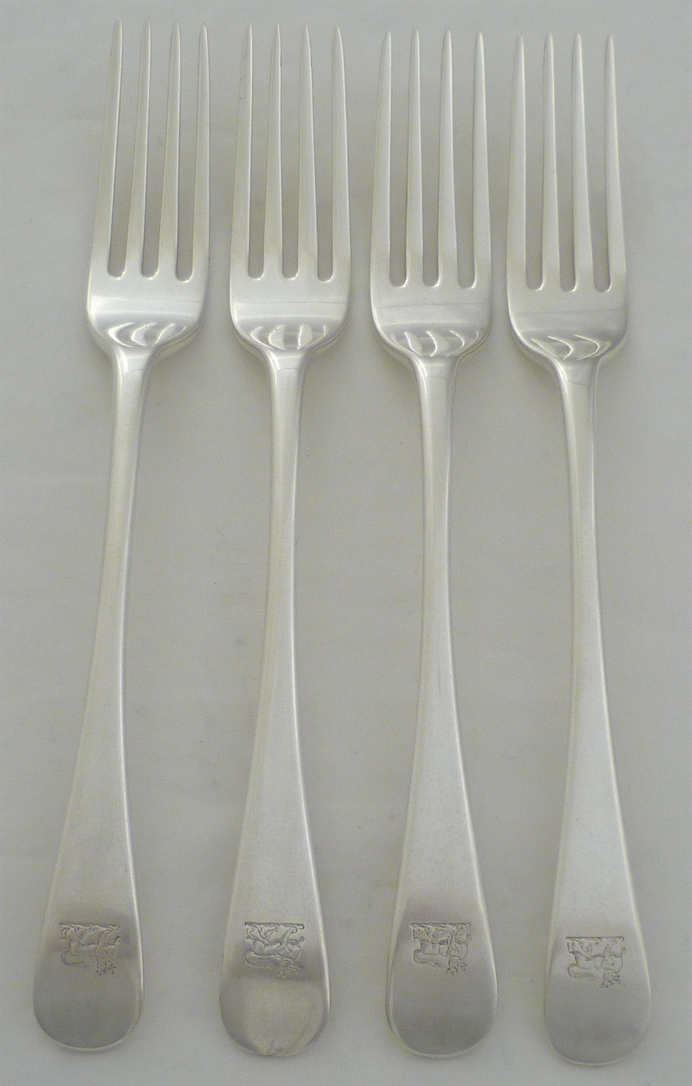 DESCRIPTION | Four William IV silver Old English pattern table forks with down turned terminals and frontal crest engraving. |