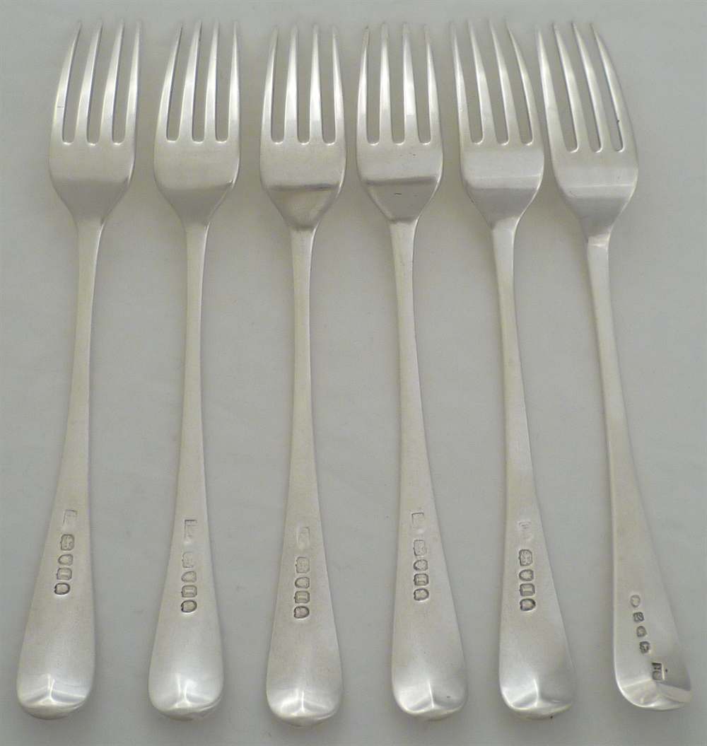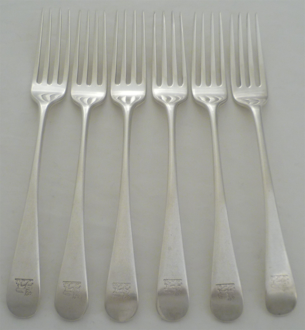 DESCRIPTION | Six Georgian silver Old English pattern table forks with down turned terminals and frontal crest engraving. |