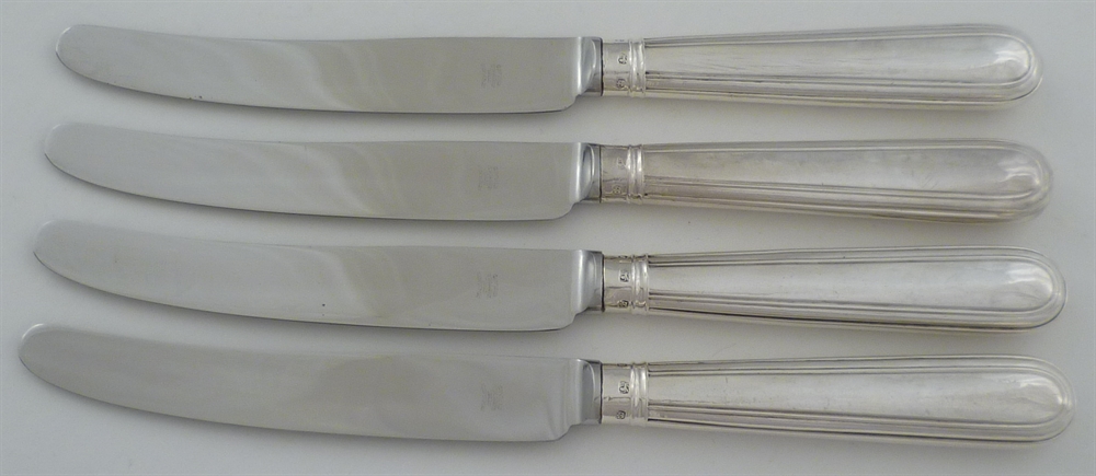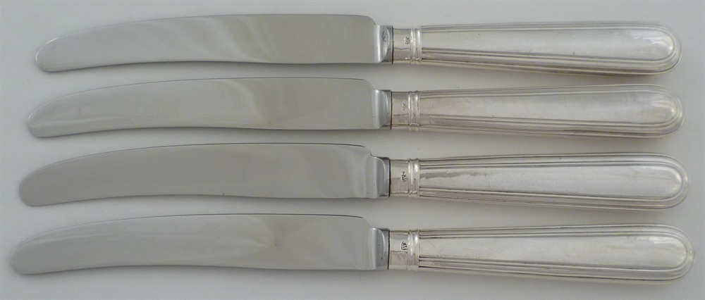 DESCRIPTION | Set of four William IV silver Old English & Thread pattern table knives with mirror finished finger point stainless steel blades and no engraving. |