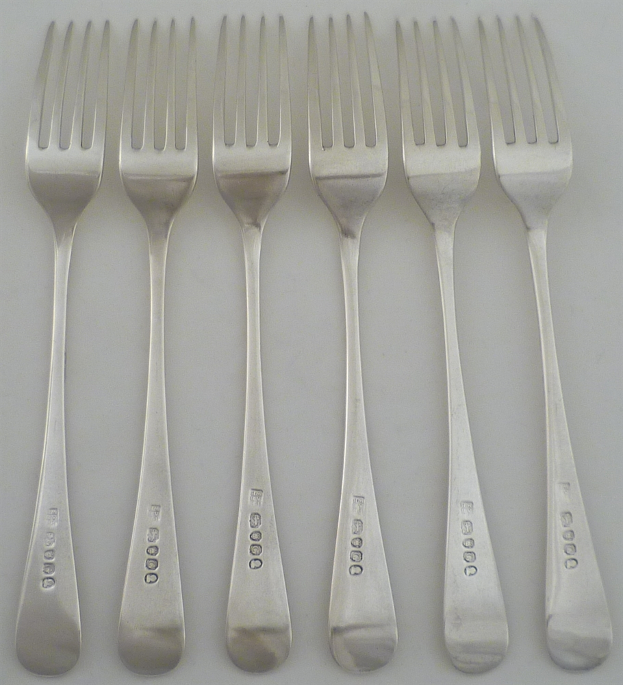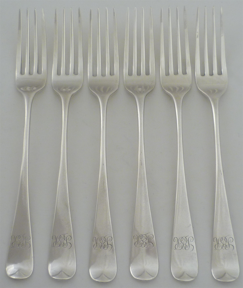 DESCRIPTION | Set of six Georgian silver Old English pattern table forks with a frontal monogram engraving. |