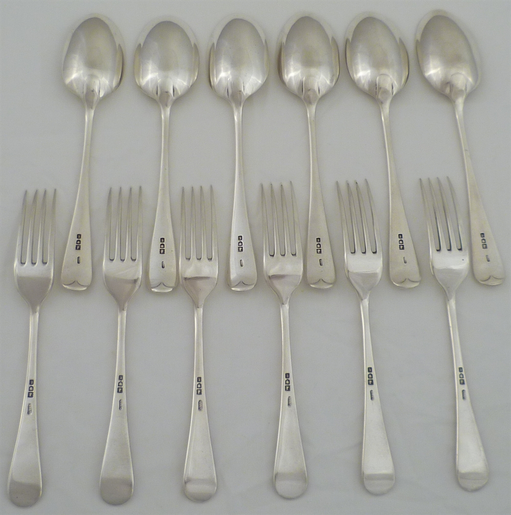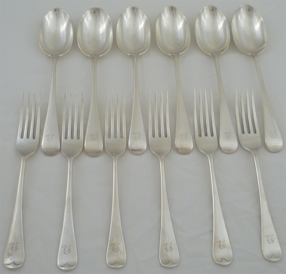 DESCRIPTION | Twelve piece solid silver Old English pattern dessert service comprising of six forks and six spoons with an initial 'n' engraving. |