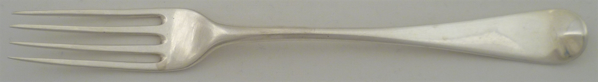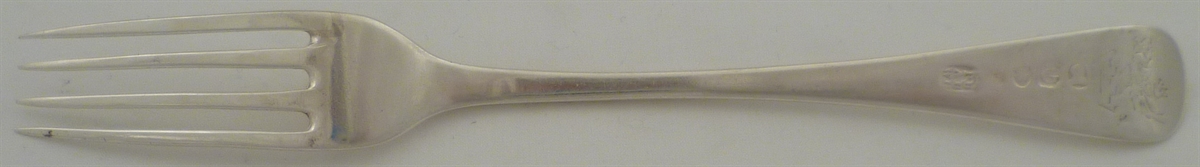 DESCRIPTION | Georgian solid silver Old English pattern dessert or salad fork with a crest engraving verso. |