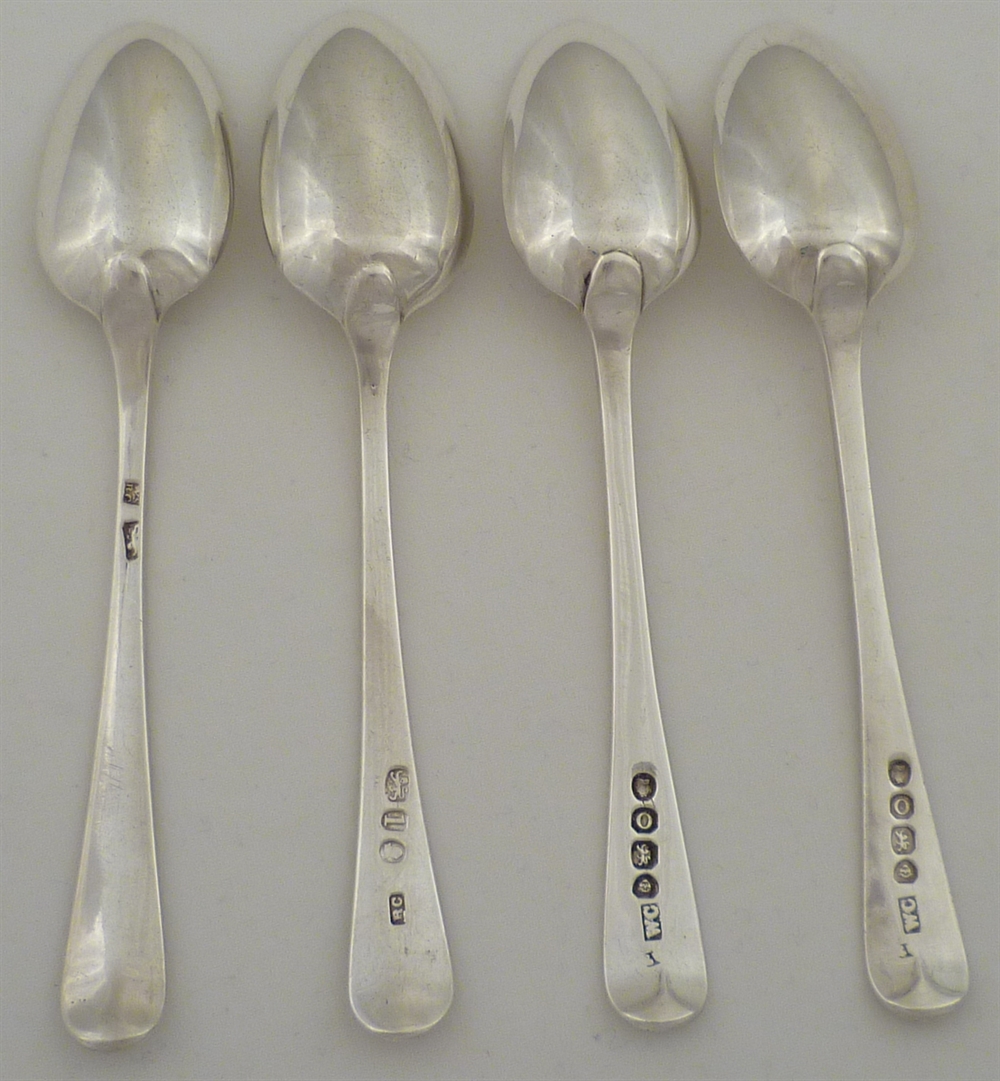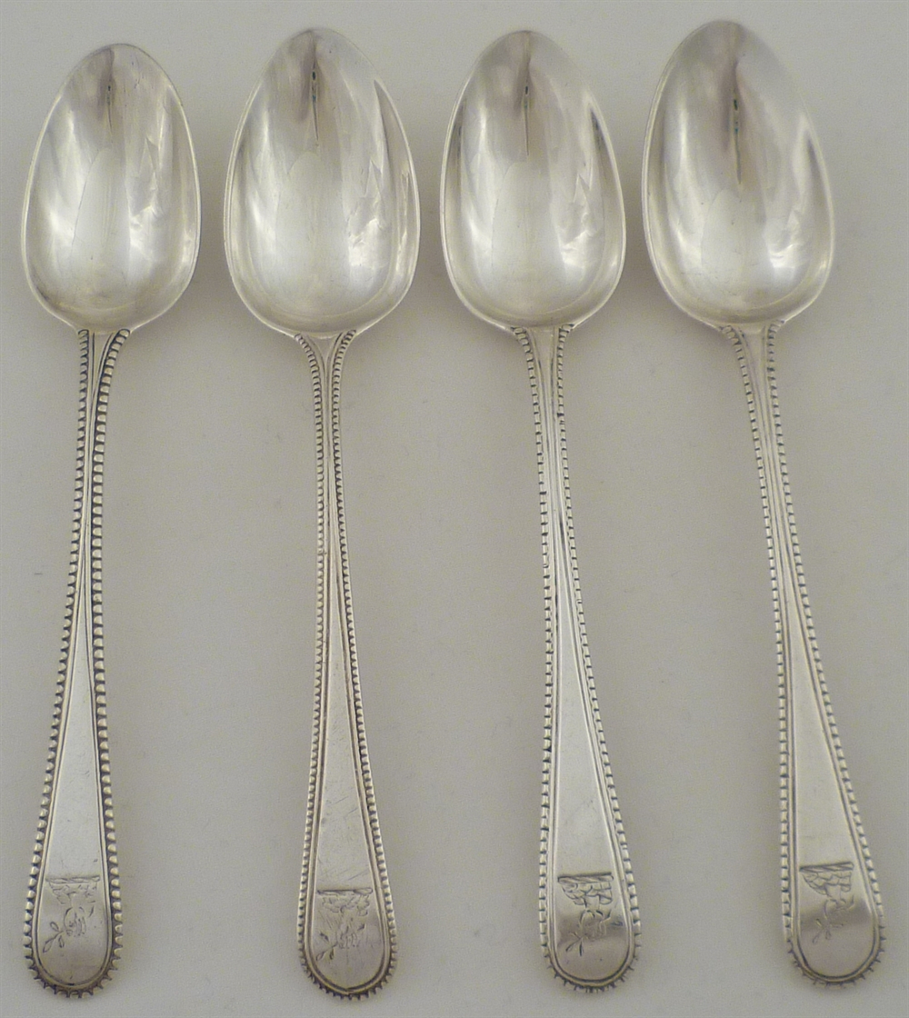 DESCRIPTION | Four Georgian solid silver bead edge Old English pattern teaspoons with frontal crest engraving. |