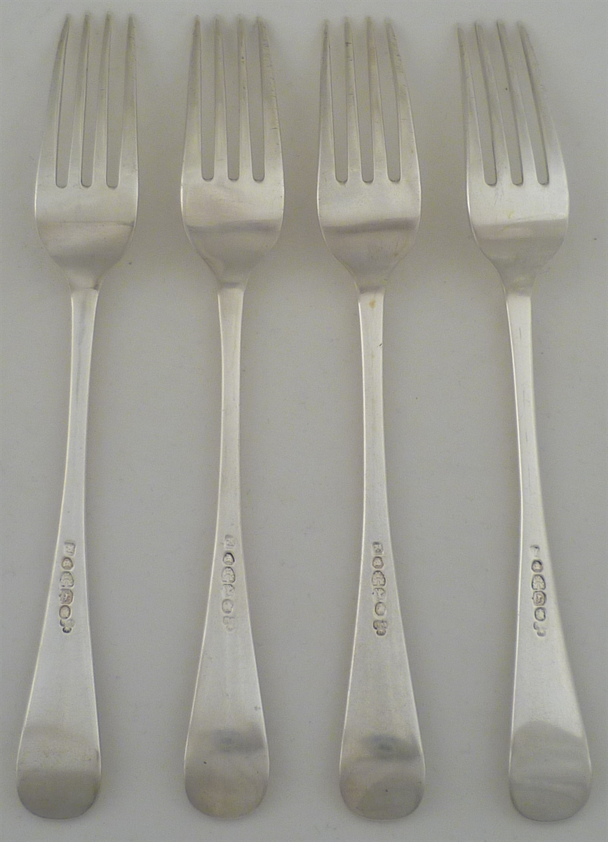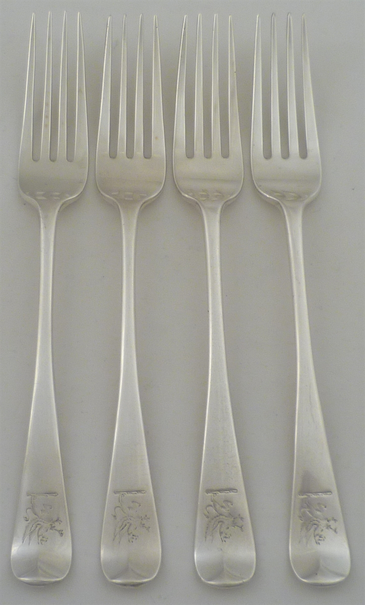 DESCRIPTION | Four Victorian silver Old English pattern table forks with a good frontal crest engraving. |