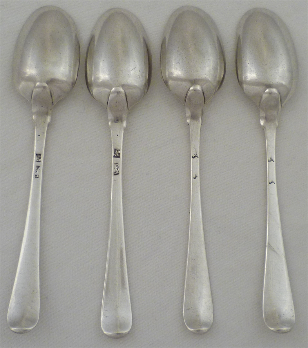 actually very good for teaspoons of this period, silver thick throughout, probable frontal erasures, some bowl tip wear but this was anticipated in the design and there is more than enough metal left for a silversmith to