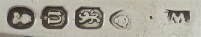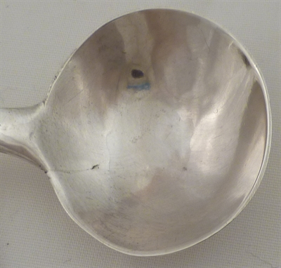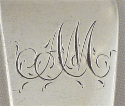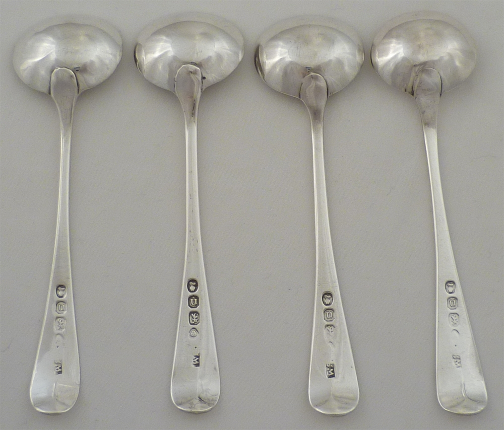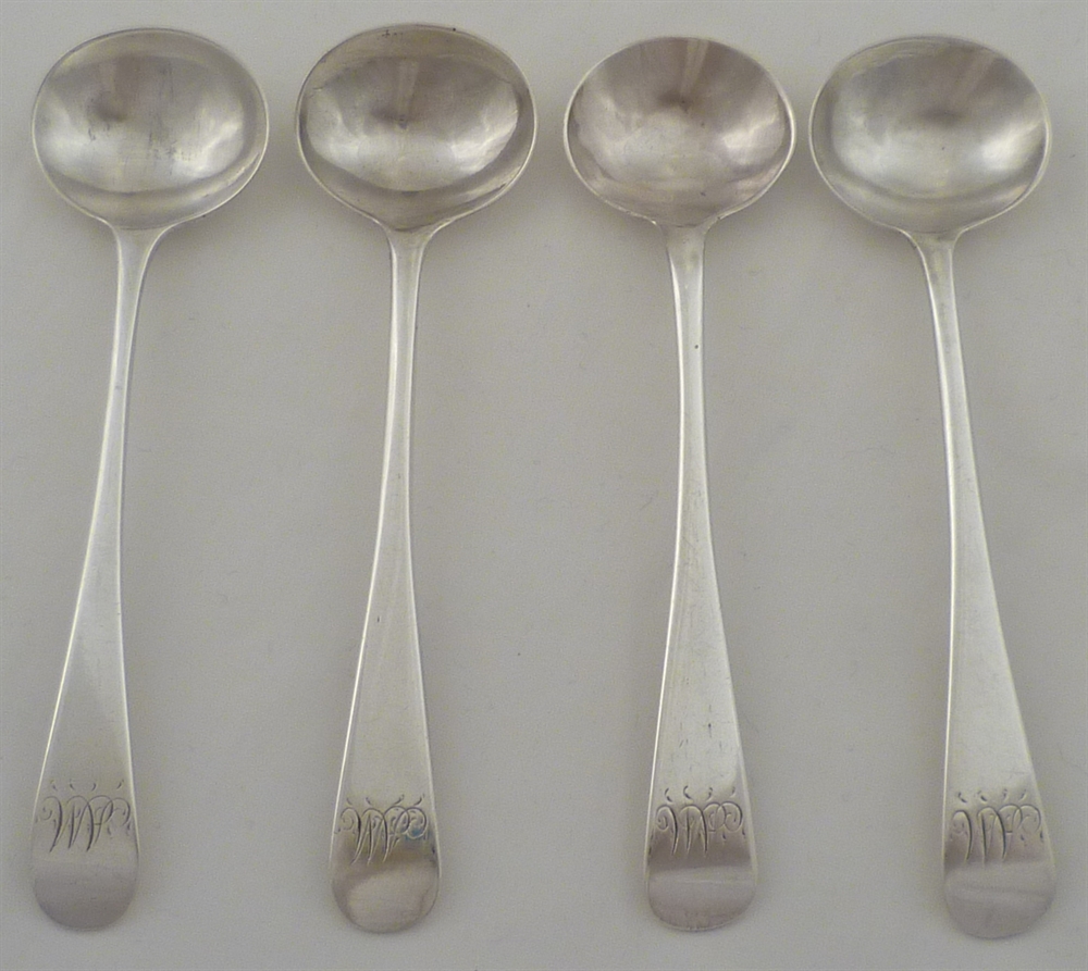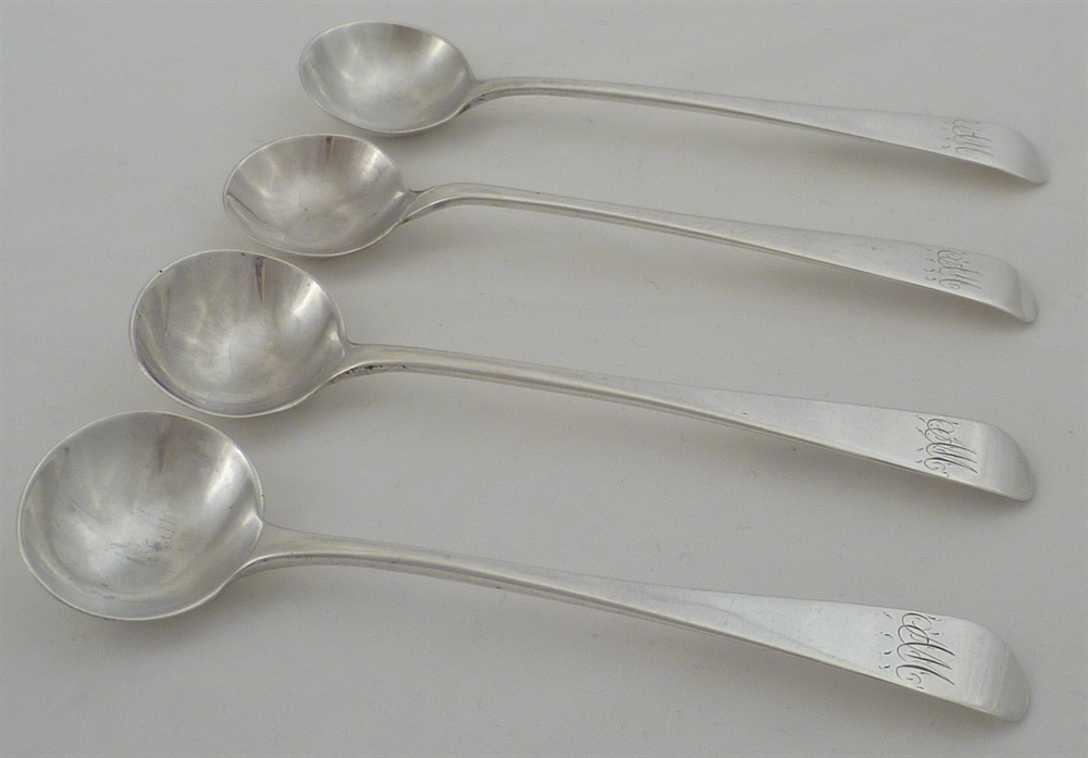 DESCRIPTION | Set of four Georgian silver Old English pattern salt spoons with frontal monogram engraving 'AM'. |