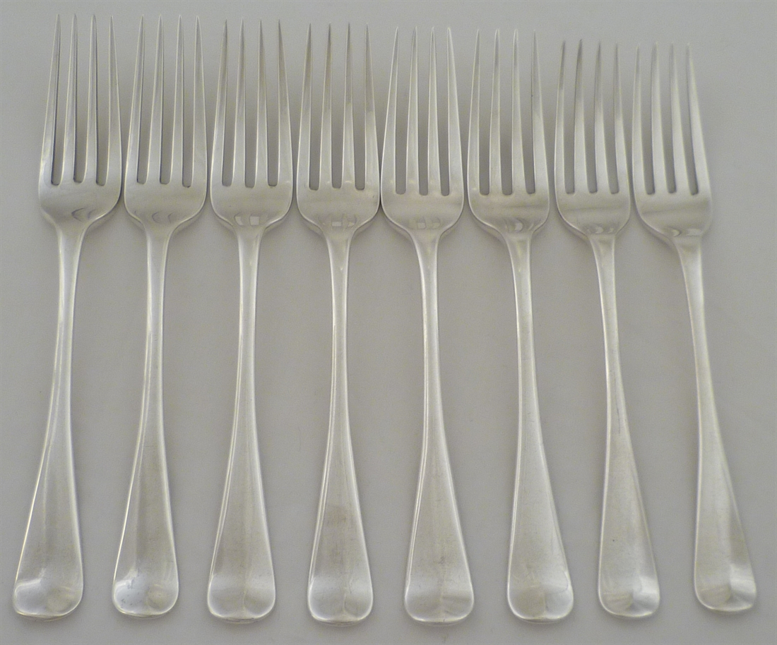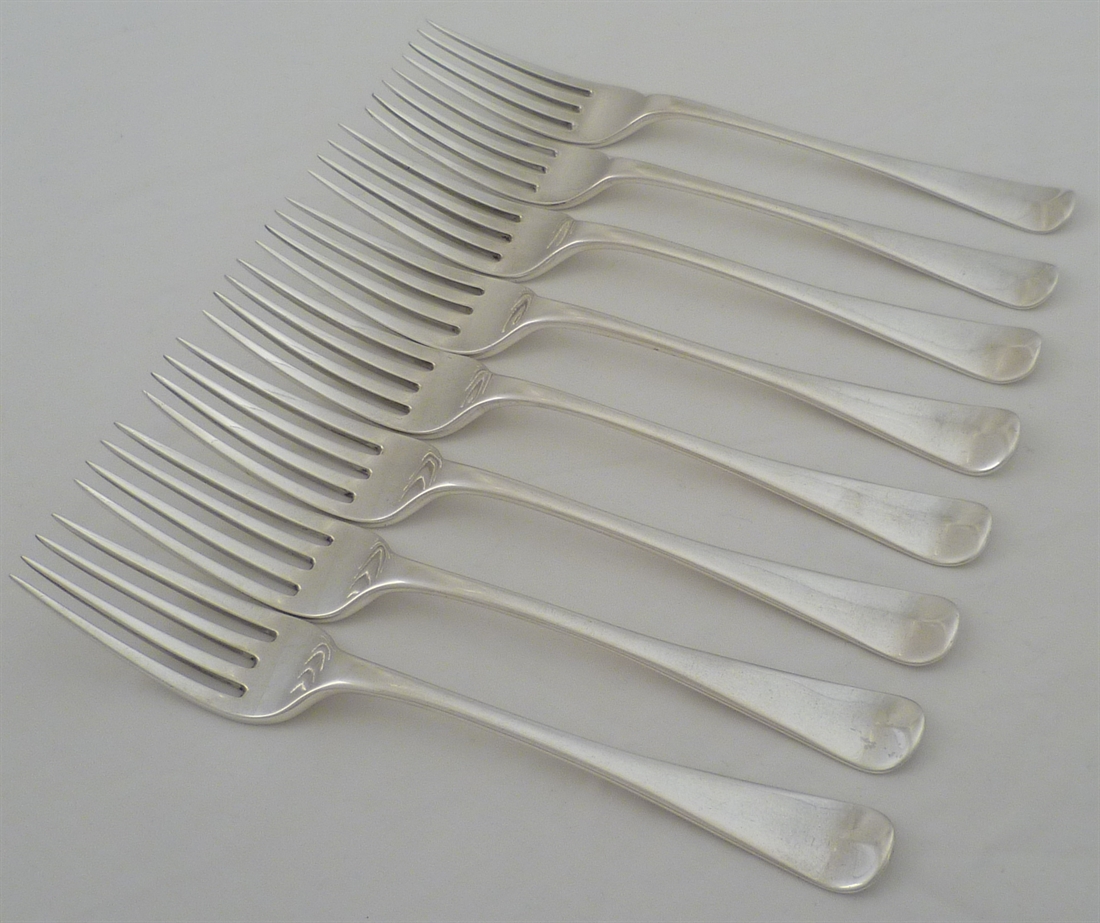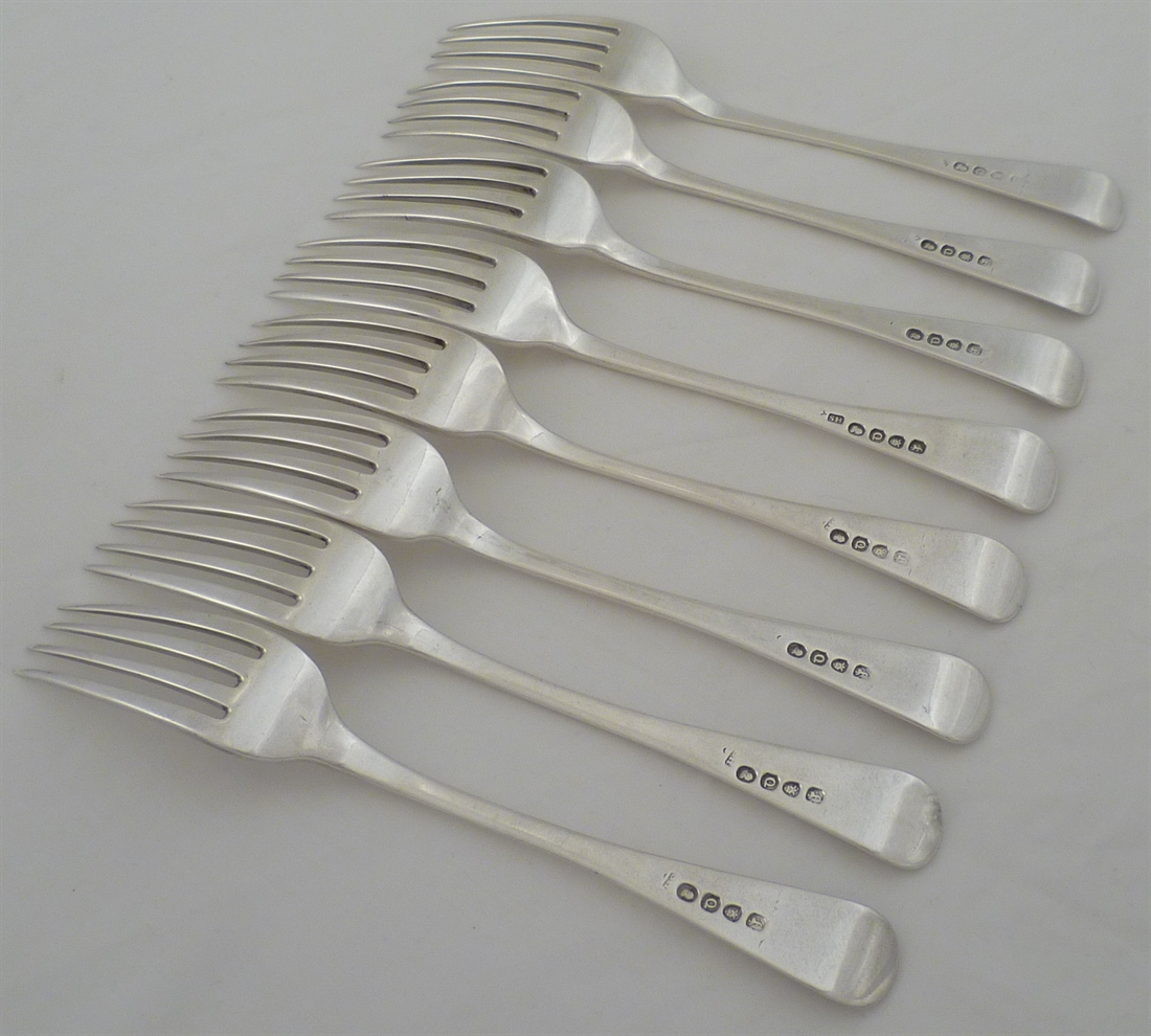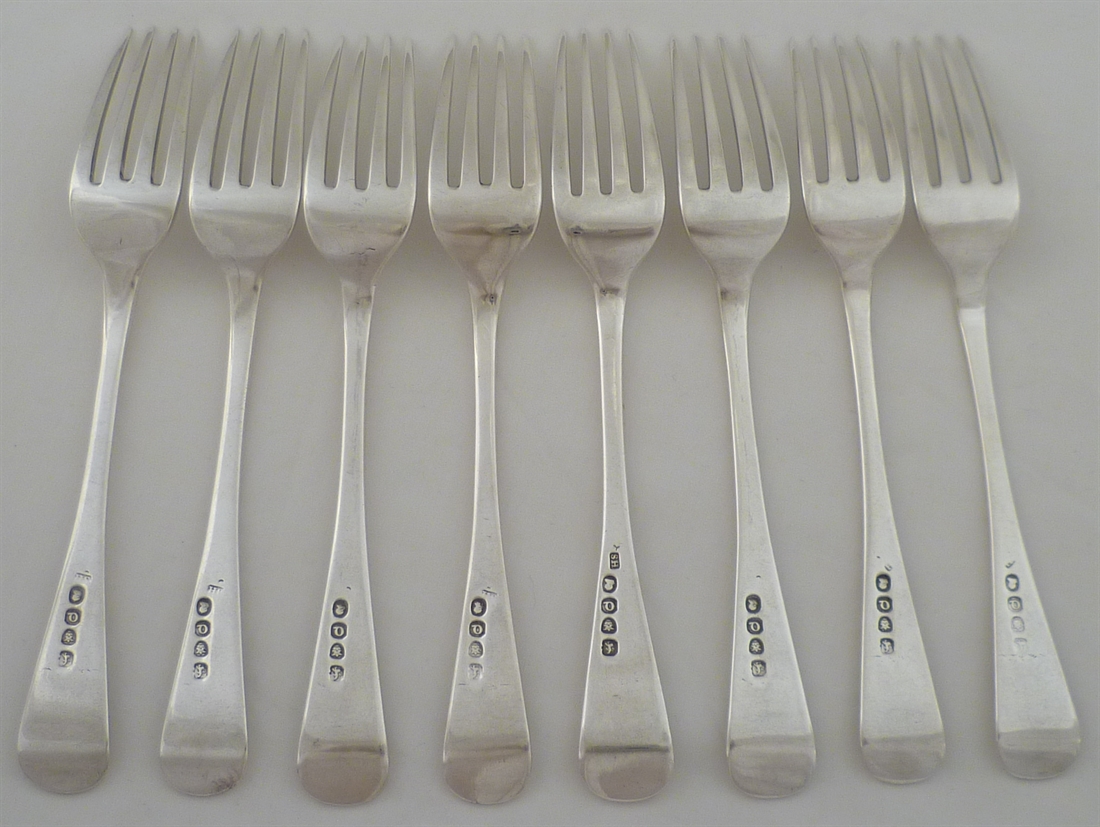 Good and scarce set of eight Georgian silver Old English pattern dessert or salad forks. No engraving but there has been a gentle erasure of a crest verso and traces of the bottom of the crest remain to some just