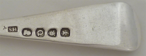 above the hallmarks. Hallmarking appears to have been done after a good lunch as some have only just made it onto the forks. Although same maker and date, the two on the far right in the first image have slightly shorter stems and
