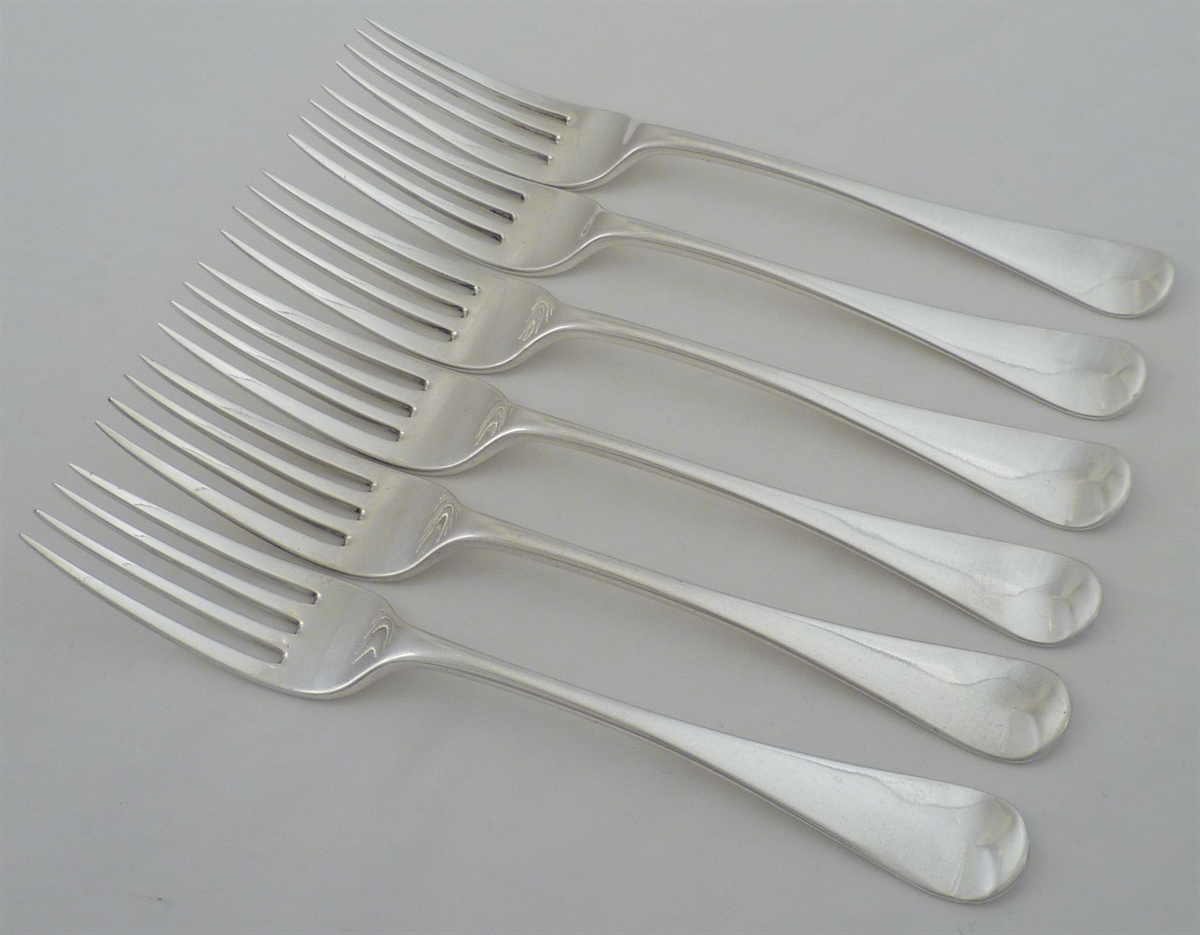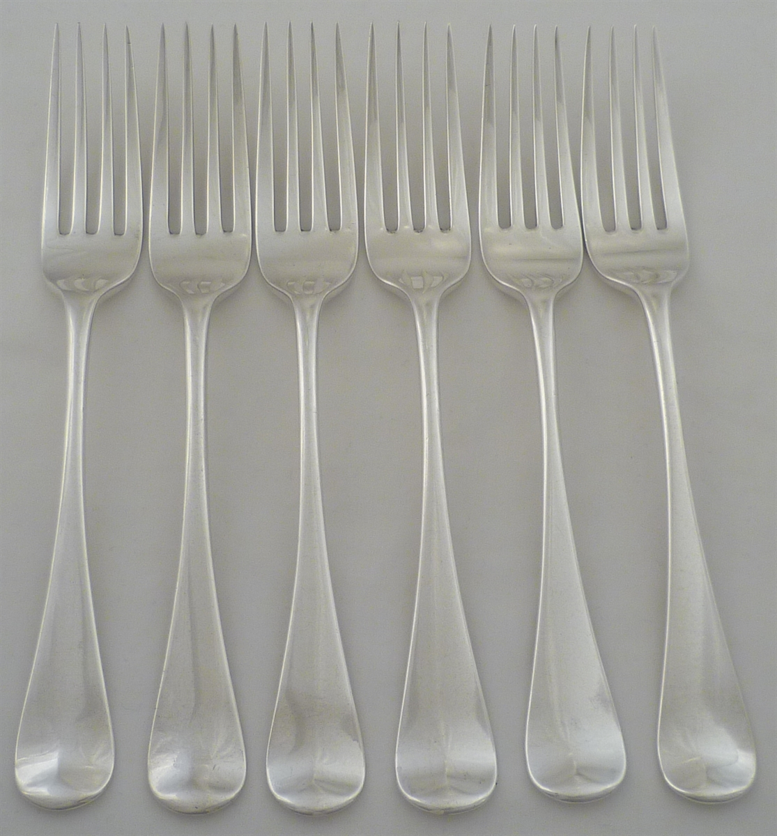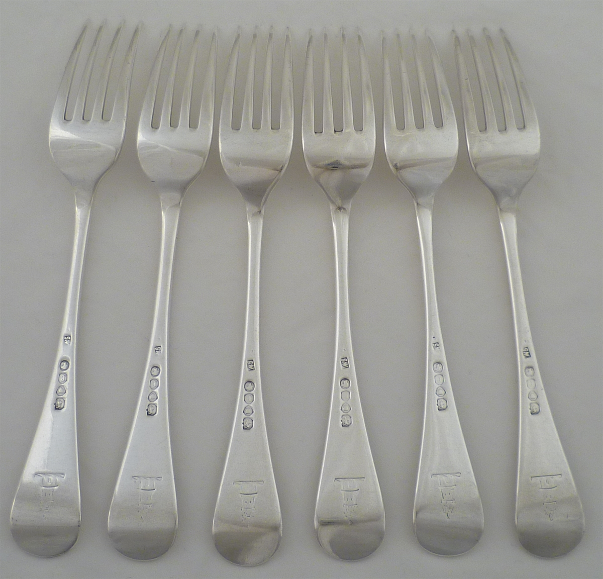 DESCRIPTION | Set of six heavy Victorian solid silver Old English pattern table forks with a crest engraving verso and broad terminals. |
