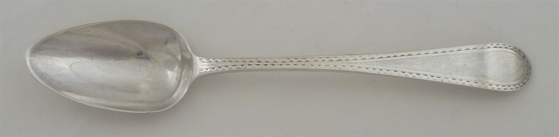 DESCRIPTION | One Georgian solid silver feather edge Old English pattern teaspoon with no engraving or erasure and a long bowl drop. |