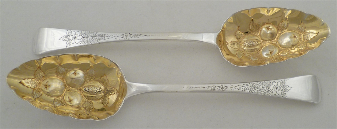 DESCRIPTION | Pair of Irish Georgian solid silver Old English pattern 'berry' spoons with engraved decoration and strongly gilded bowls with very long rat tail drops. |