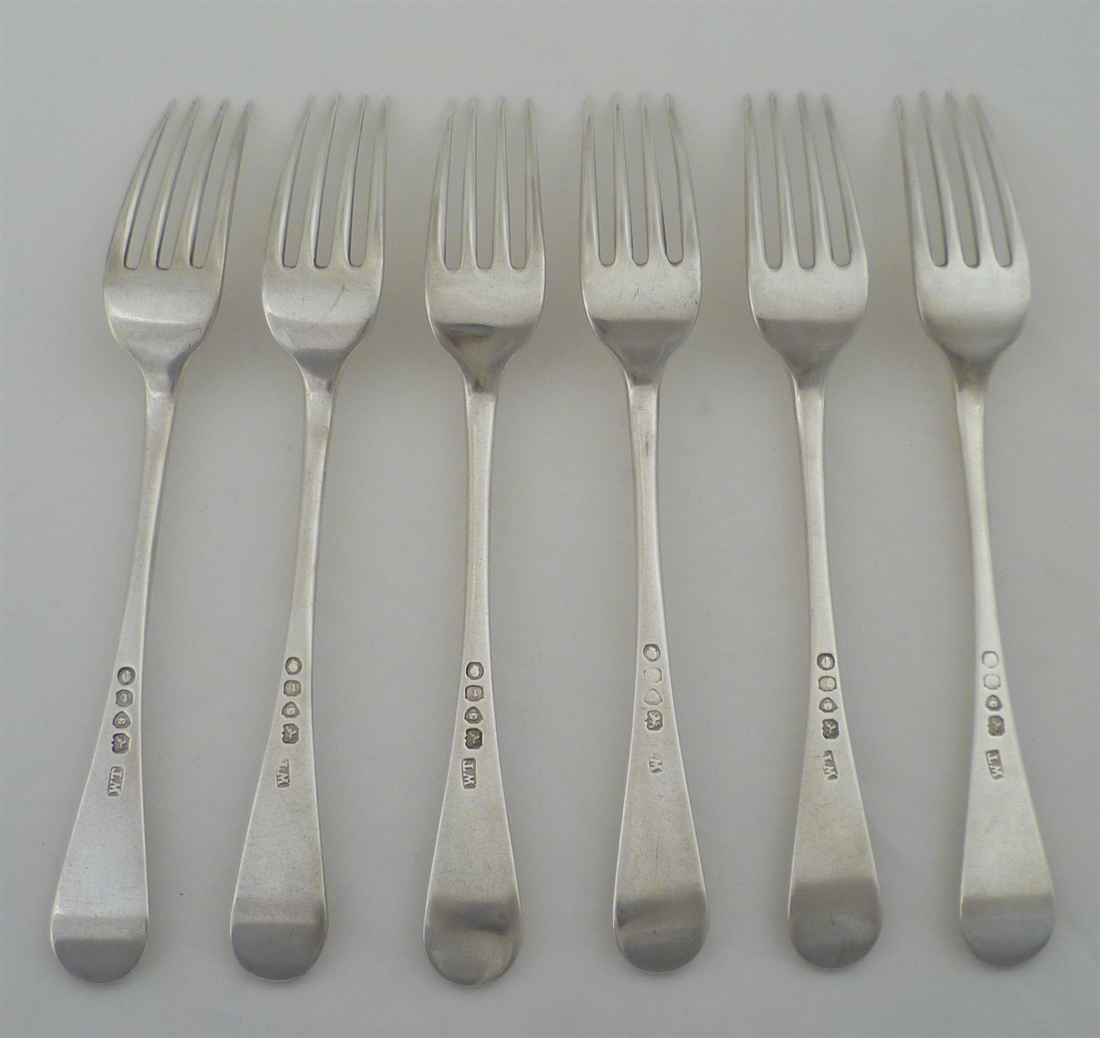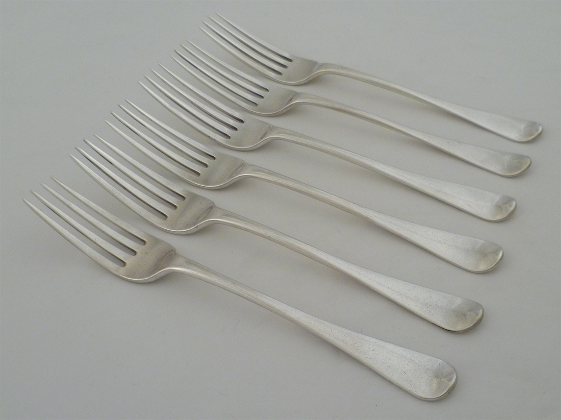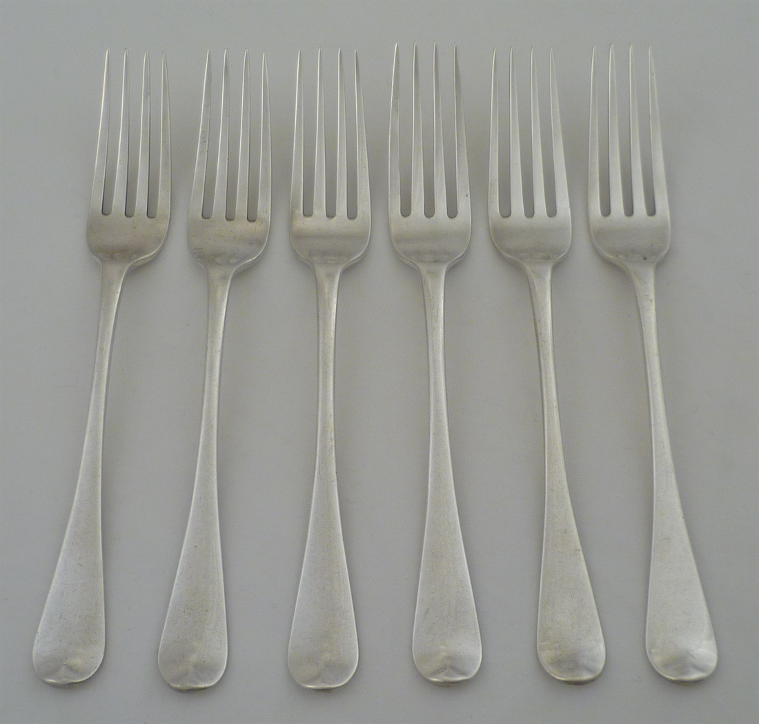 DESCRIPTION | Very good set of six William IV solid silver Old English pattern dessert or salad forks with no engraving or erasure. |