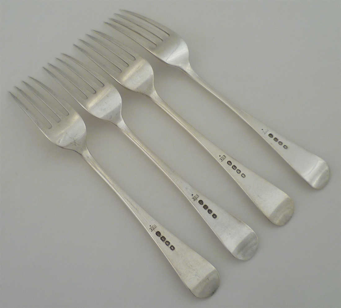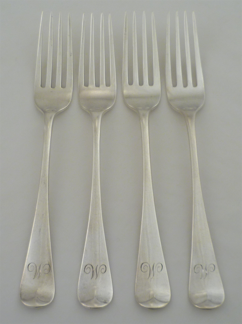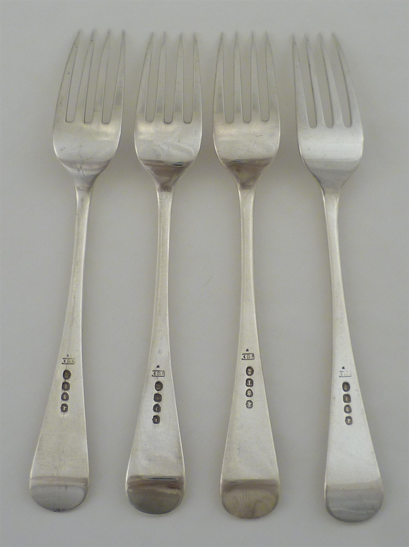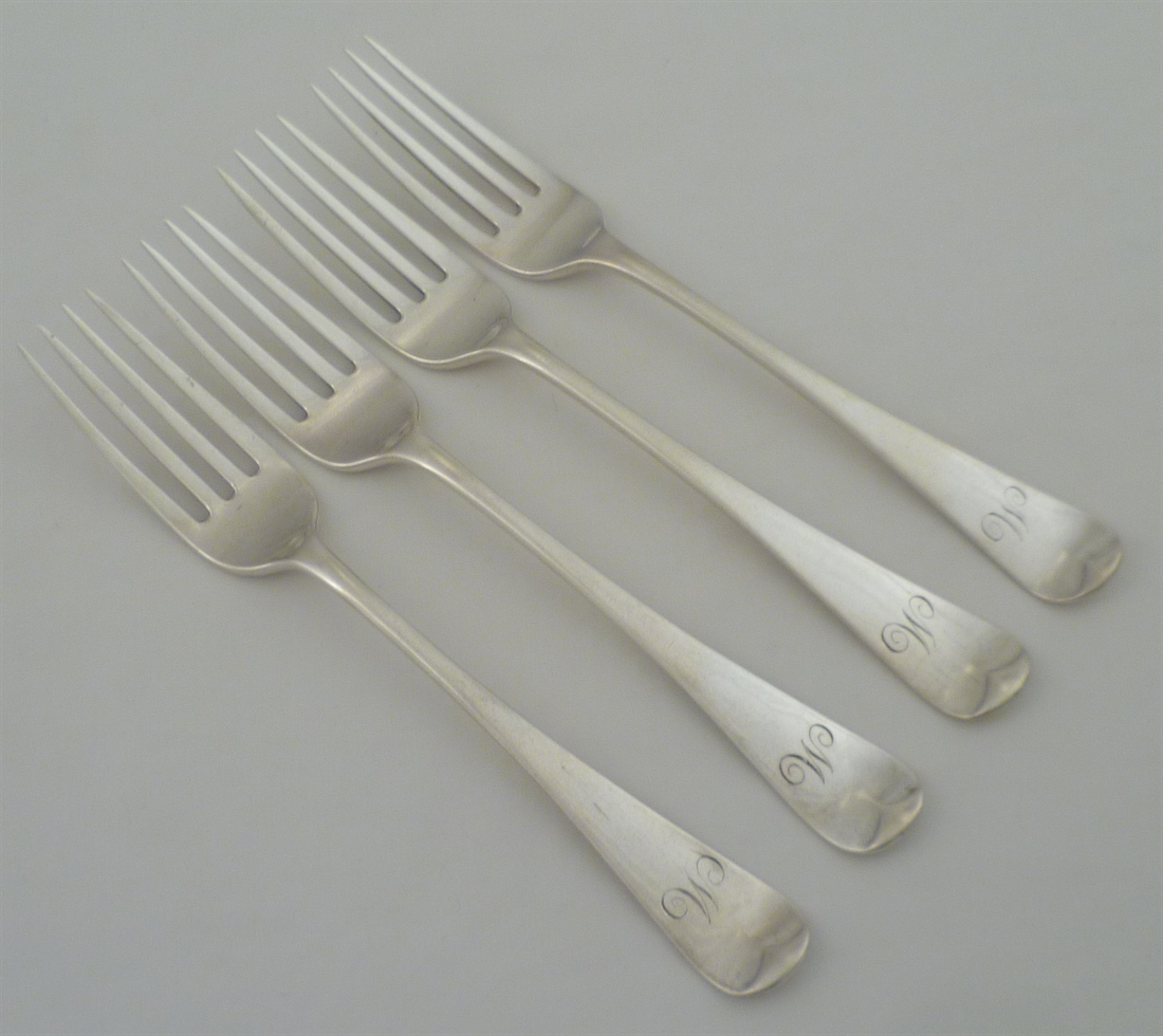 DESCRIPTION | Good set of four Georgian solid silver Old English pattern table forks with frontal initial engraving. |