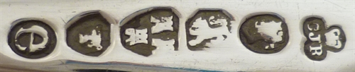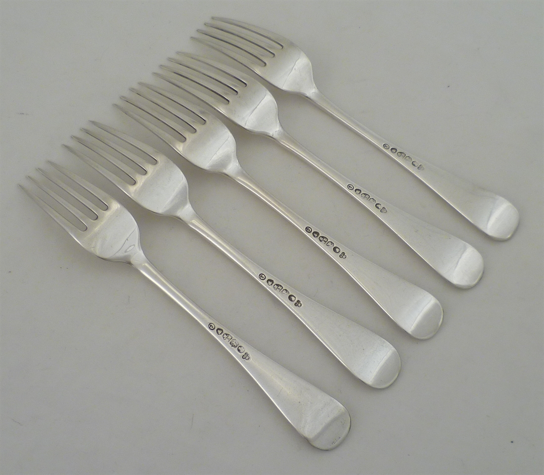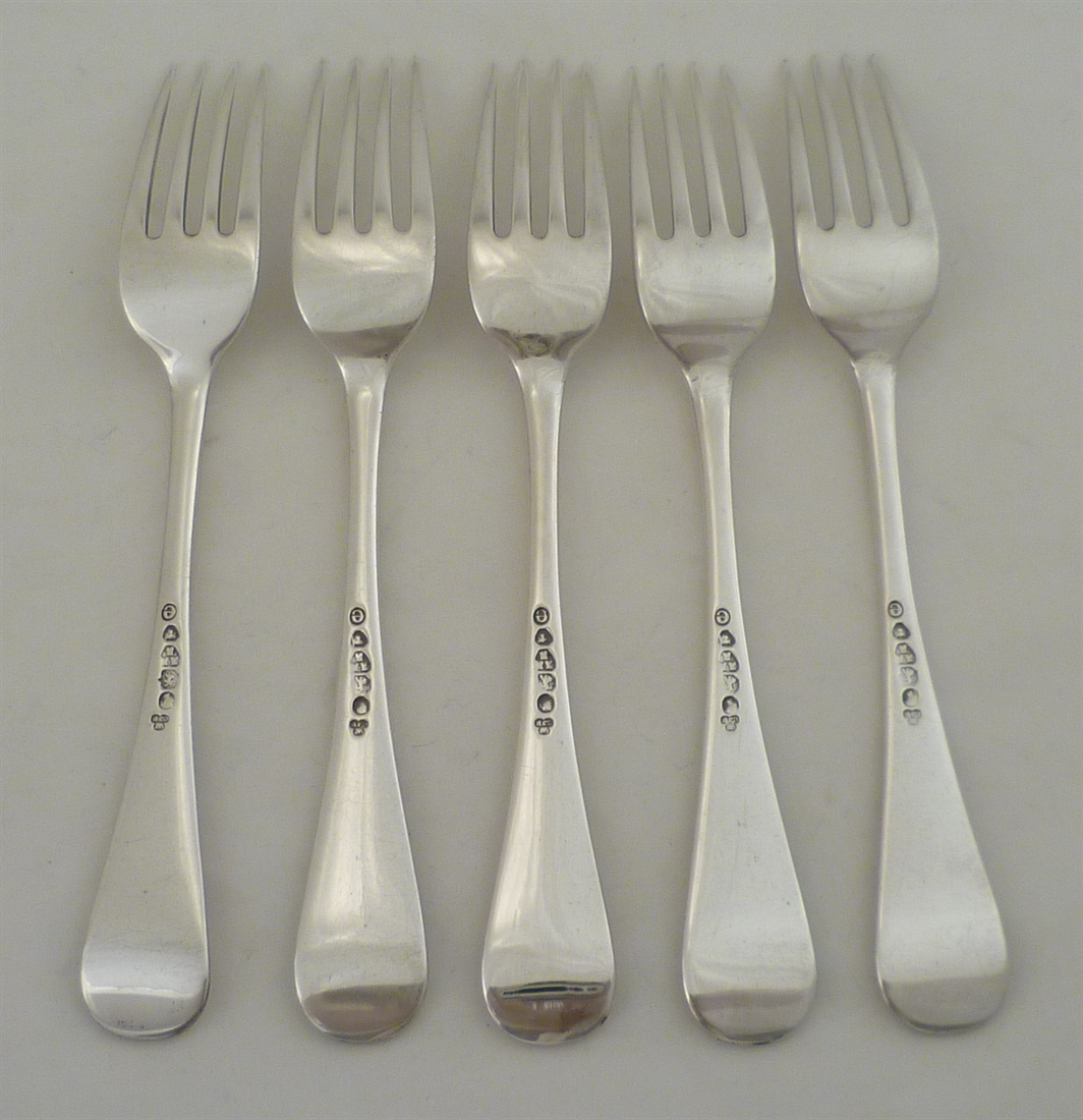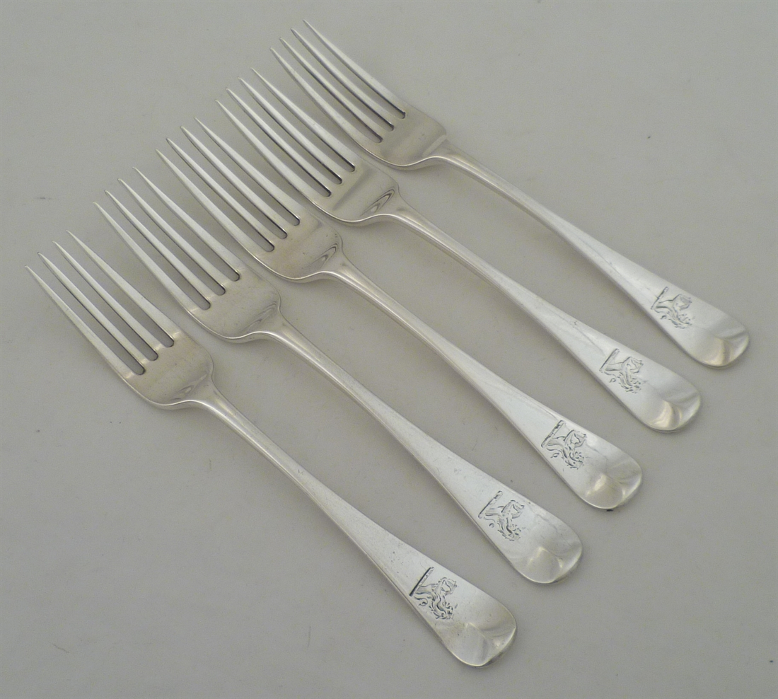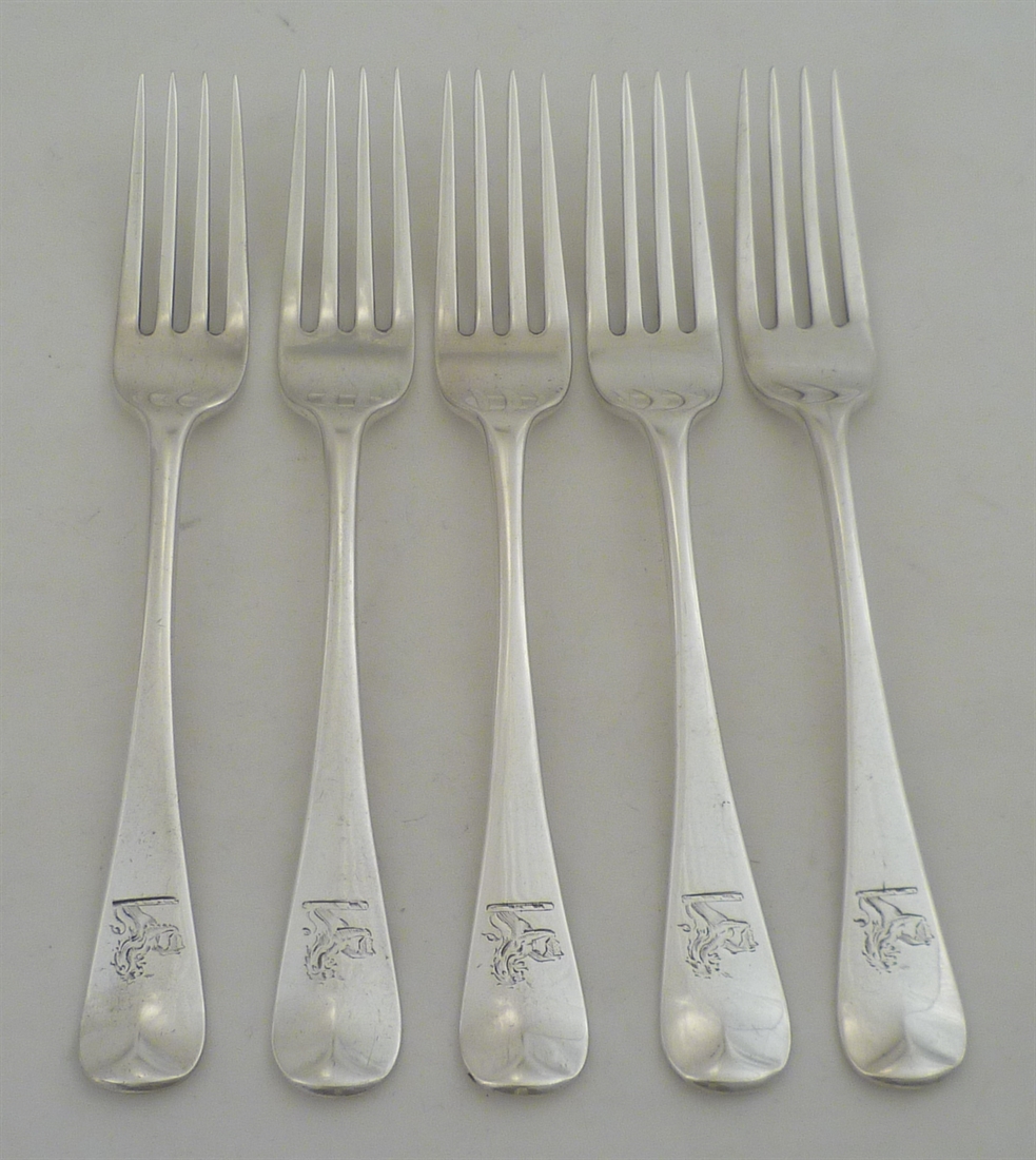 DESCRIPTION | Set of five Victorian solid silver Old English pattern dessert or salad forks with frontal crest engraving. |