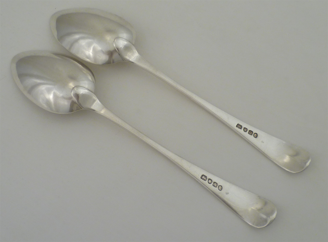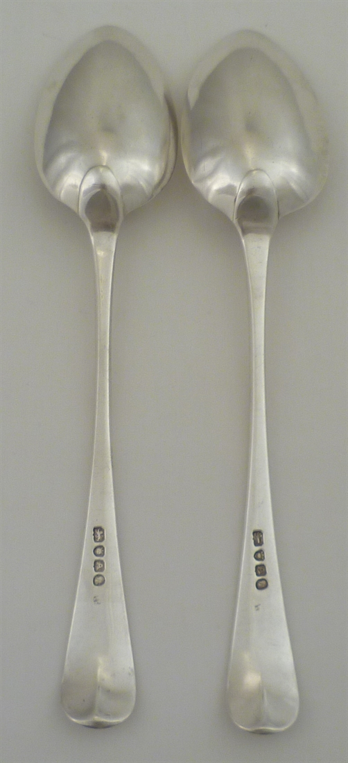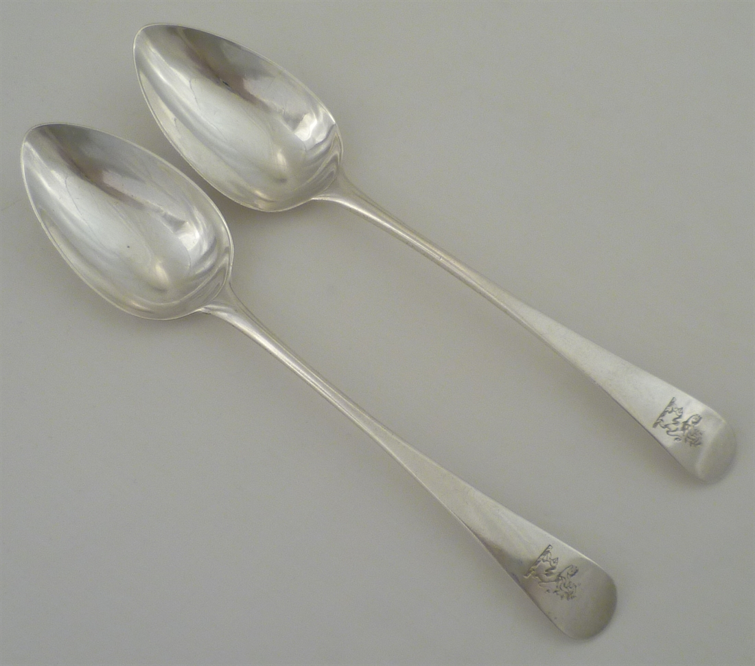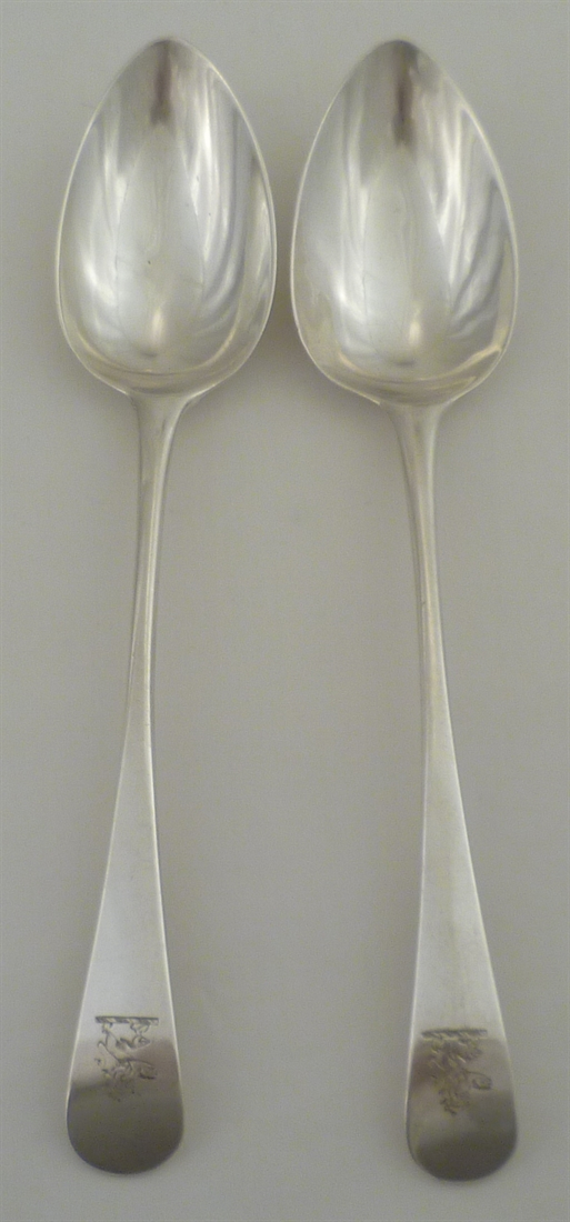 DESCRIPTION | Pair of Georgian solid sterling silver Old English pattern table spoons with a good frontal crest engraving. |
