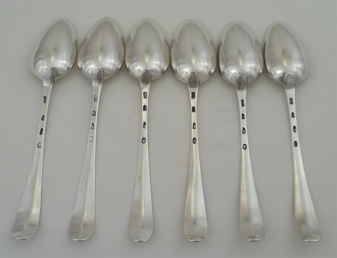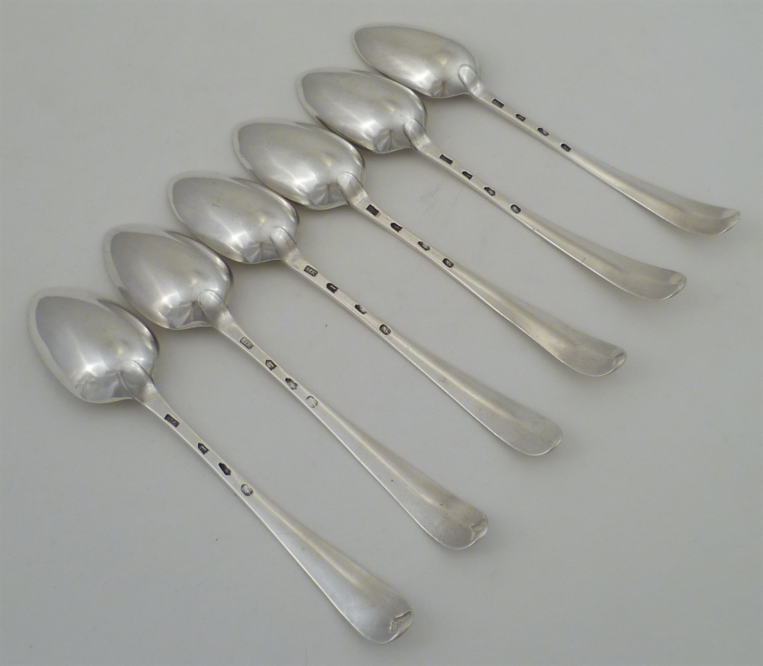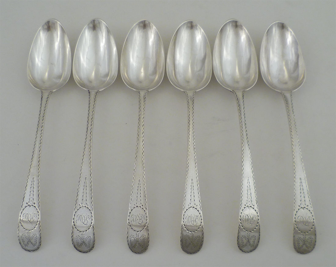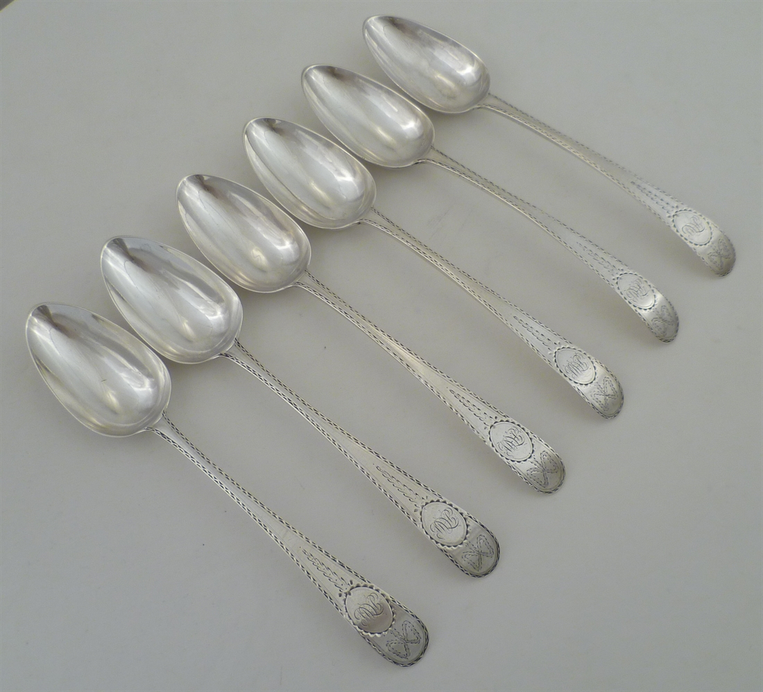 DESCRIPTION | Superb set of six Irish Georgian solid silver bright cut Old English pattern table spoons with frontal monogram engraving and wonderful hallmarks. |