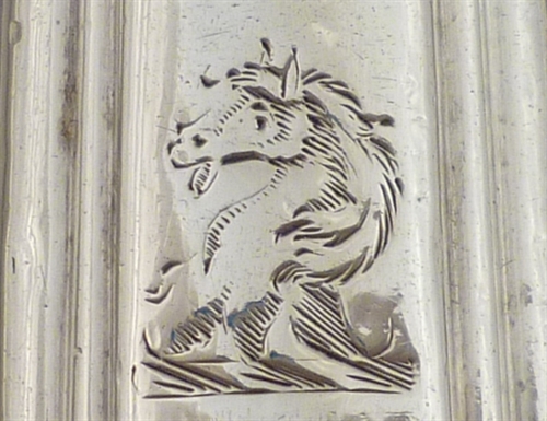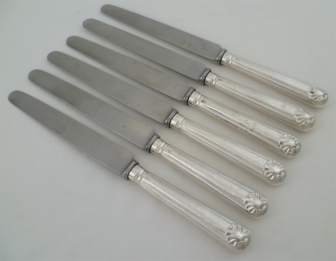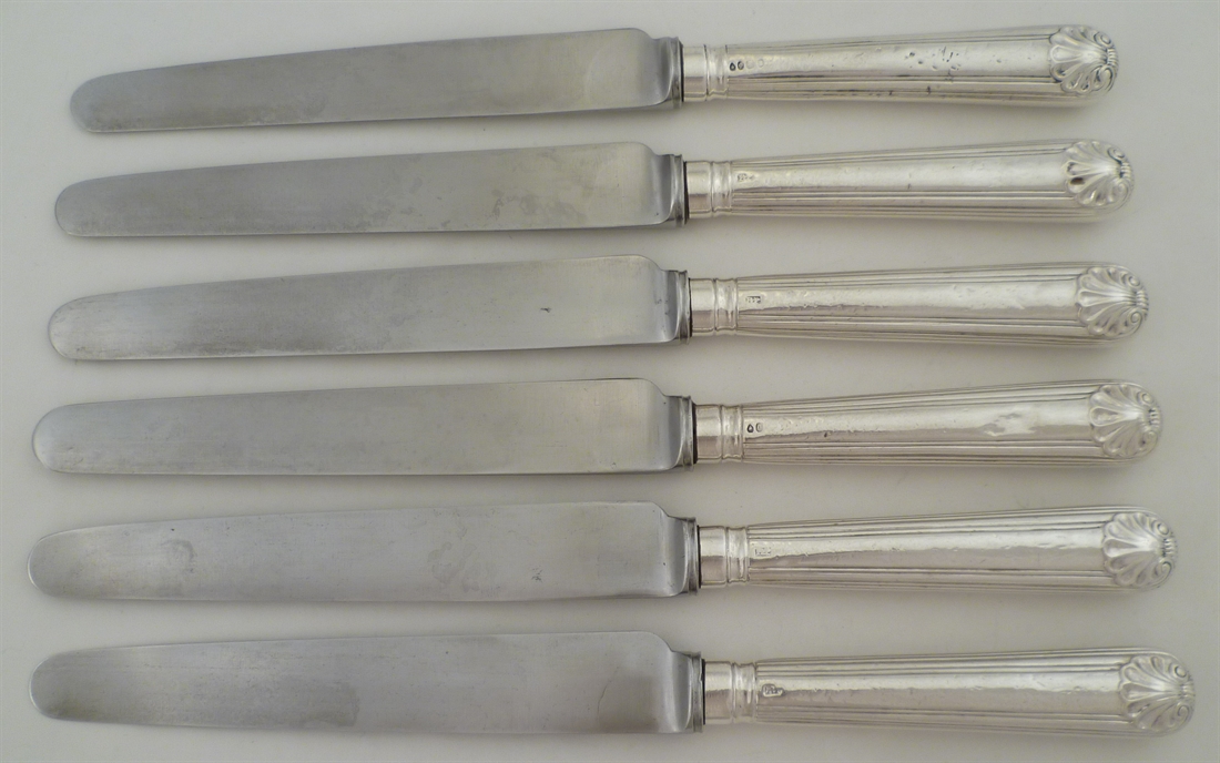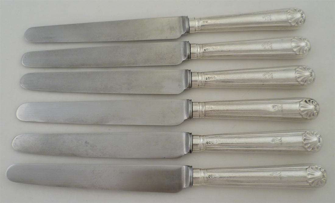 DESCRIPTION | Scarce set of six large Georgian silver handled Old English Double Thread & Shell pattern table knives with a crest engraving to one side and long, tapering old steel blades. The traditional pitch loaded handles should not be cleaned in a dishwasher or very hot water. Beware, old steel will take and hold a much sharper edge than modern stainless steel. I think these are just about right as they are at the moment. |