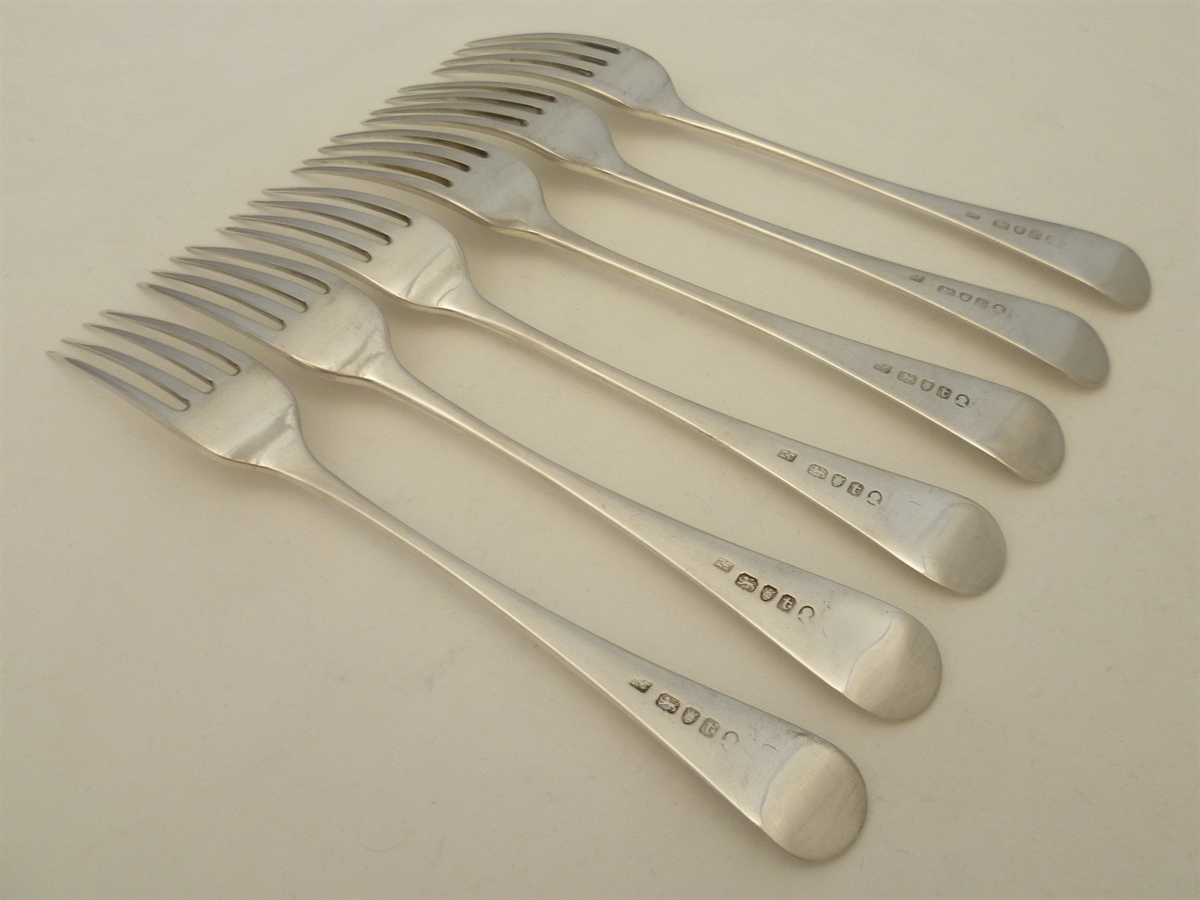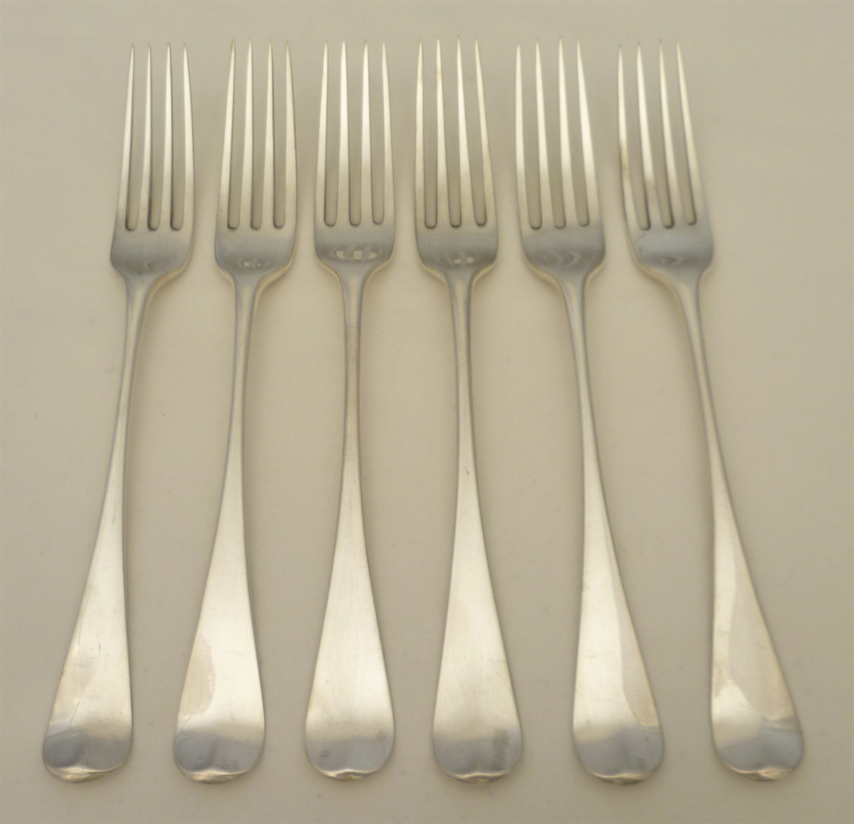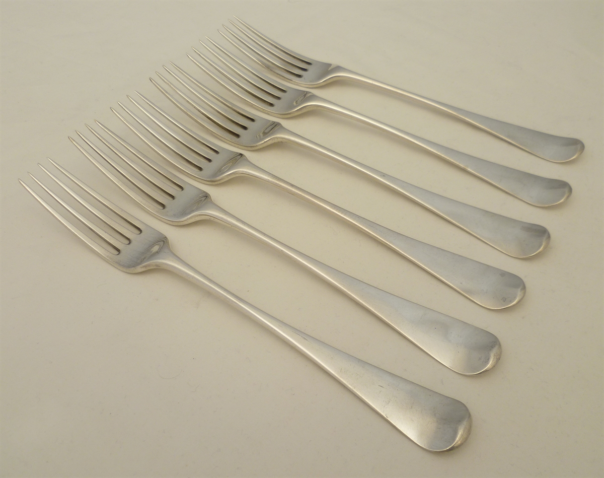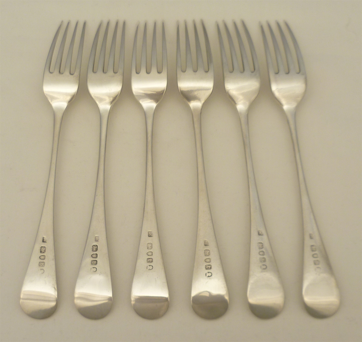 DESCRIPTION | Astonishingly scarce set of six Georgian solid sterling silver Old English pattern table forks with long and level tines and no engraving. |
