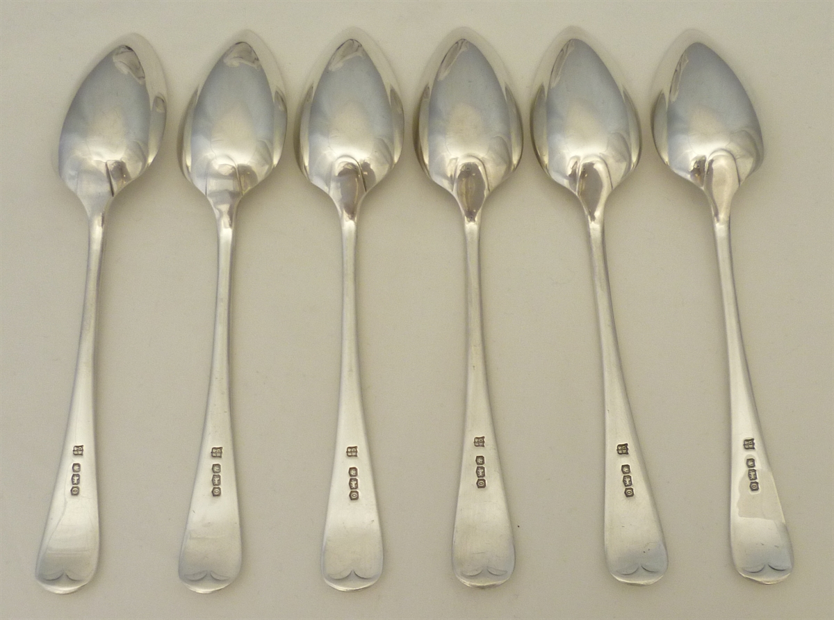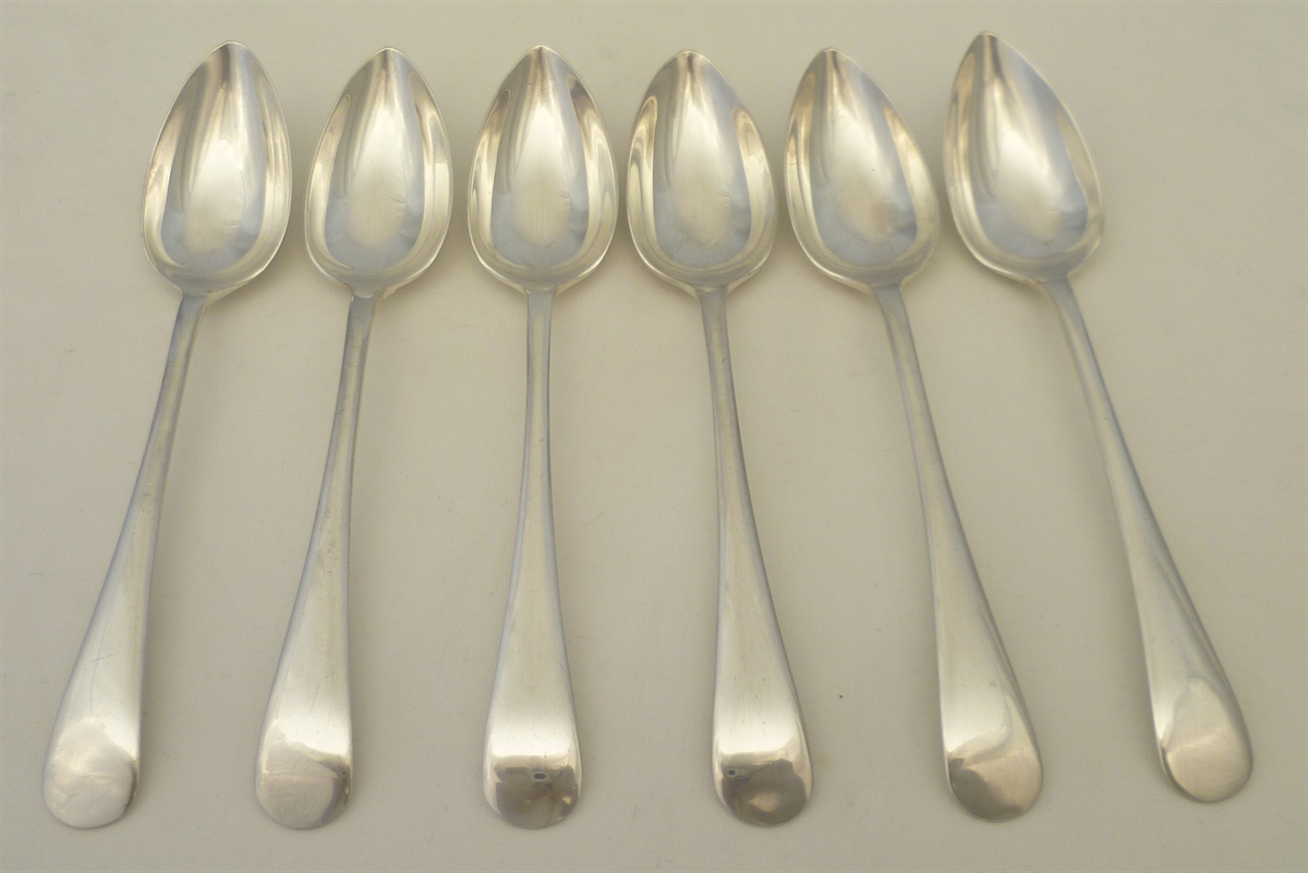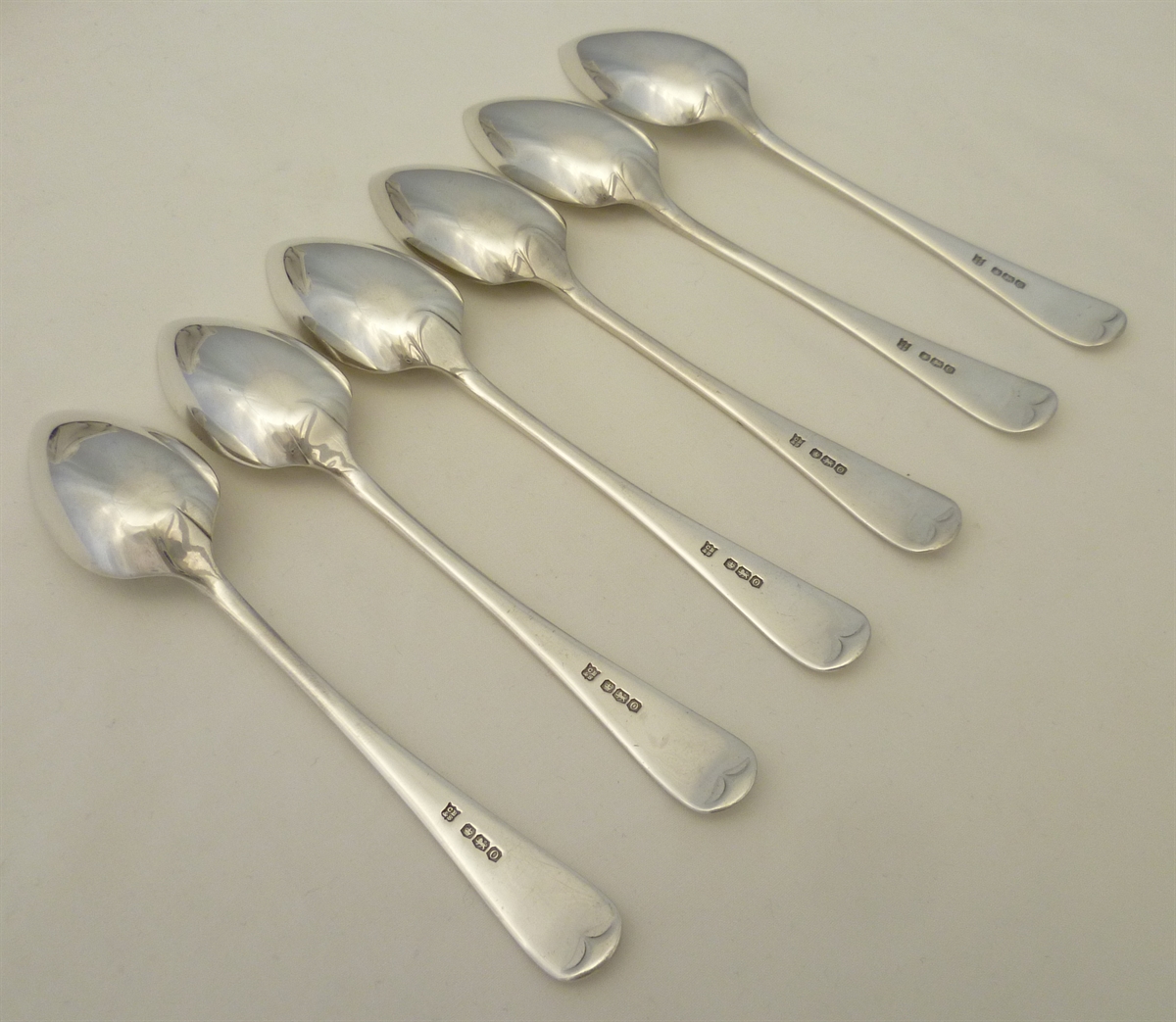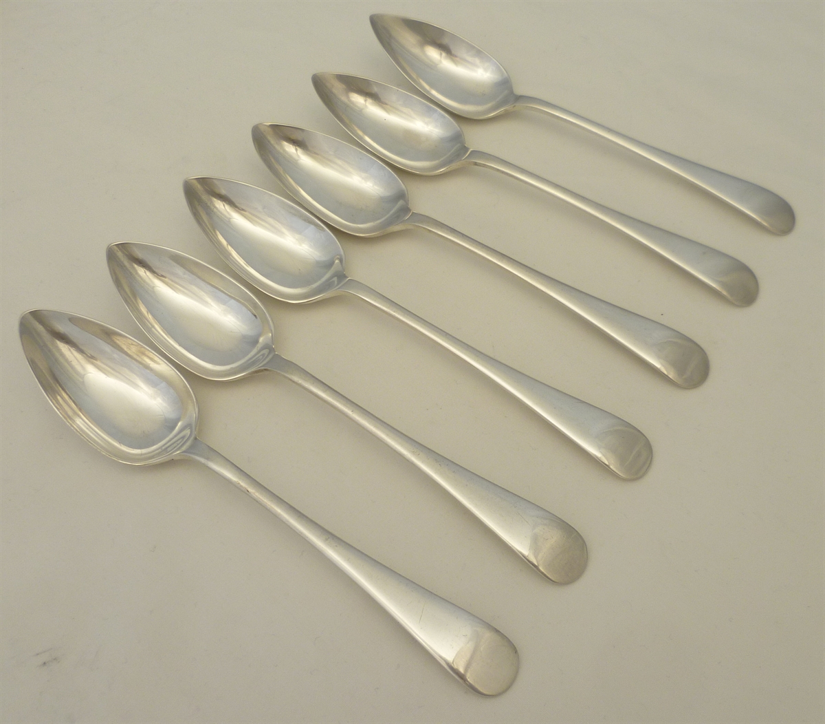 DESCRIPTION | Set of six solid sterling silver Old English pattern spoons with pointed bowls. Originally marketed as grapefruit spoons, today these items are mostly used for ice cream and sorbet. The original ice cream spoons were more like spades and used for handmade iced cream. Modern production methods and refrigeration produces a much harder ice cream best attacked with a pointed bowl. |