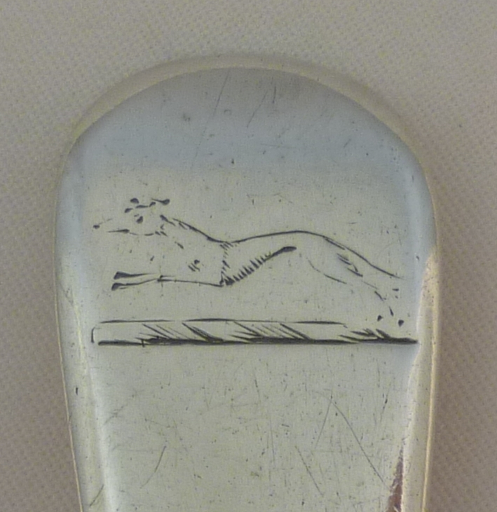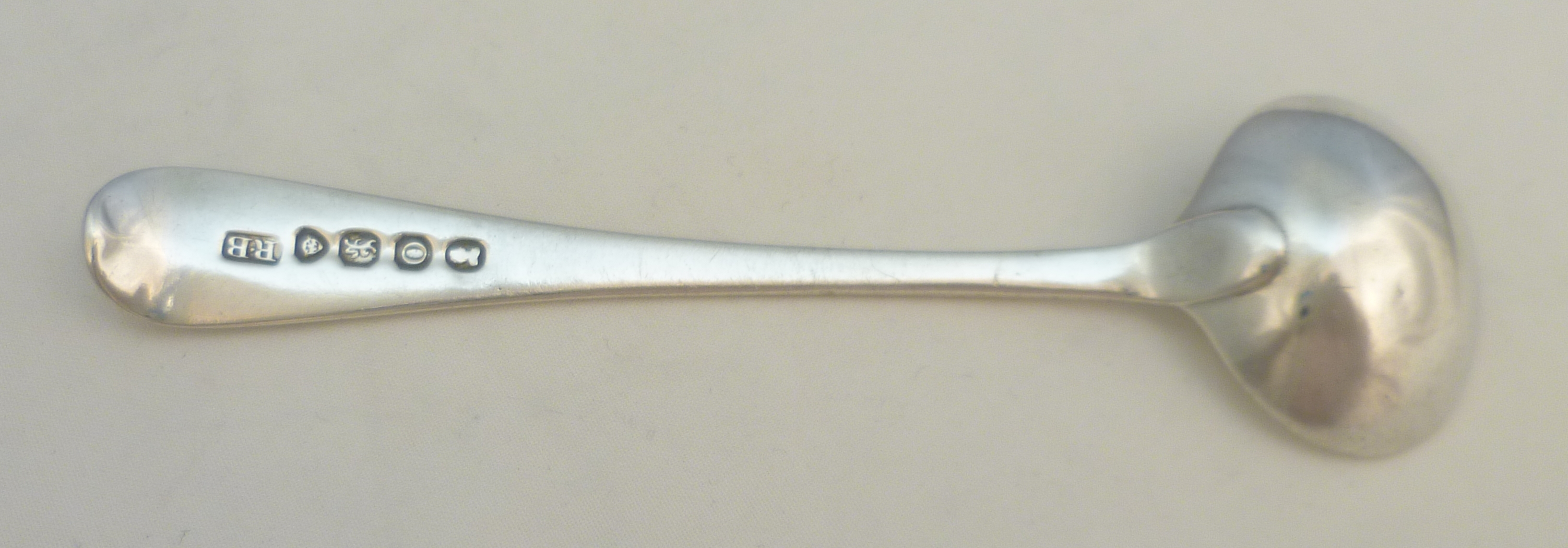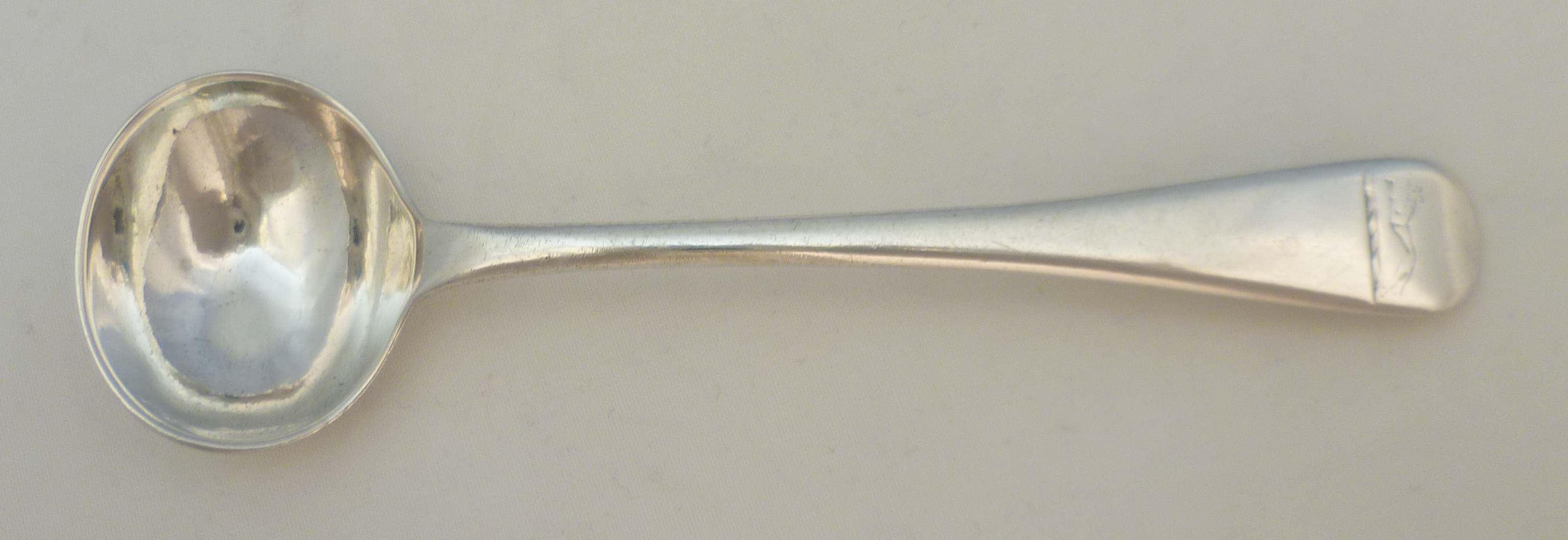 DESCRIPTION | Big Georgian solid sterling silver Old English pattern salt spoon with a frontal crest engraving. |