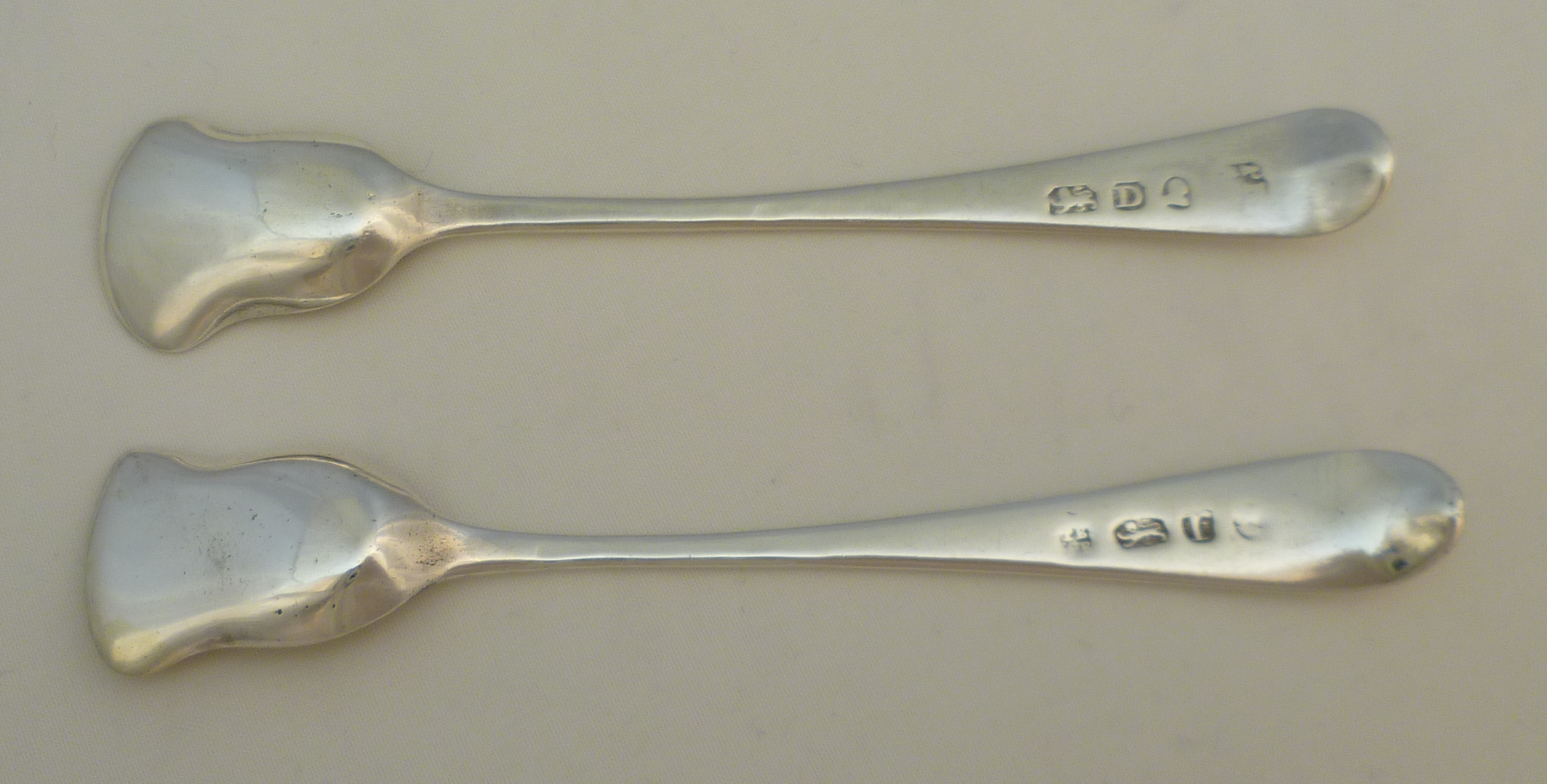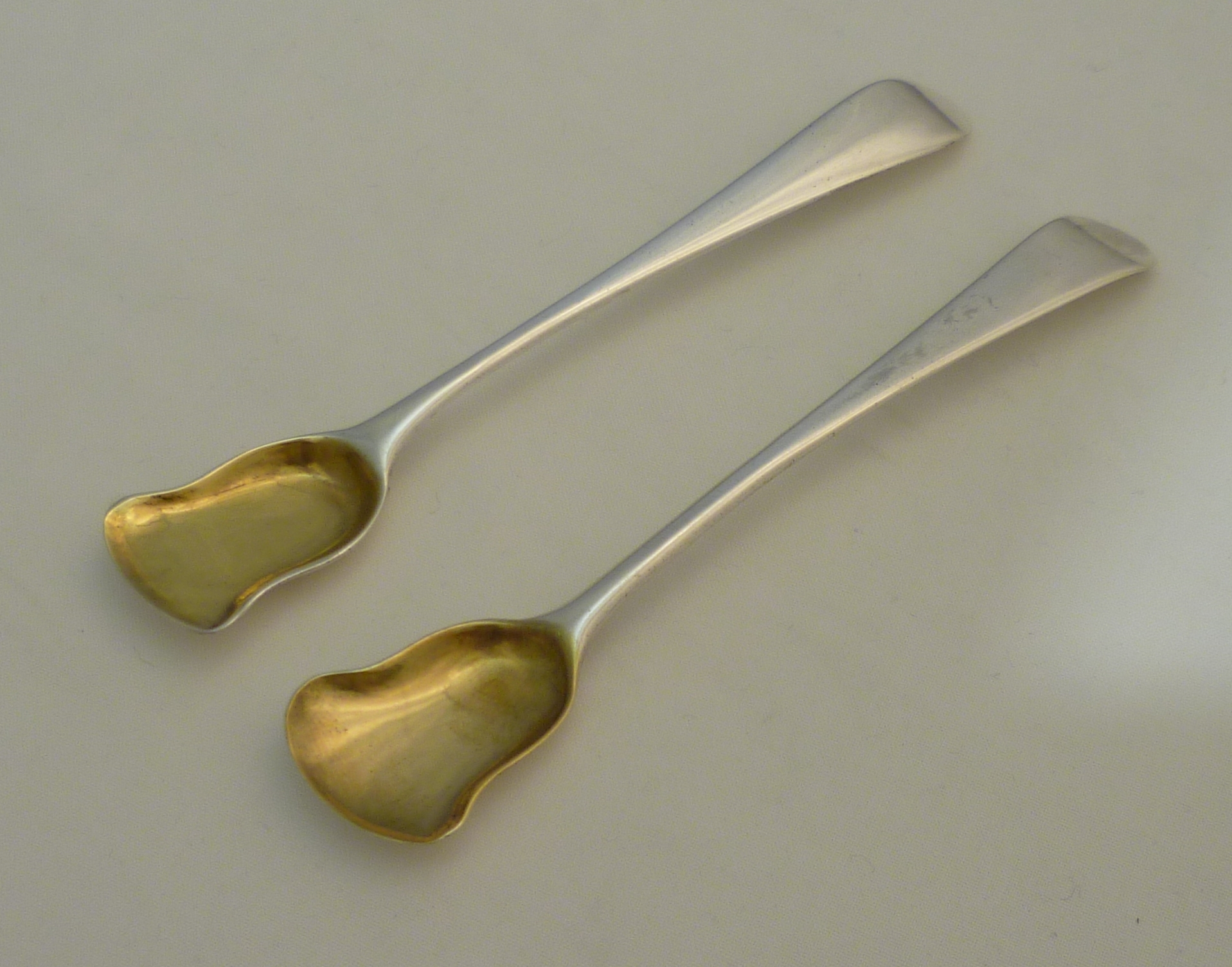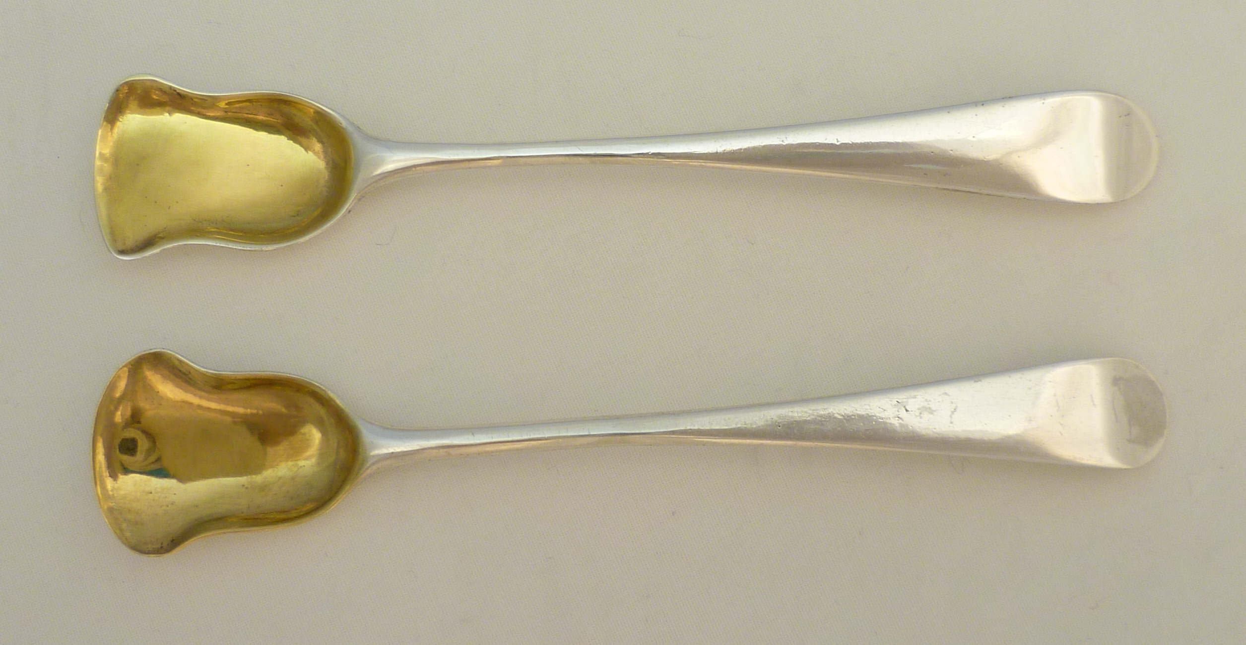 DESCRIPTION | Two near identical Georgian solid sterling silver Old English pattern spoon salt shovels with gilded bowls and no engraving. |