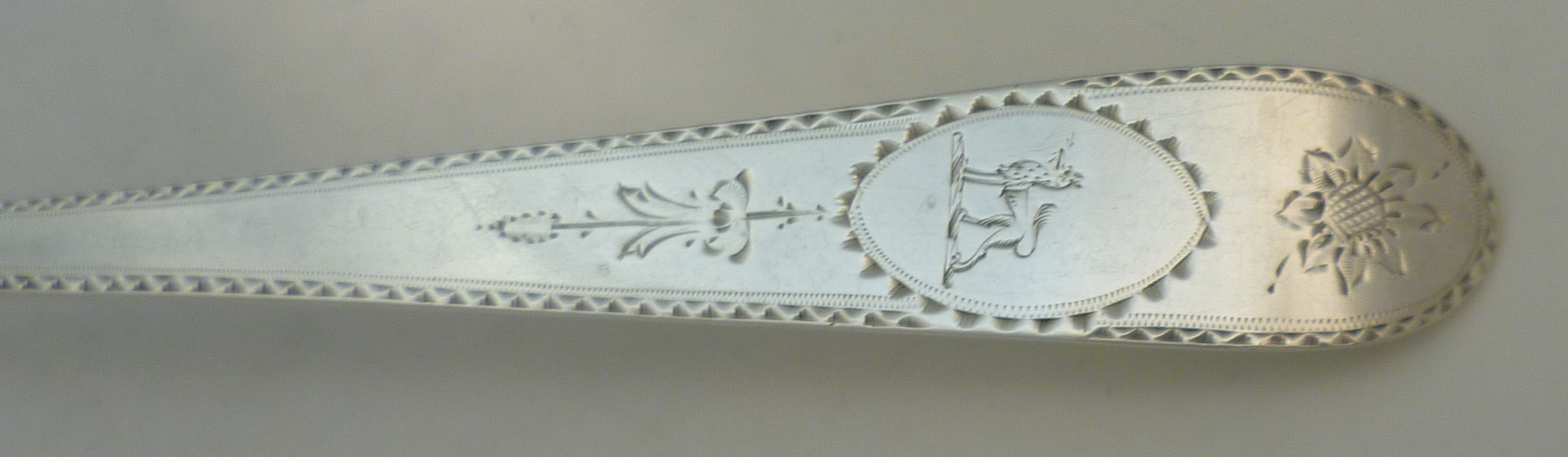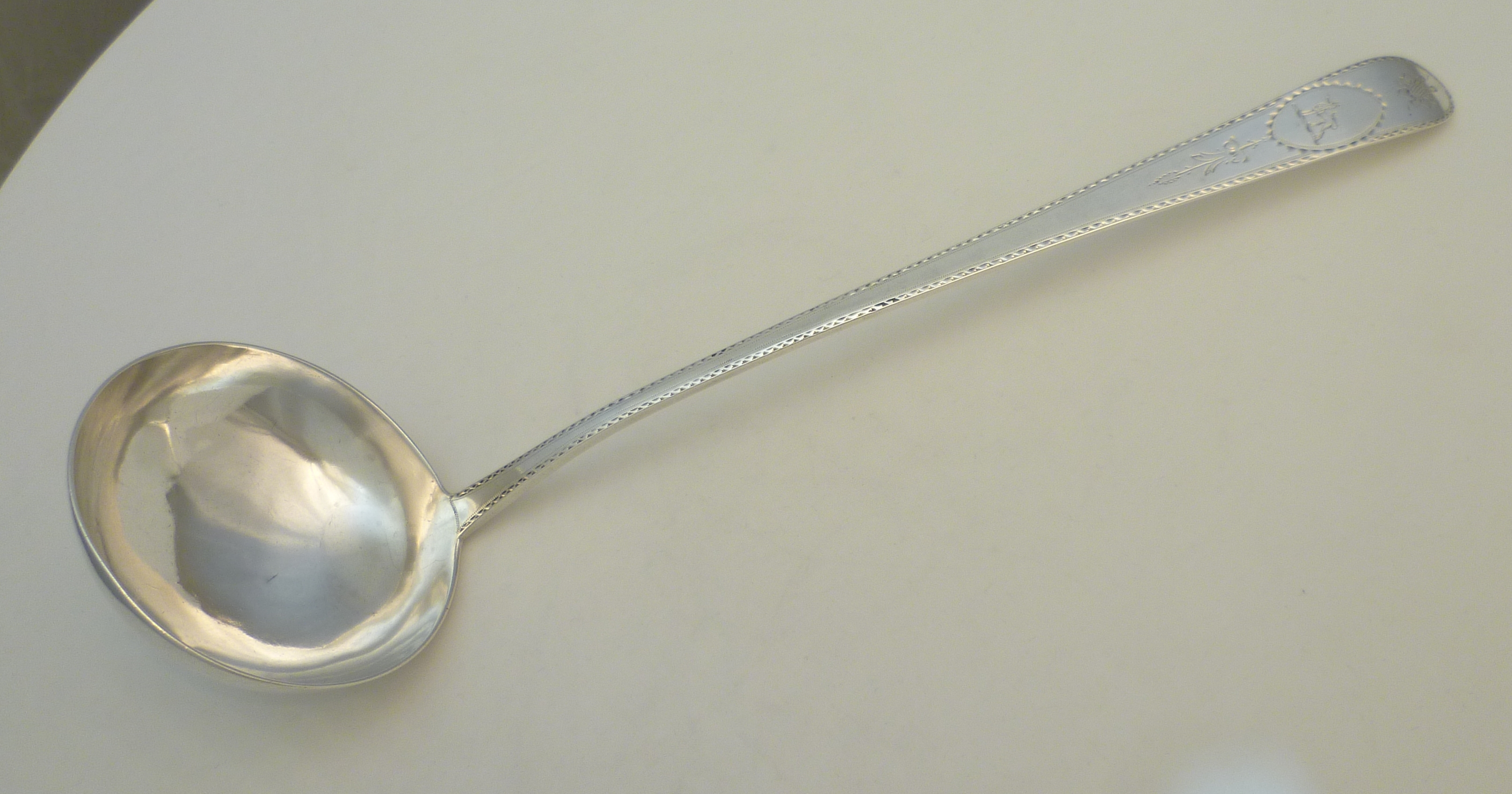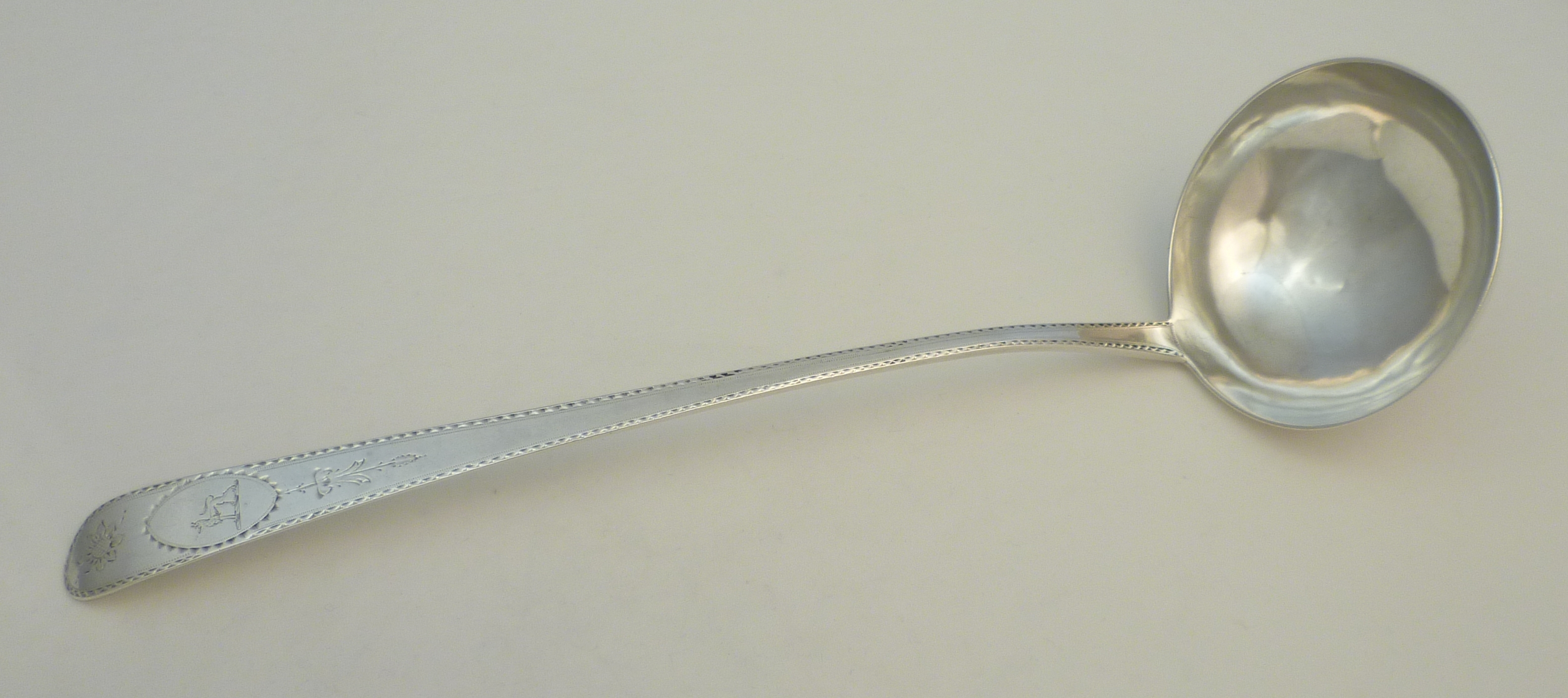 Good Quality Irish Georgian solid sterling silver Bright-cut Old English Flower Head pattern soup ladle with a