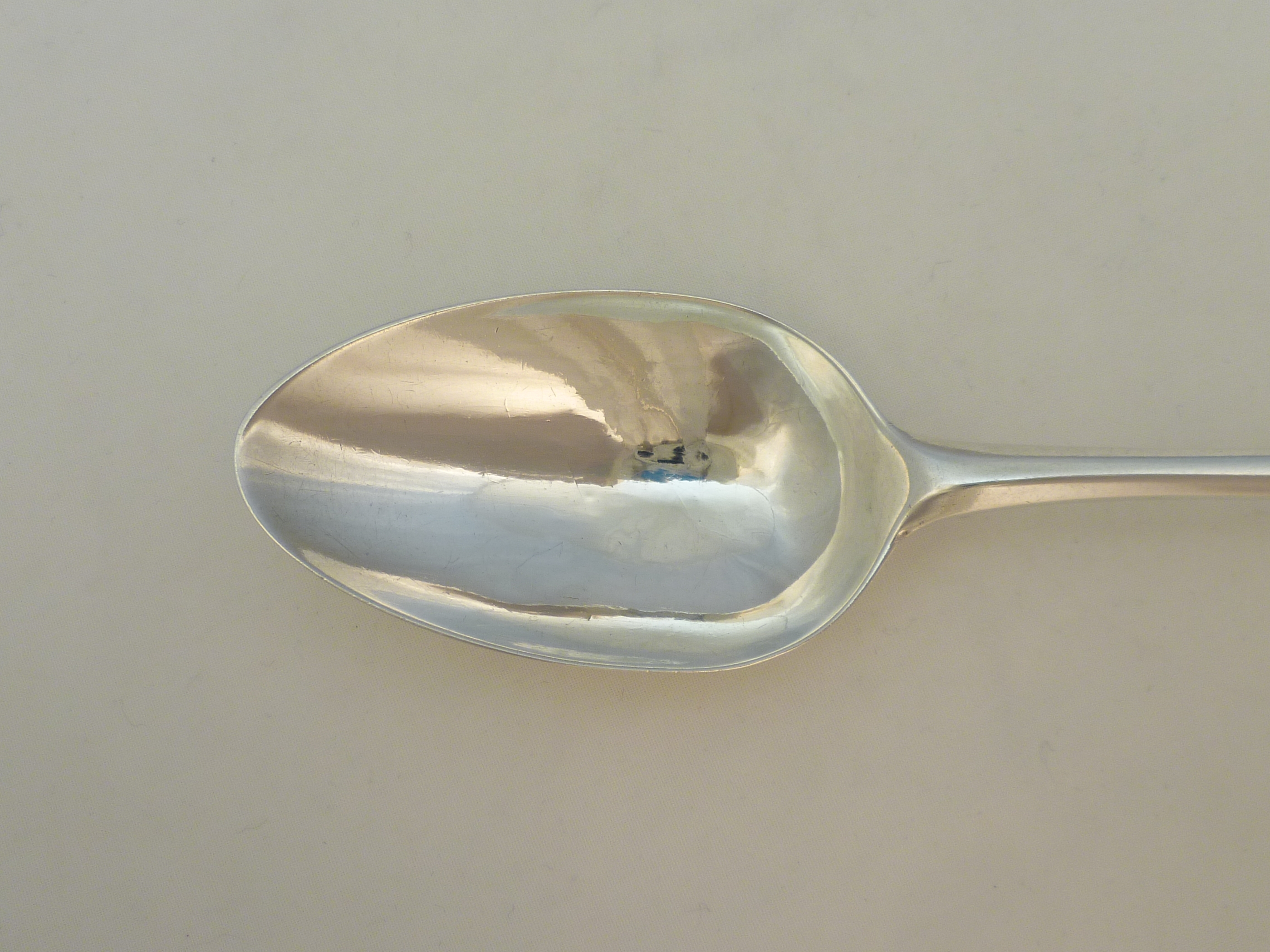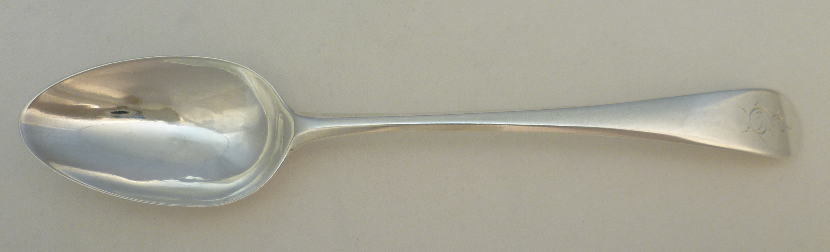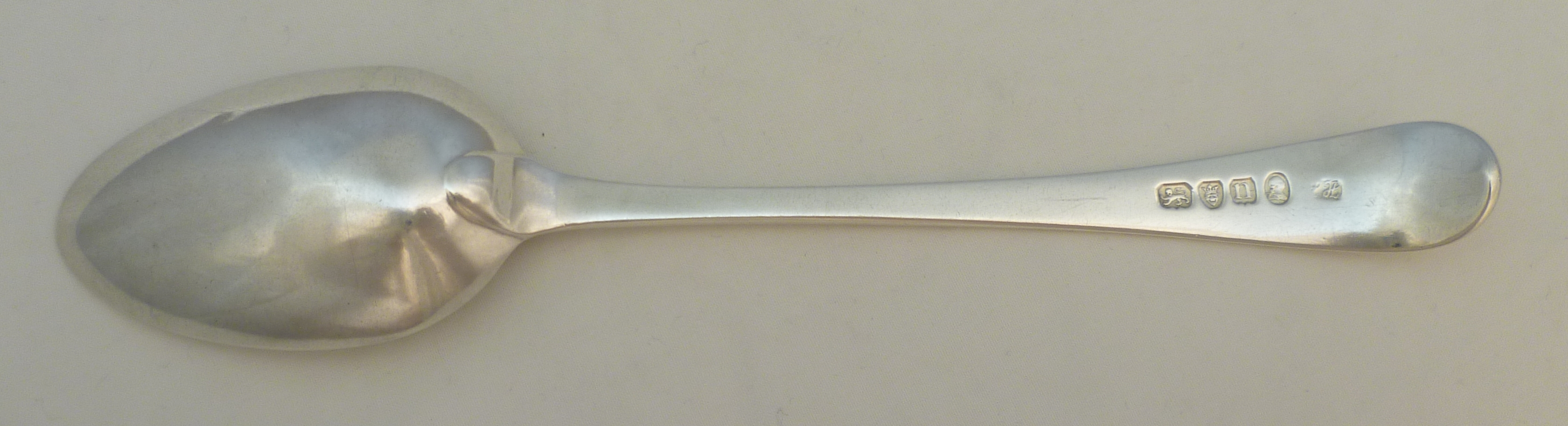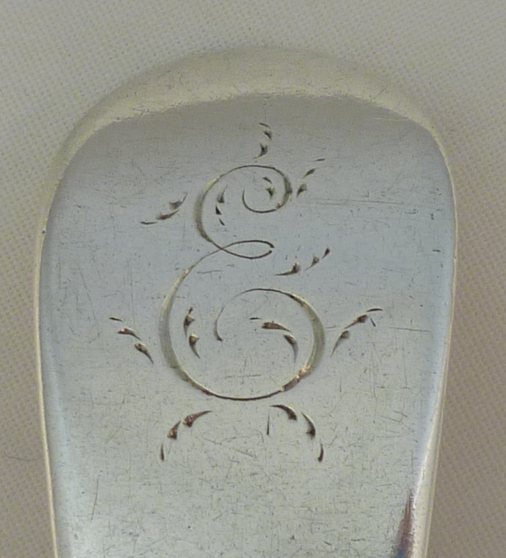 DESCRIPTION | Good Georgian solid sterling silver Old English pattern dessert spoon with the original frontal initial 'E' engraving. Single drop to the bowl and of average proportions throughout. Well struck top marks except for the 'B' of 'HB' that is now and only ever was a partial due to the curve of the terminal. |