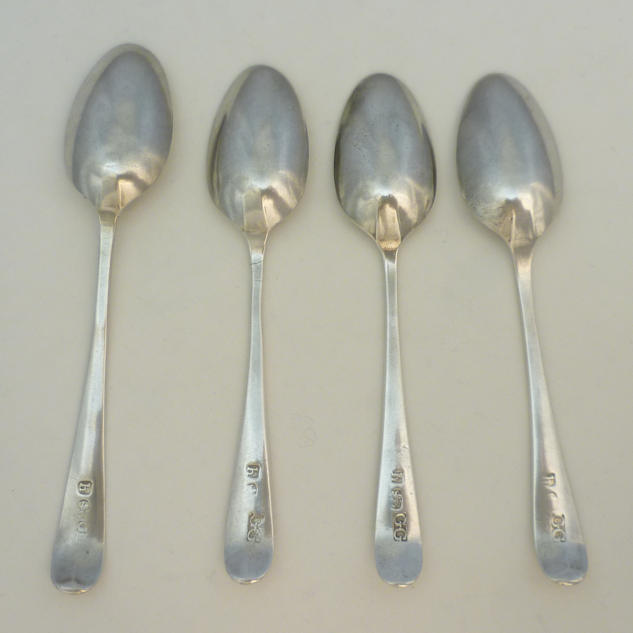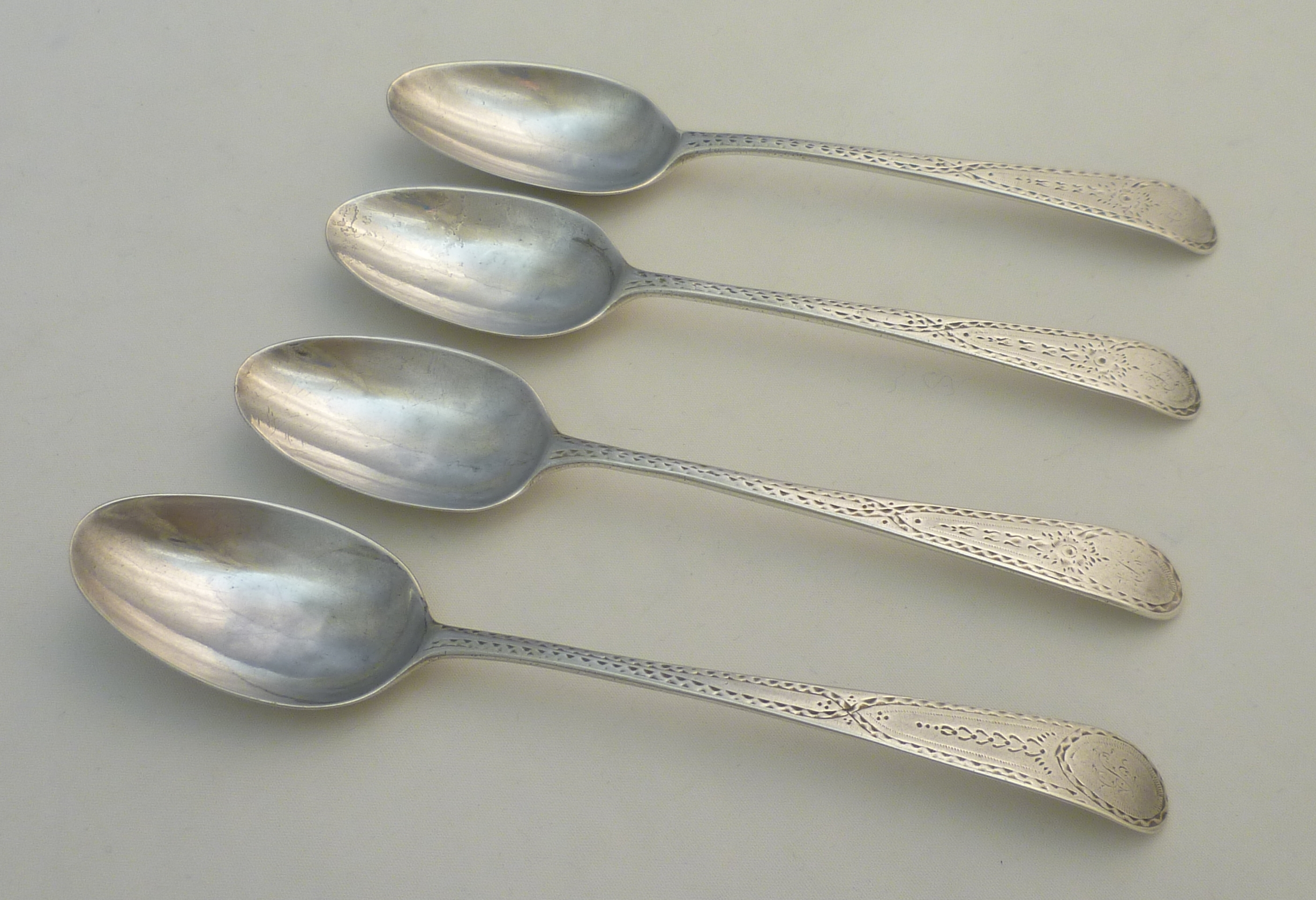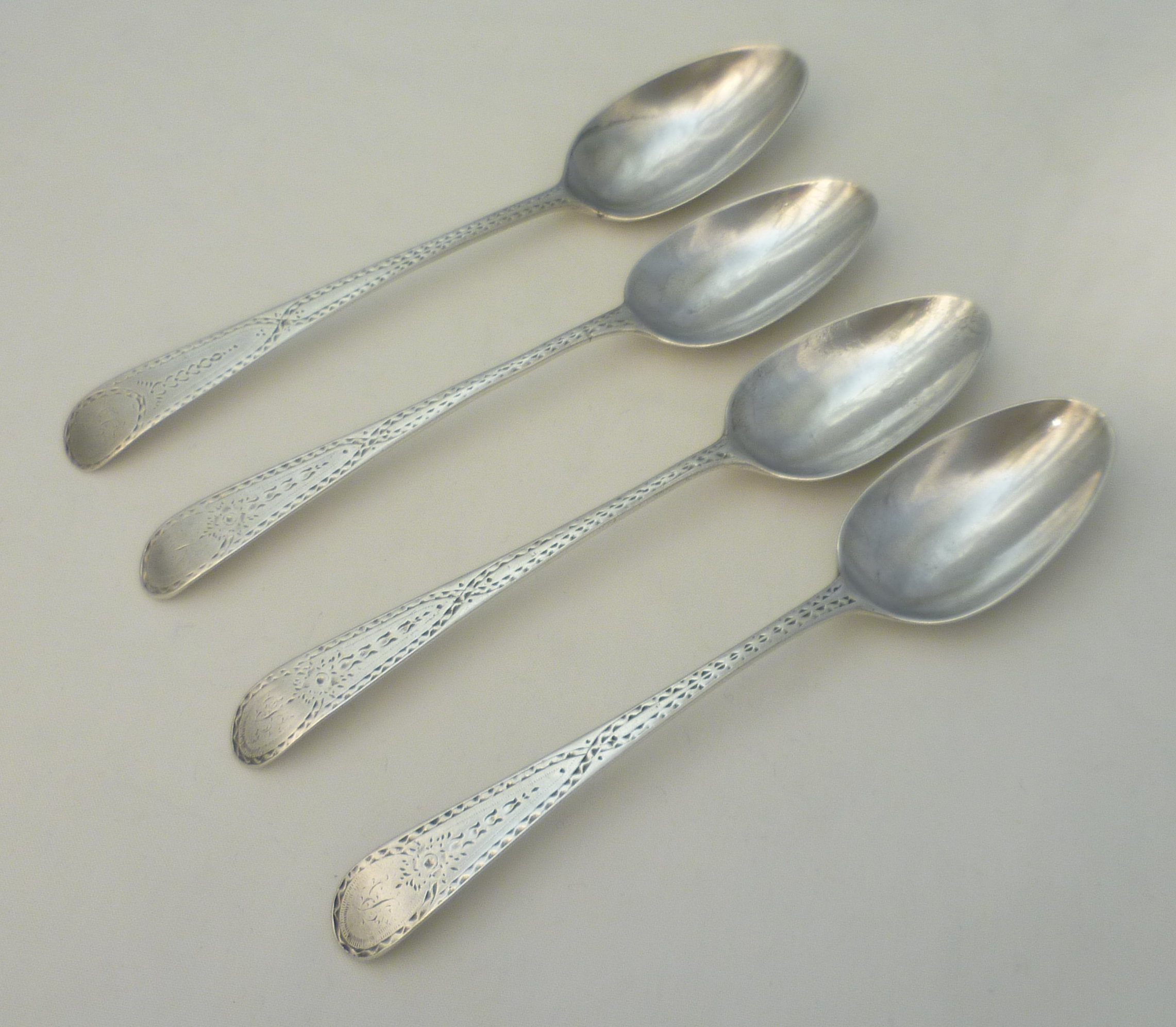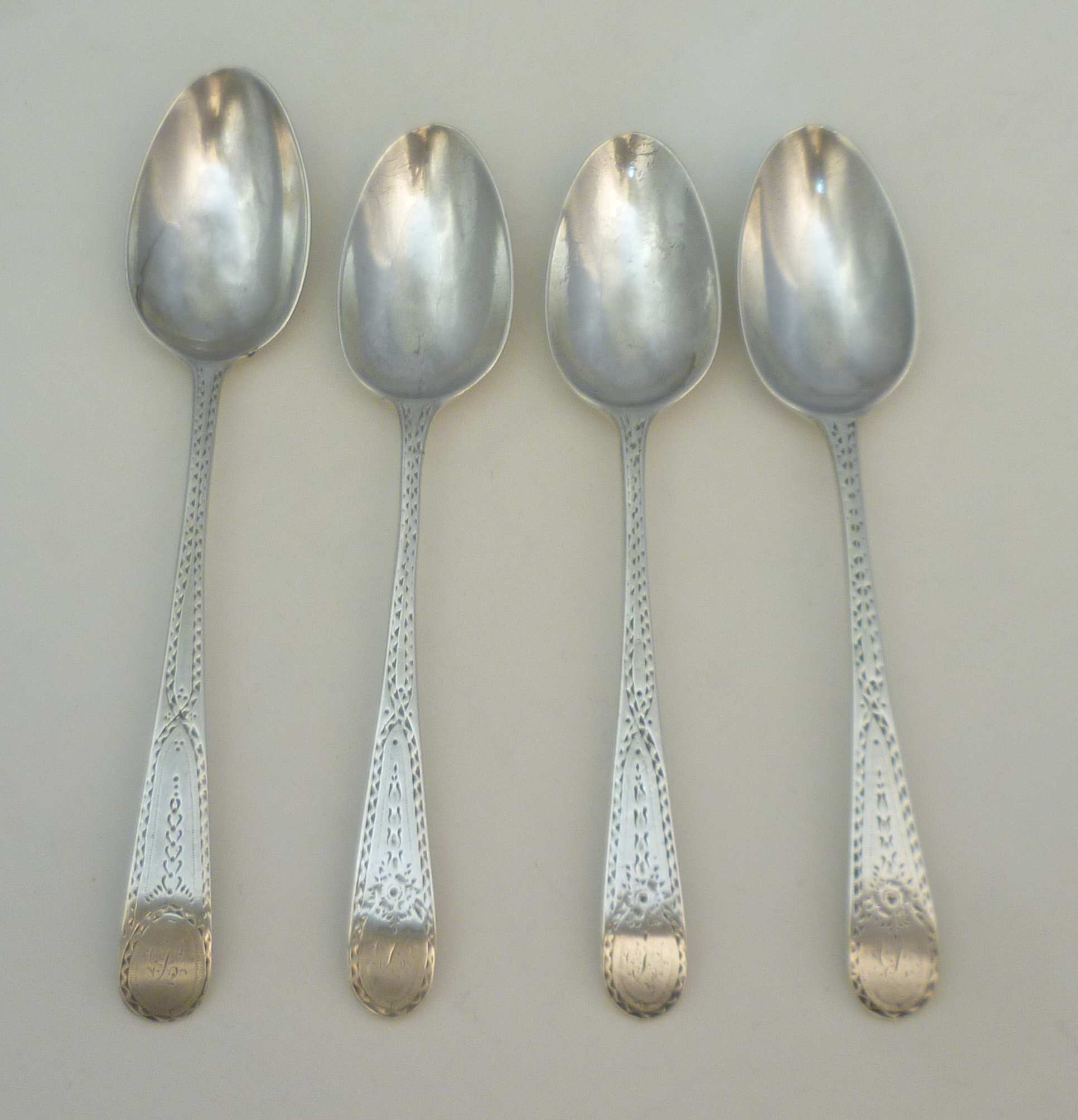 DESCRIPTION | Four (3+1) Georgian solid sterling silver bright-cut Old English pattern spoons with a frontal monogram engraving. |
