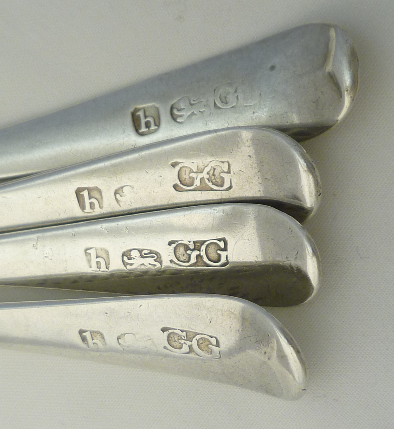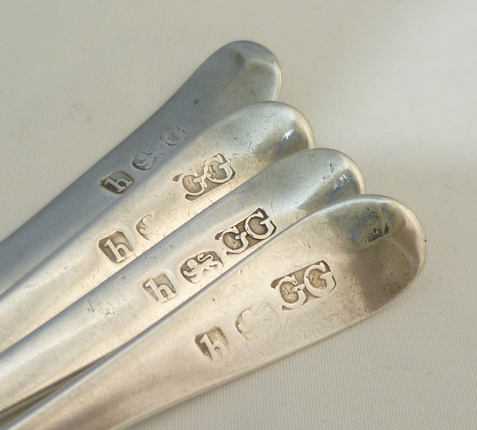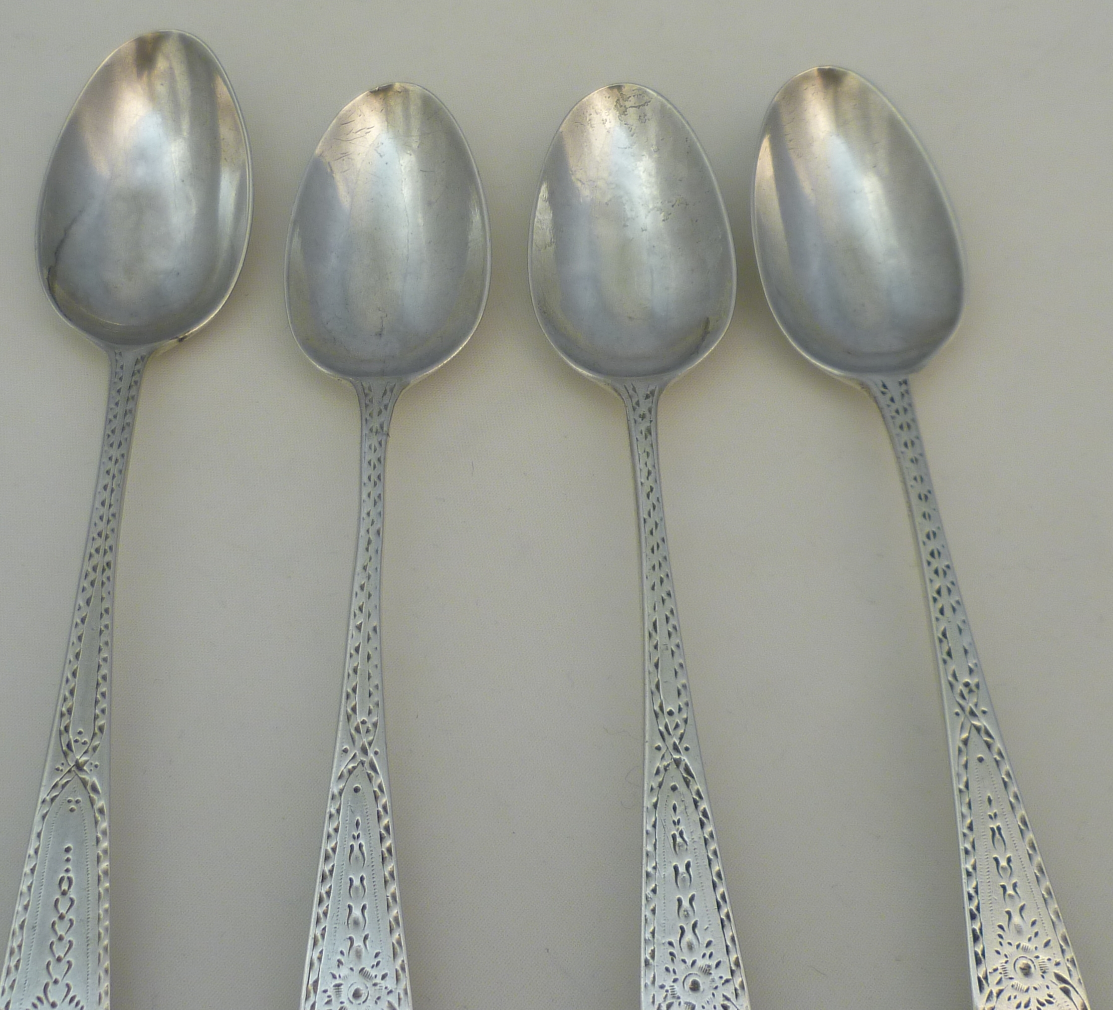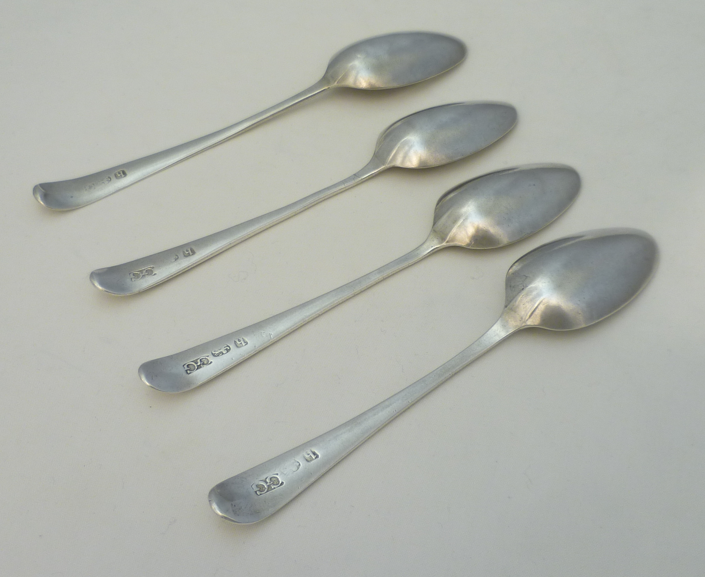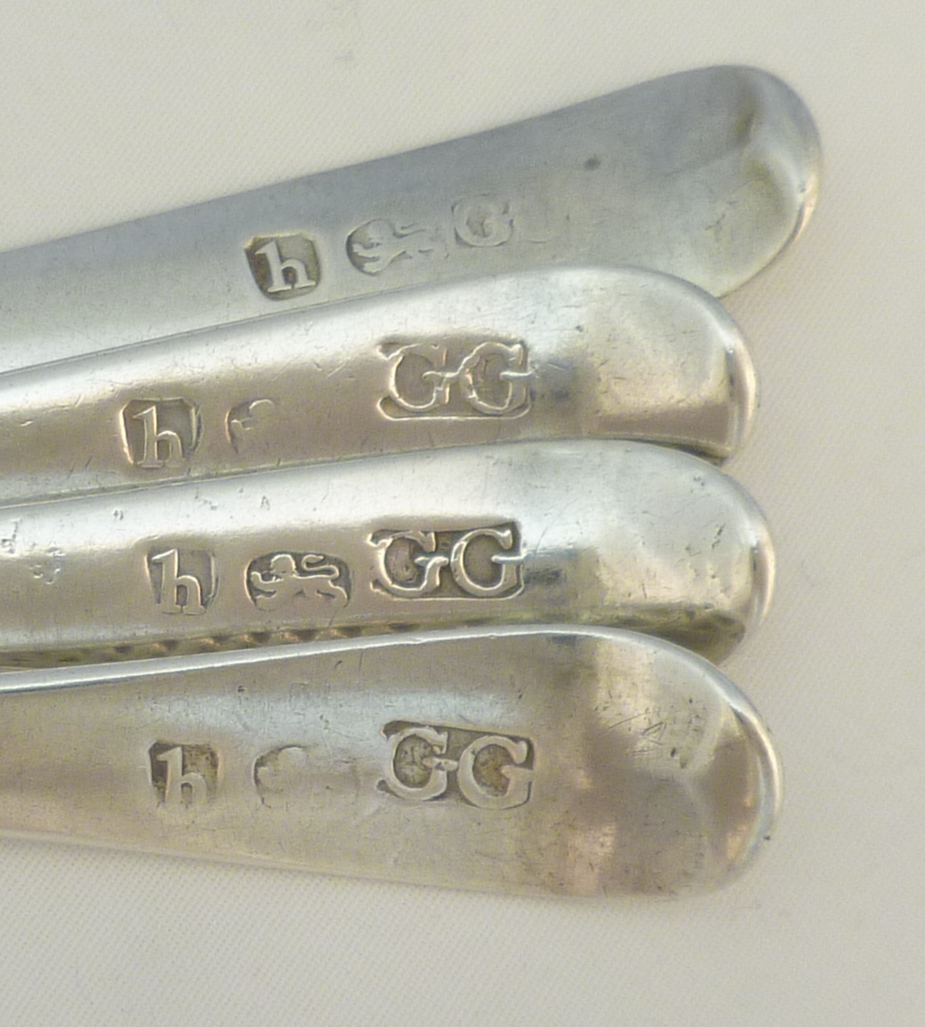 DESCRIPTION | Four (3+1) Georgian solid sterling silver bright-cut Old English pattern spoons with a frontal monogram engraving. |