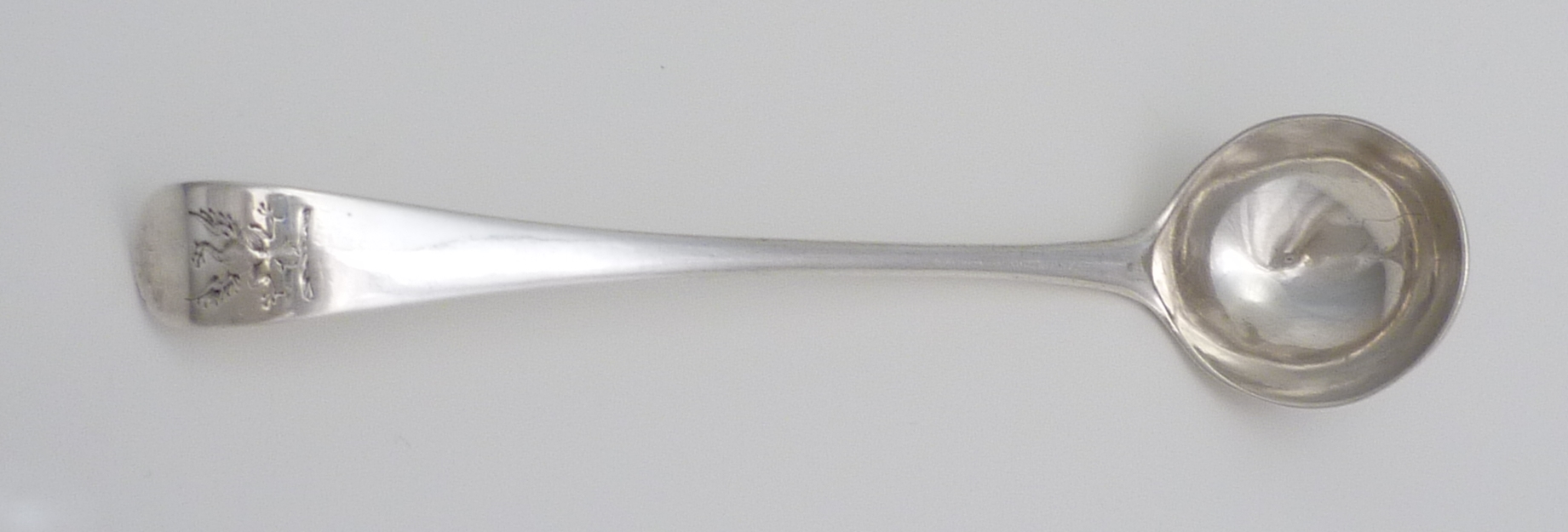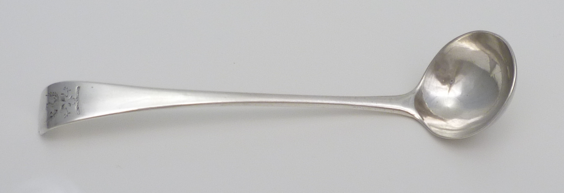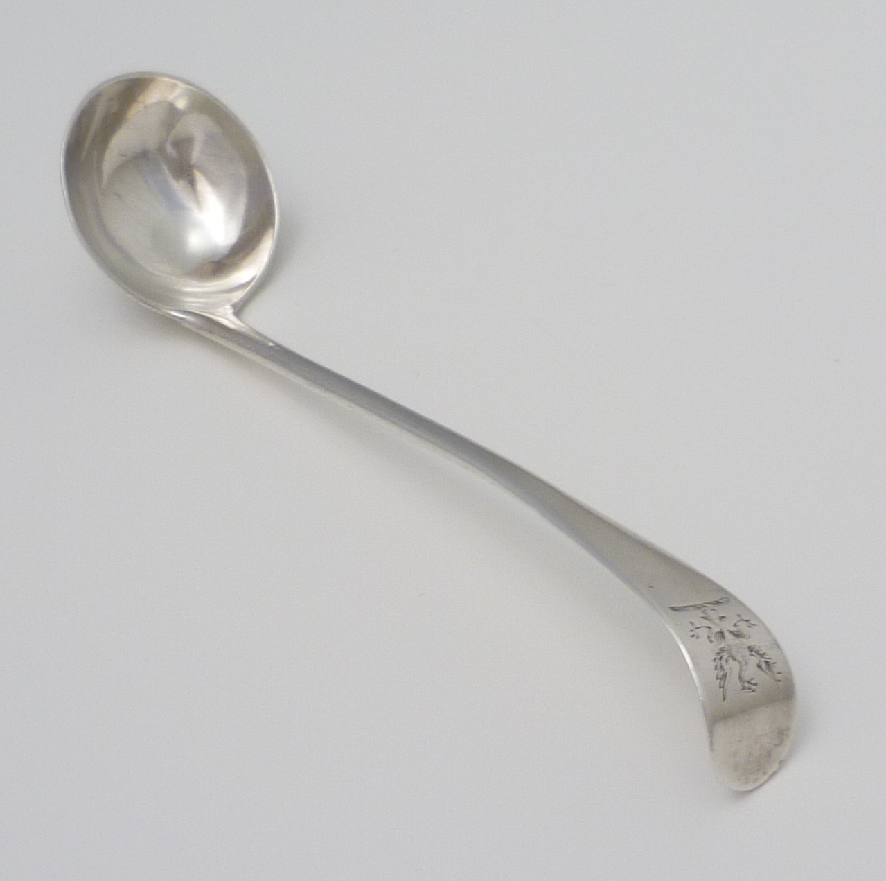 DESCRIPTION | Georgian solid sterling silver Old English pattern condiment ladle with a pronounced hook to the terminal and a good frontal crest engraving. Round bowled, larger than a salt spoon yet much smaller than a sauce ladle. Stem/bowl angle about 50 degrees so probably designed for a taller vessel, perhaps shaped like a neo-classical sugar basket. The terminal would hook onto the top rim and prevent the ladle relaxing into the contents. |