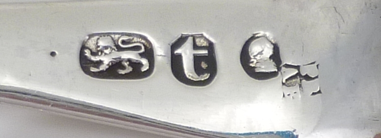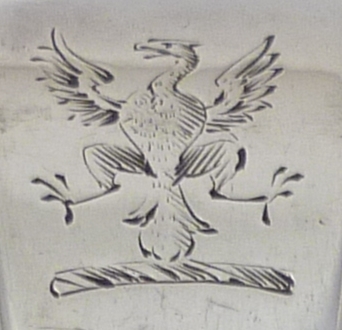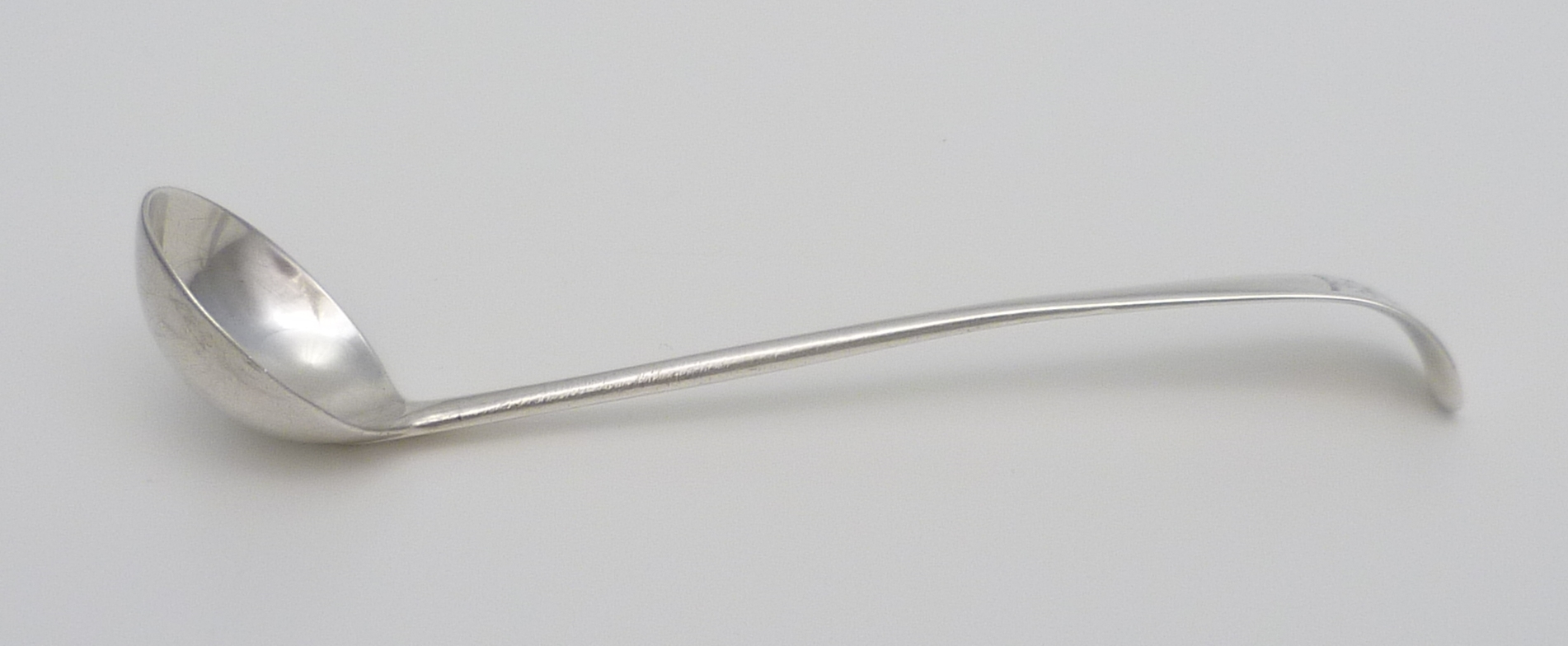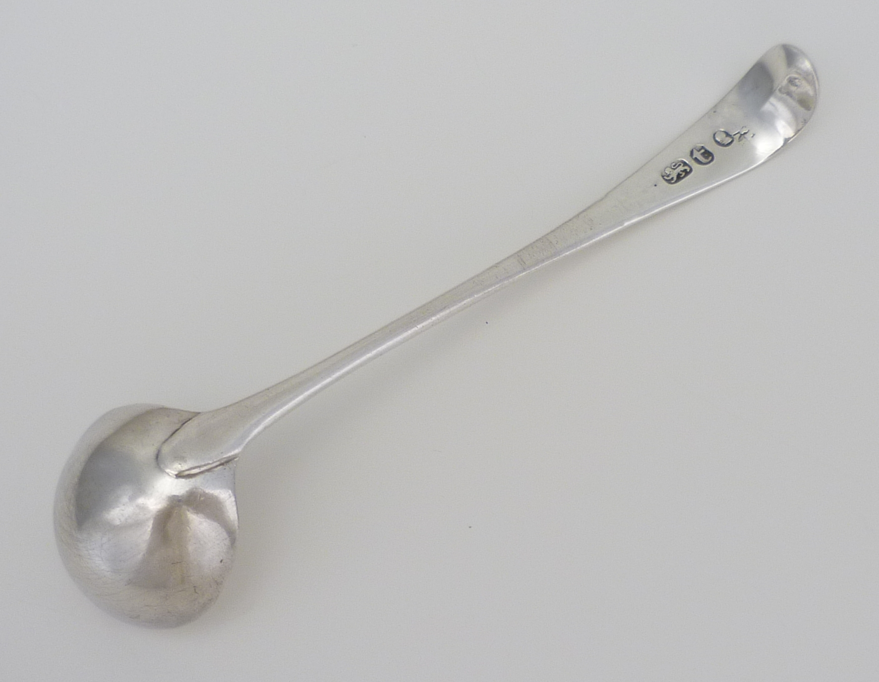 DESCRIPTION | Georgian solid sterling silver Old English pattern condiment ladle with a pronounced hook to the terminal and a good frontal crest engraving. Round bowled, larger than a salt spoon yet much smaller than a sauce ladle. Stem/bowl angle about 50 degrees so probably designed for a taller vessel, perhaps shaped like a neo-classical sugar basket. The terminal would hook onto the top rim and prevent the ladle relaxing into the contents. |