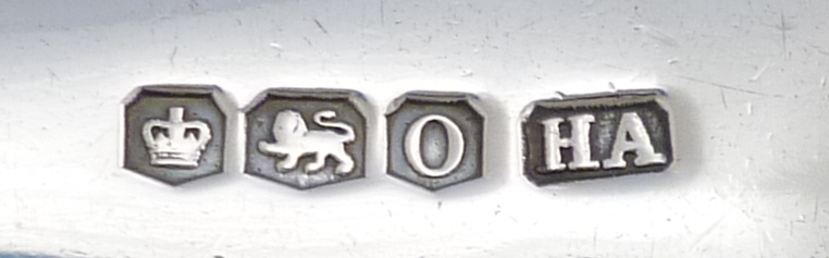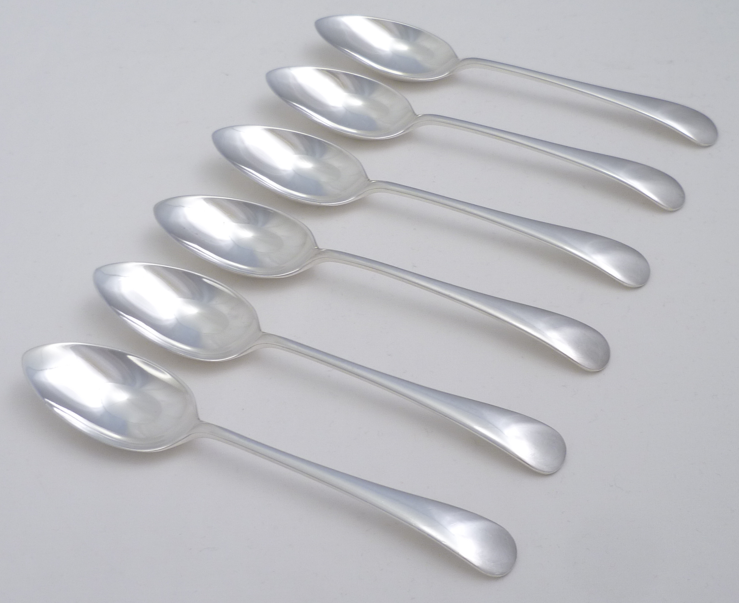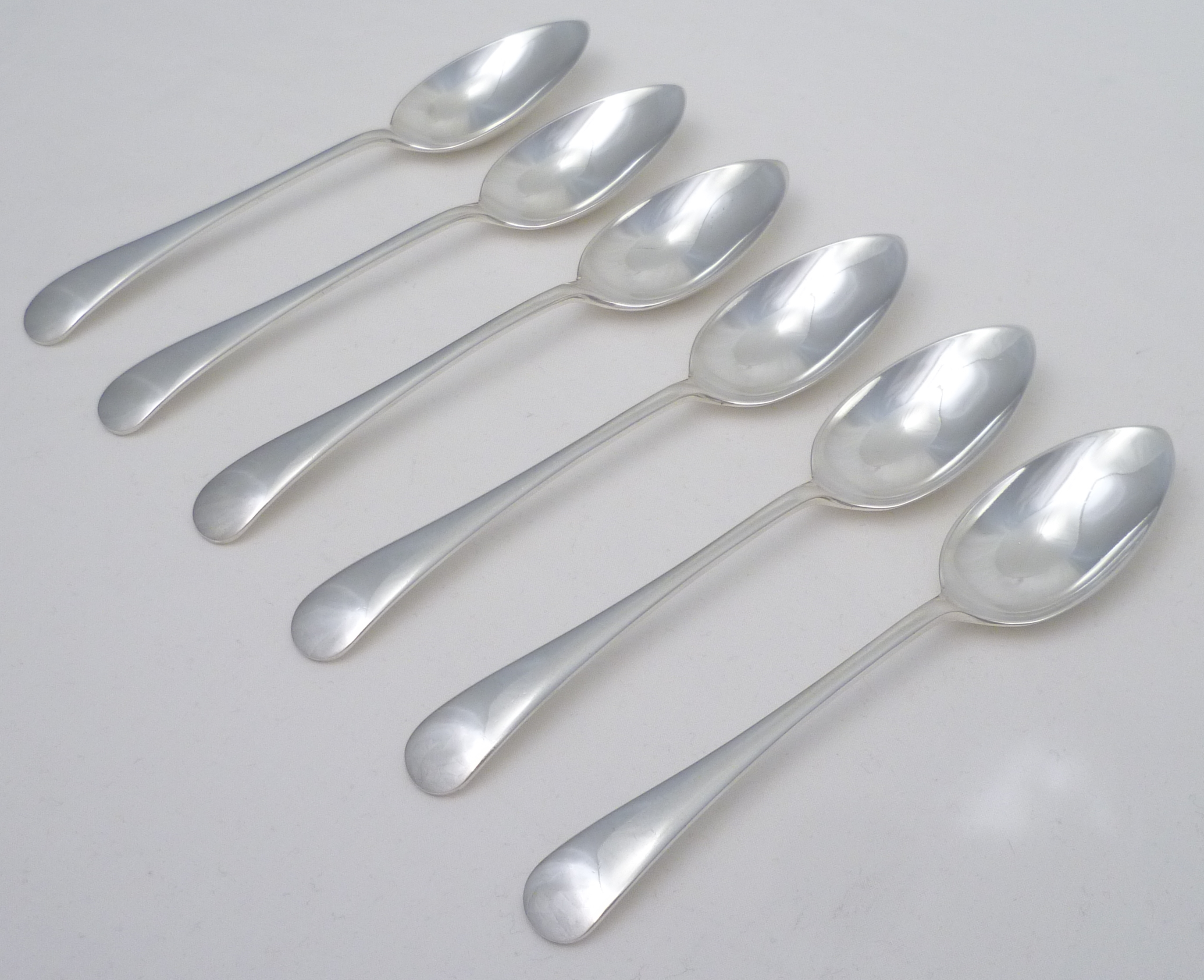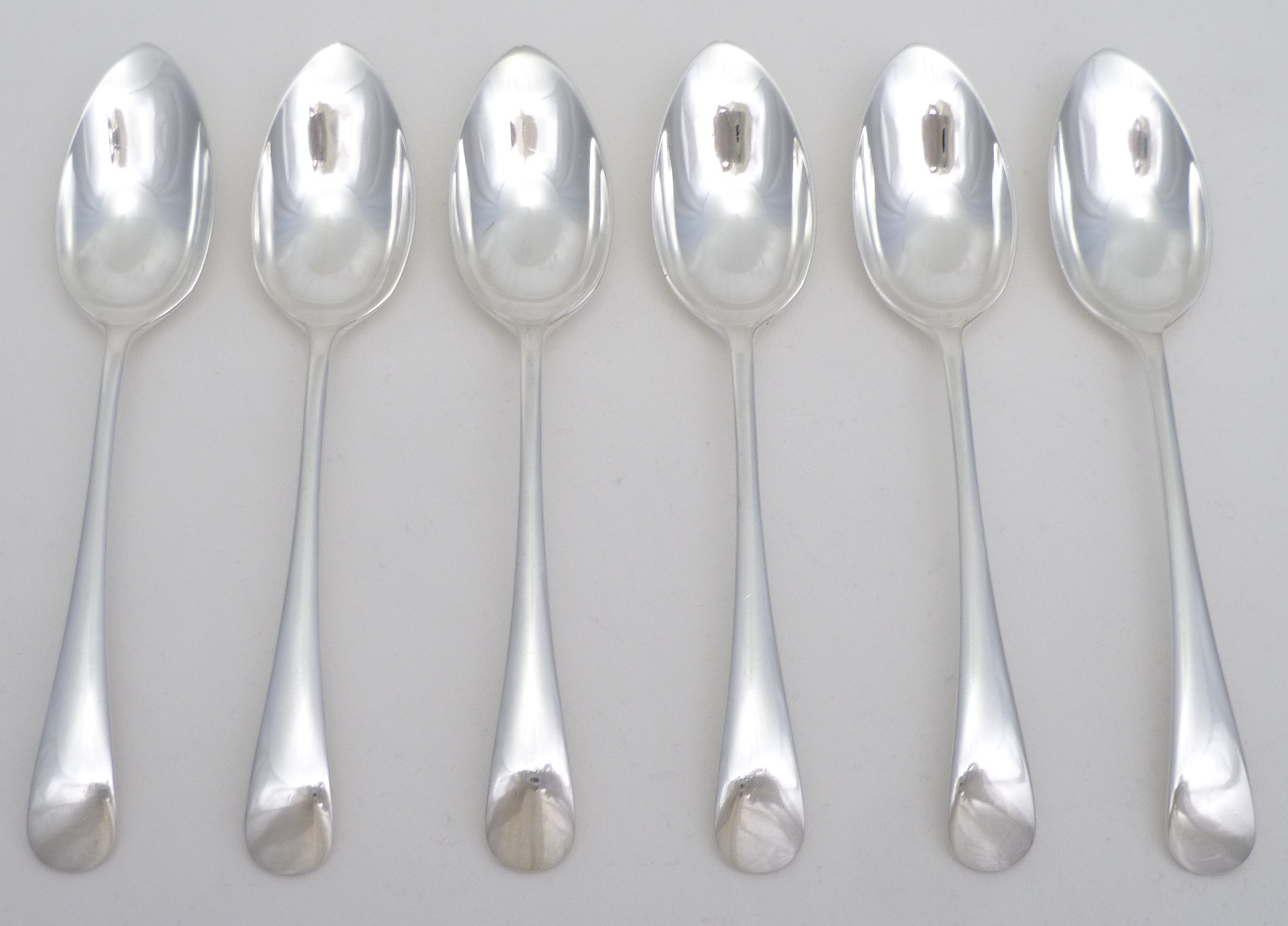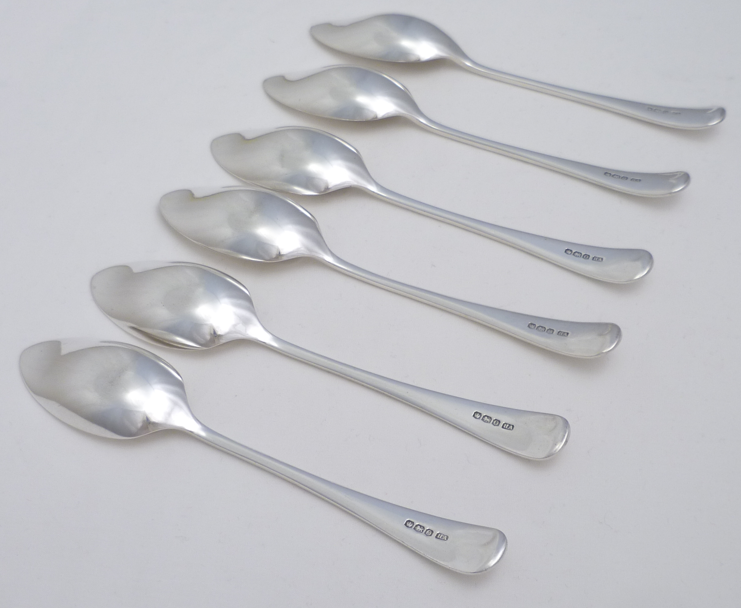 DESCRIPTION | Set of six solid sterling silver Old English pattern spoons with pointed bowls. Originally marketed as grapefruit spoons, today these items are mostly used for ice cream and sorbet. The original ice cream spoons were more like spades and used for handmade iced cream. Modern production methods and refrigeration produces a much harder ice cream best attacked with a pointed bowl. |