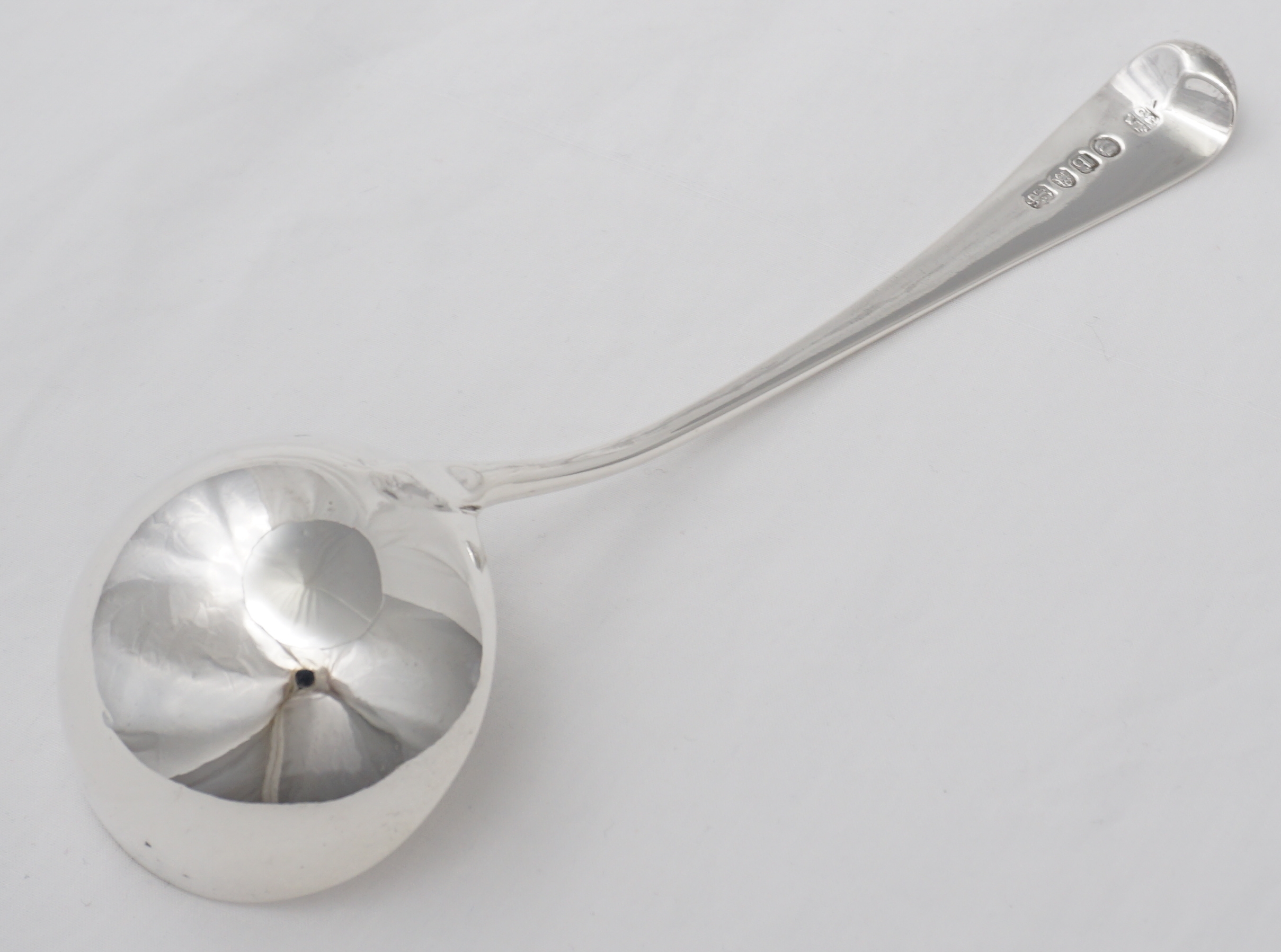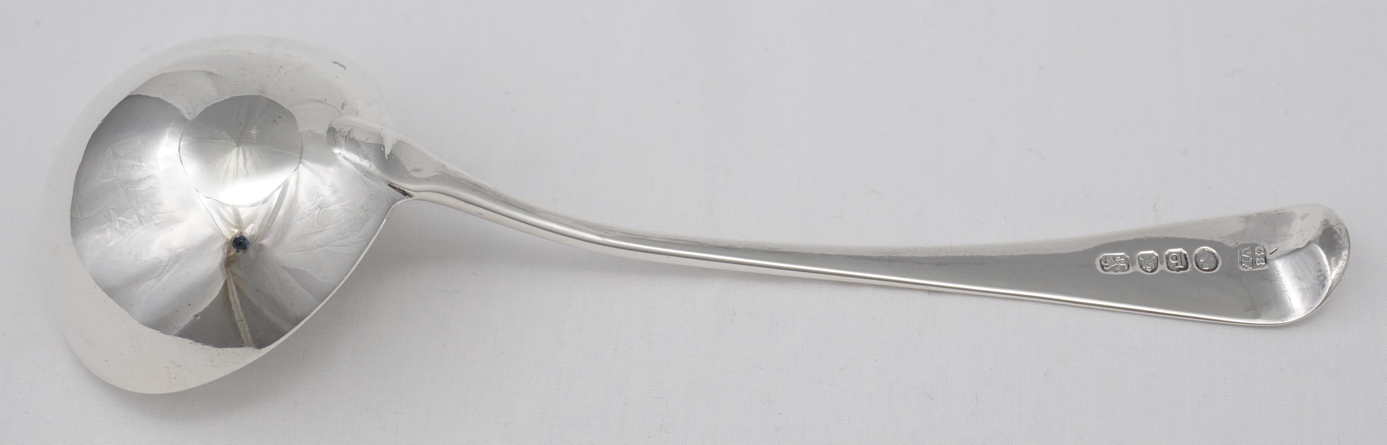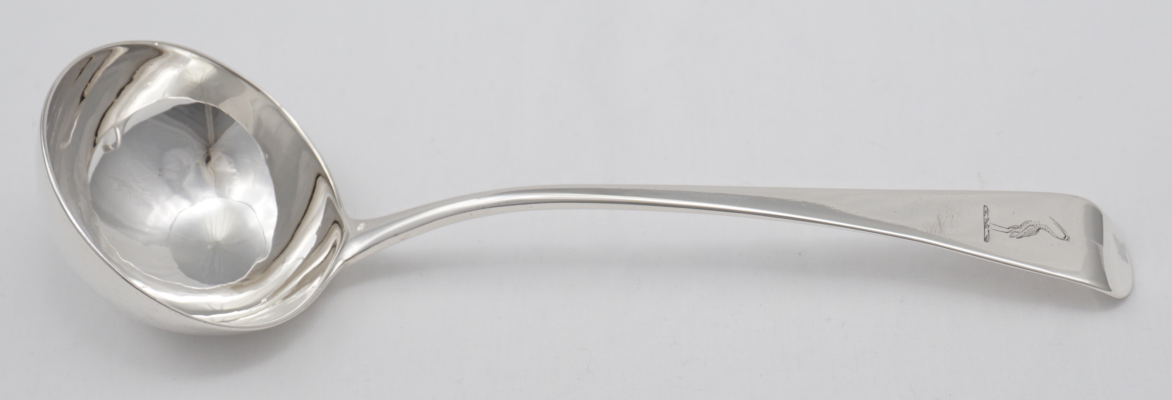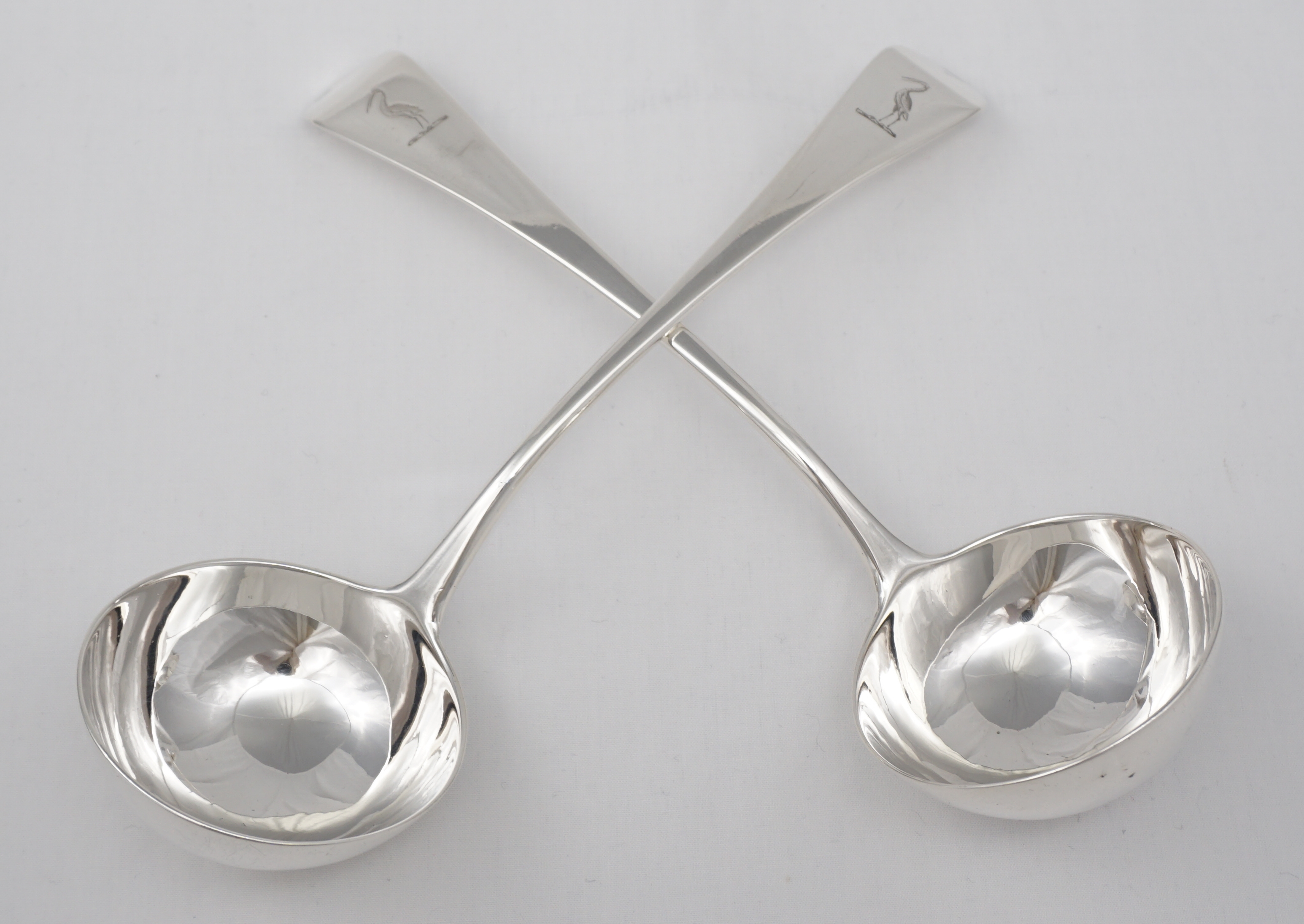 DESCRIPTION | Very good pair of antique English Georgian solid sterling silver Old English pattern sauce ladles with deep, round bowls and frontal crest engraving. |