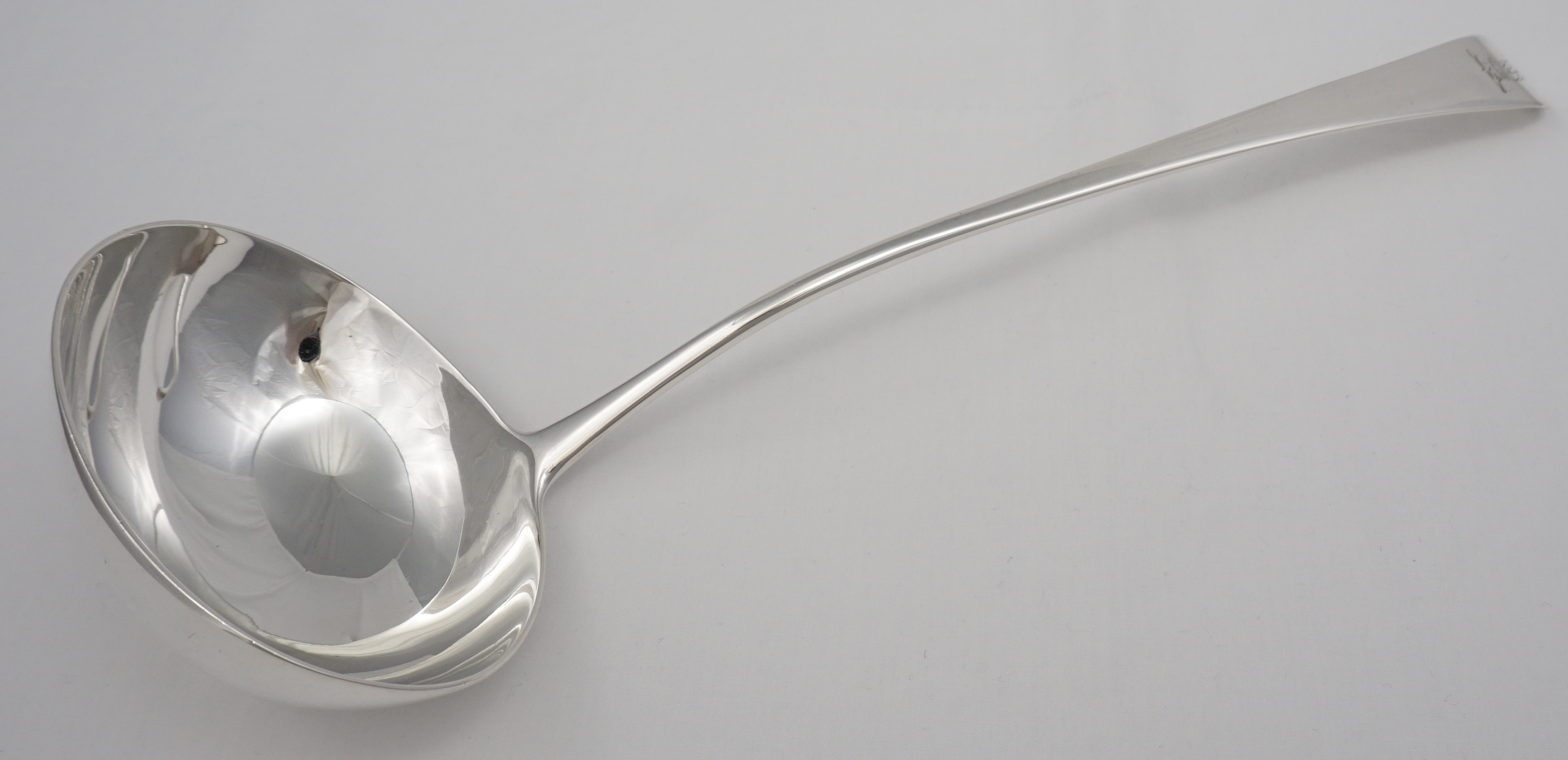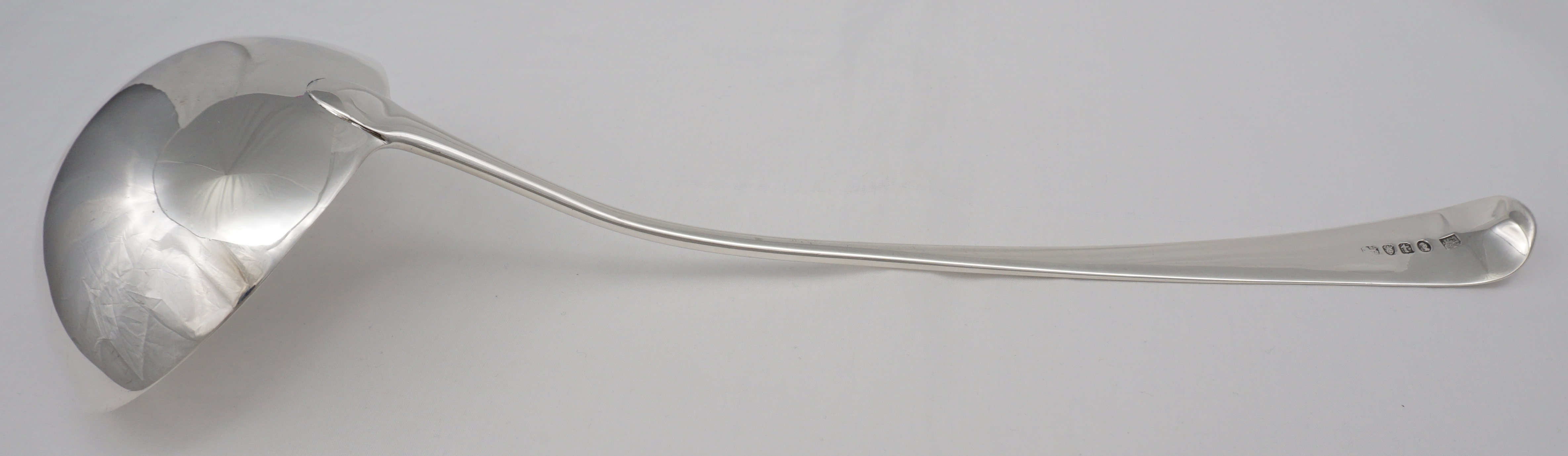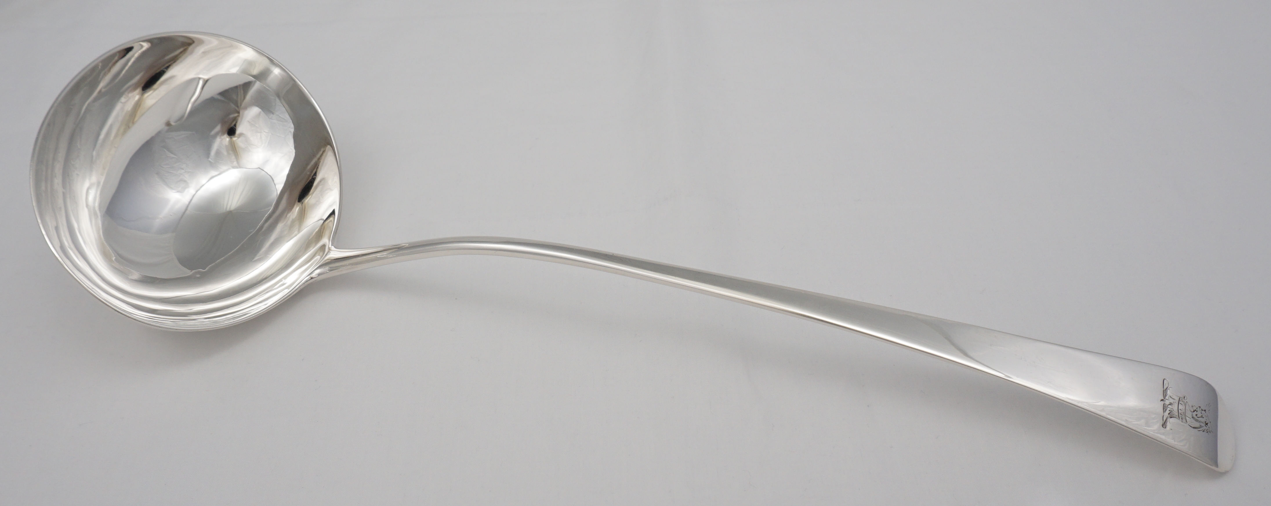 DESCRIPTION | Very good, large antique English Georgian solid sterling silver Old English pattern soup ladle with an oval bowl and frontal crest engraving. |