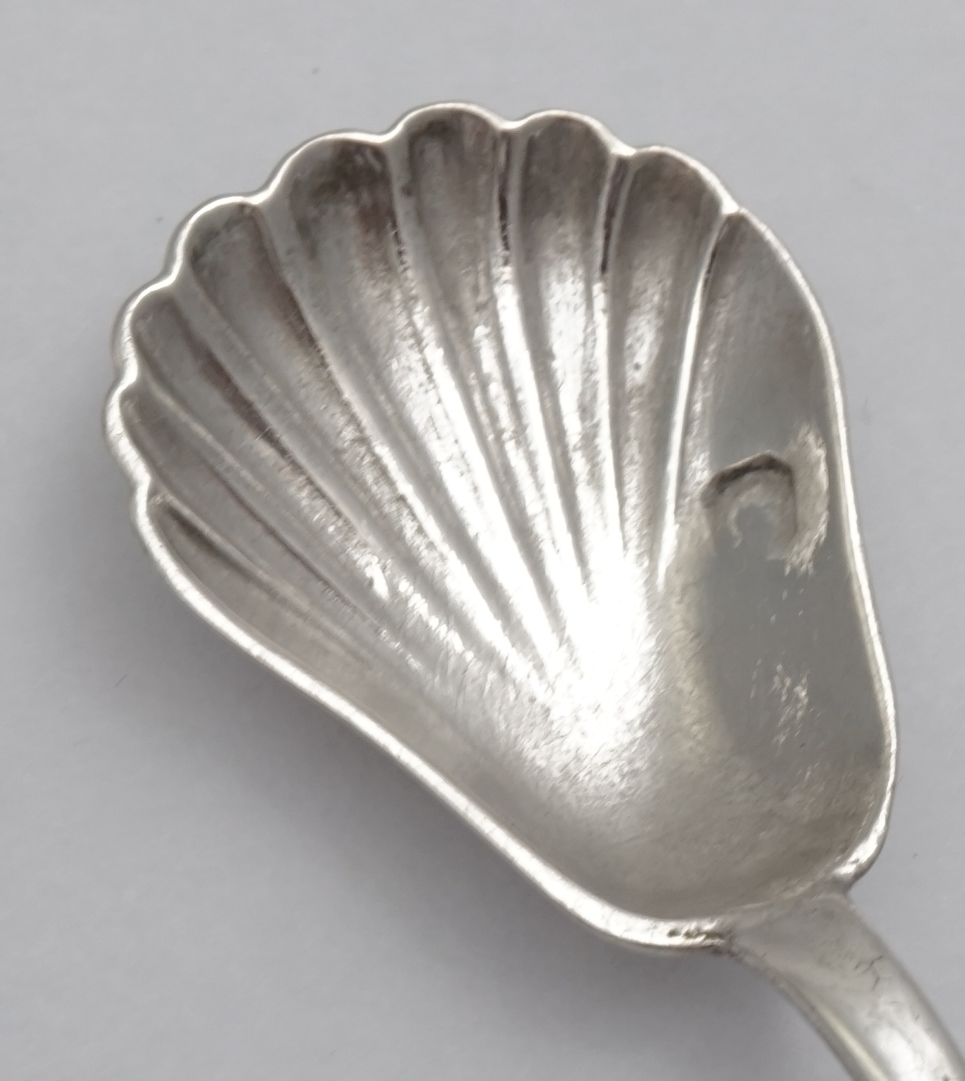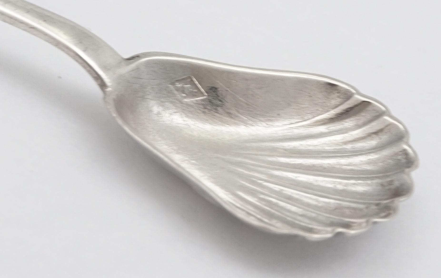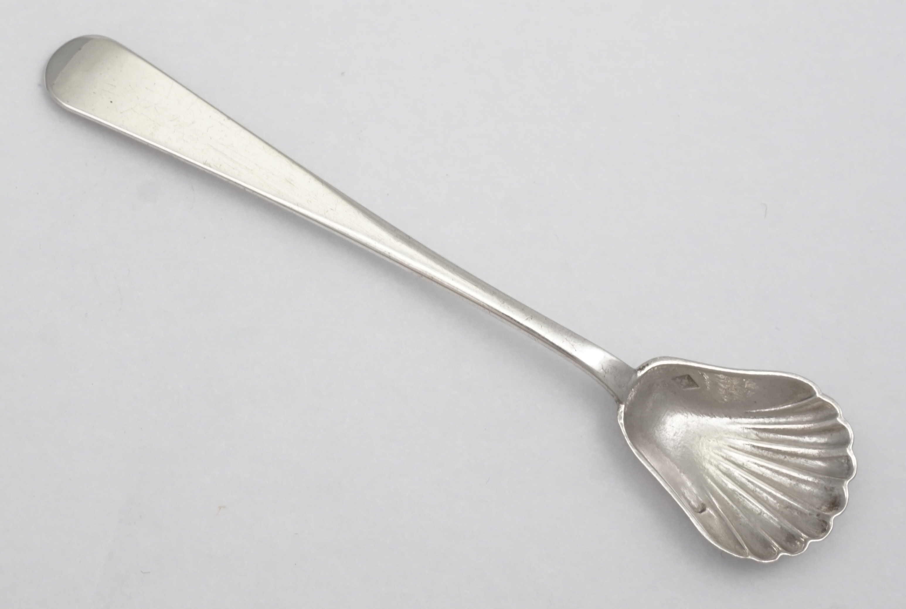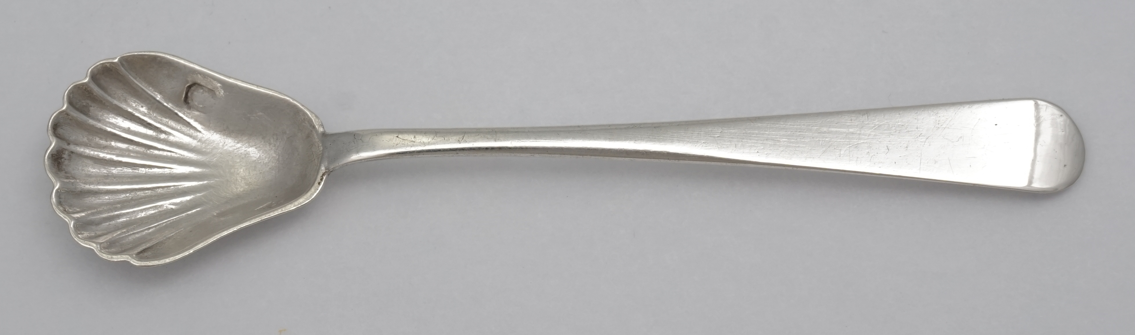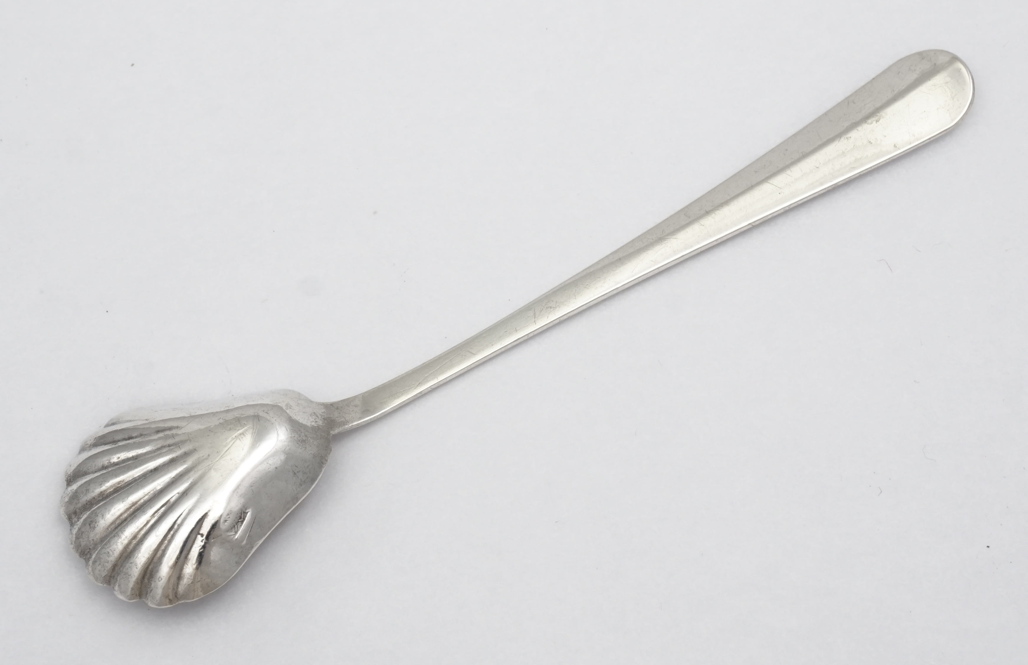 DESCRIPTION | Antique French solid high standard silver Old English pattern salt spoon with demi-shell pear form bowl. |