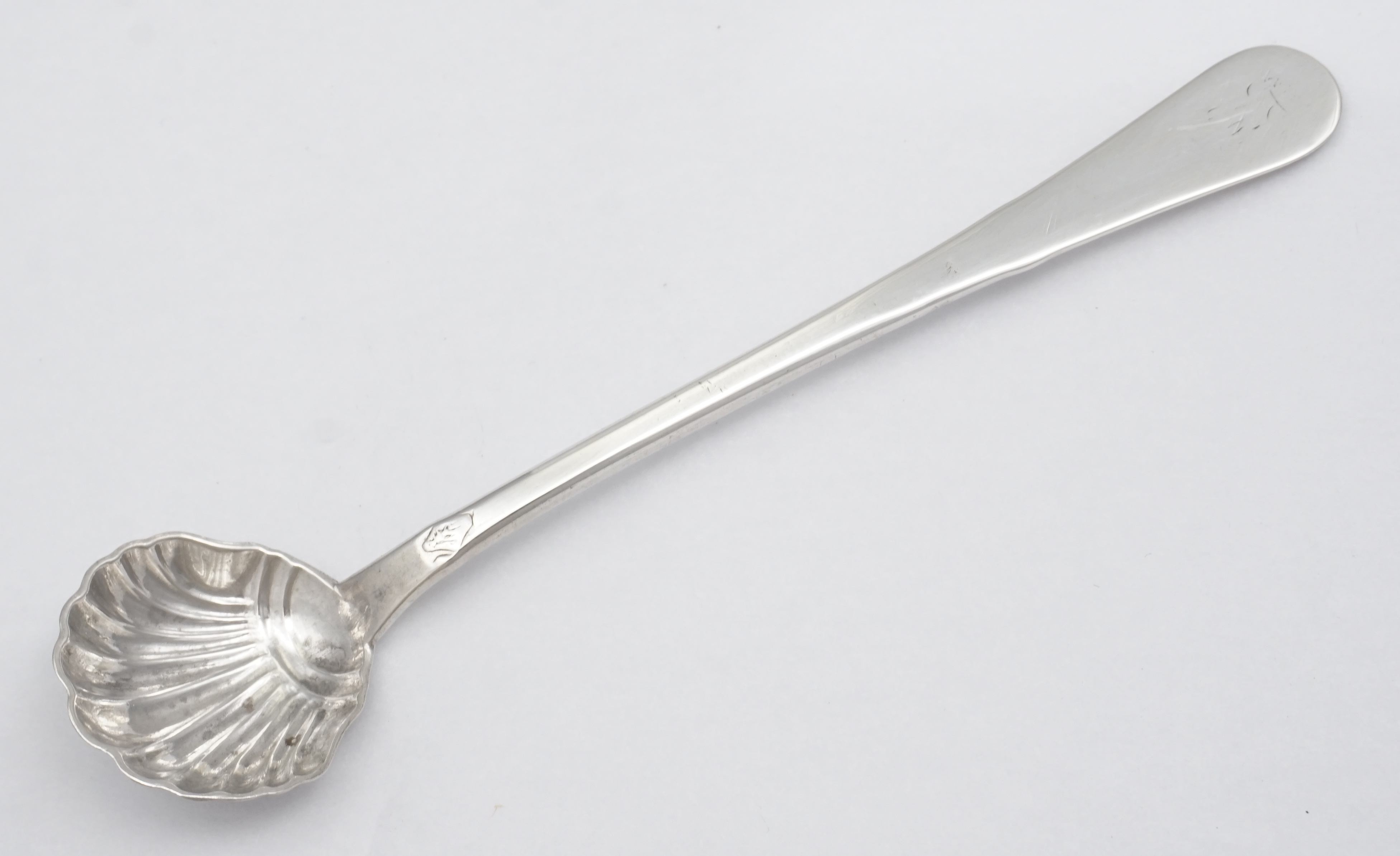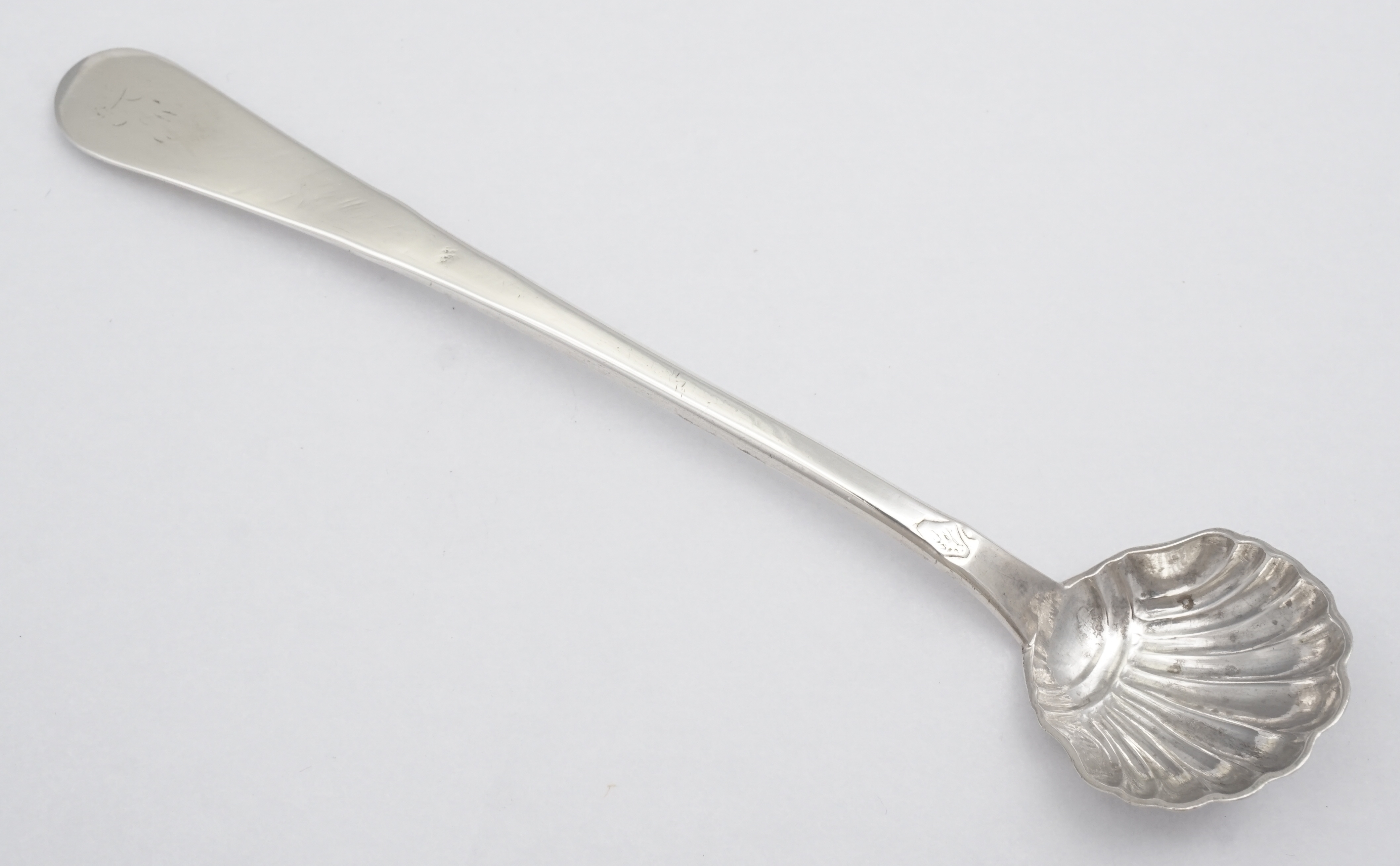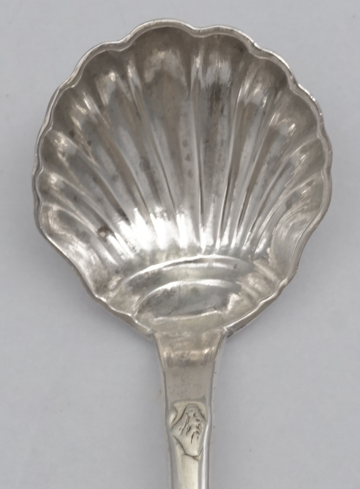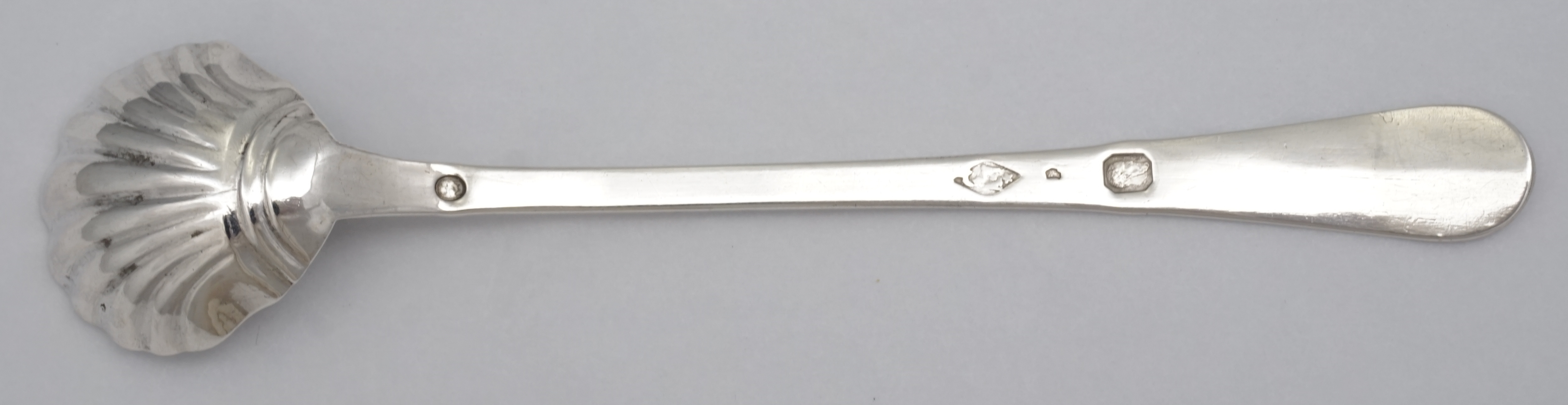 DESCRIPTION | Antique French solid high standard silver Old English pattern condiment ladle with demi-shell bowl. In addition to all markings listed below there is an insect form hallmark front, lower stem that I think may identify which part of Paris the maker worked but I will leave that one to the experts. Some hallmarks zealously struck deforming the metal slightly but, on the plus side, this has also meant that they are still clear. |