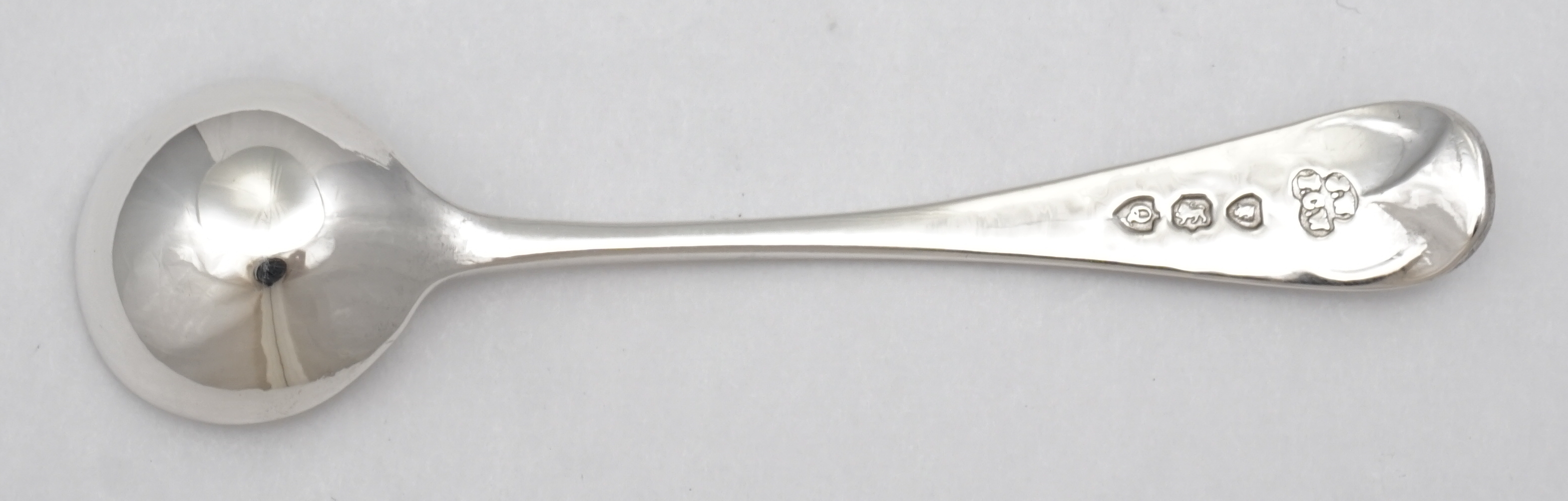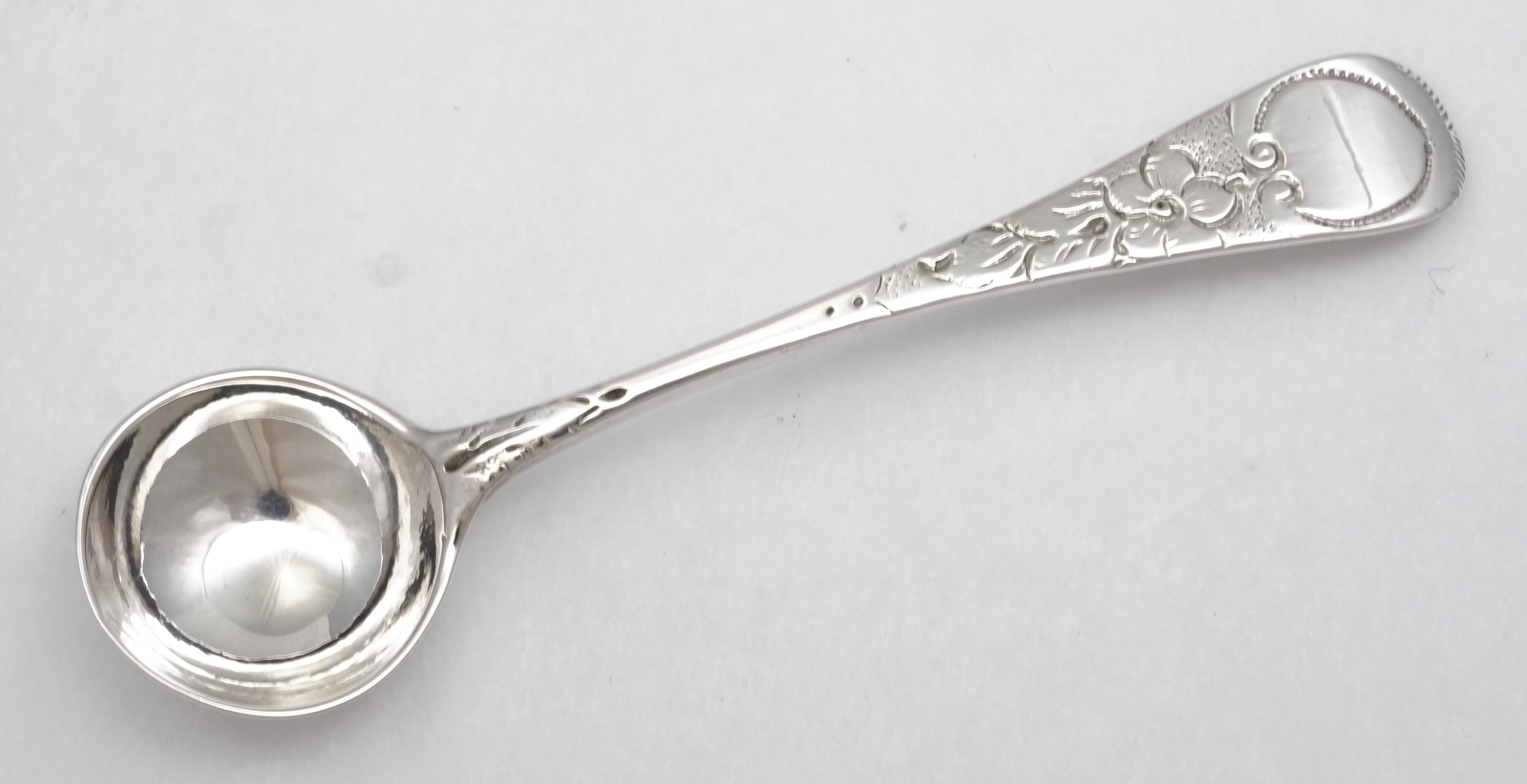DESCRIPTION | Antique English Victorian solid sterling silver Bright-Cut Old English pattern salt spoon with a circular bowl and blank frontal cartouche that has never been engraved. |