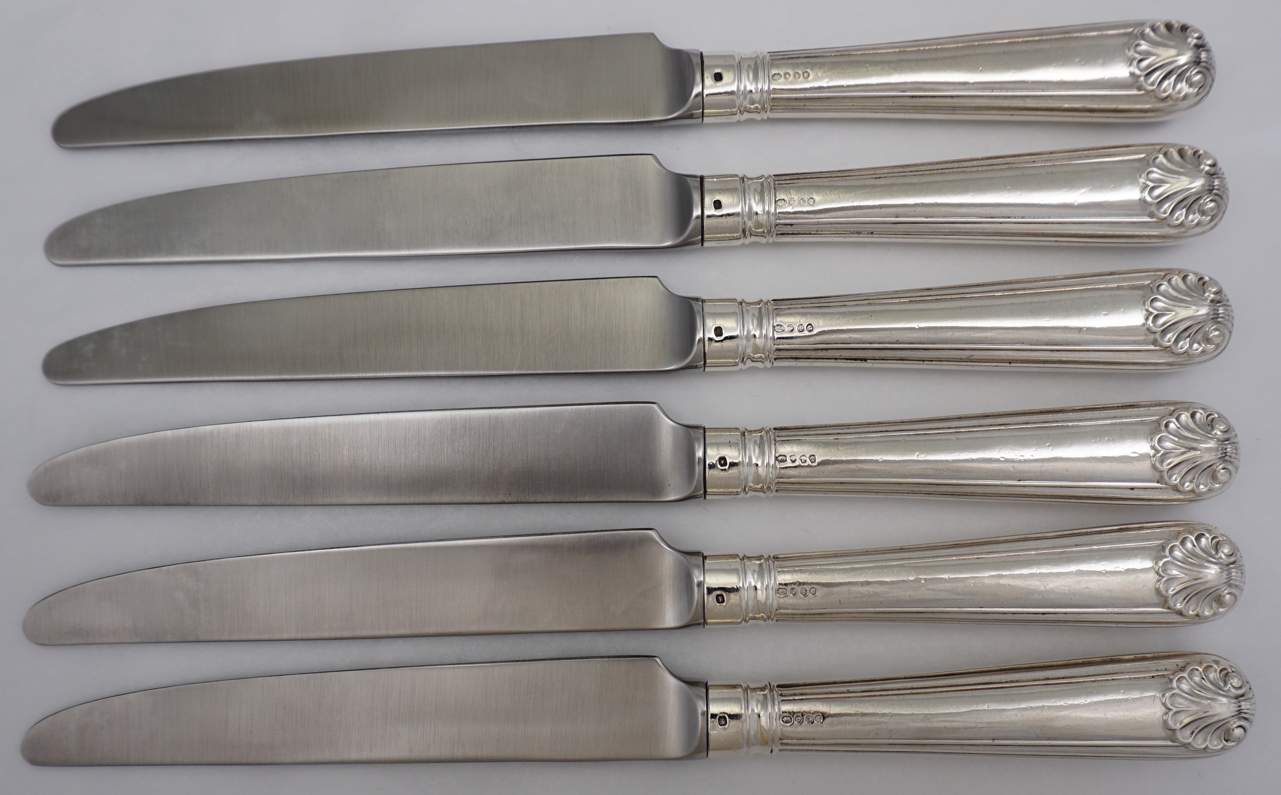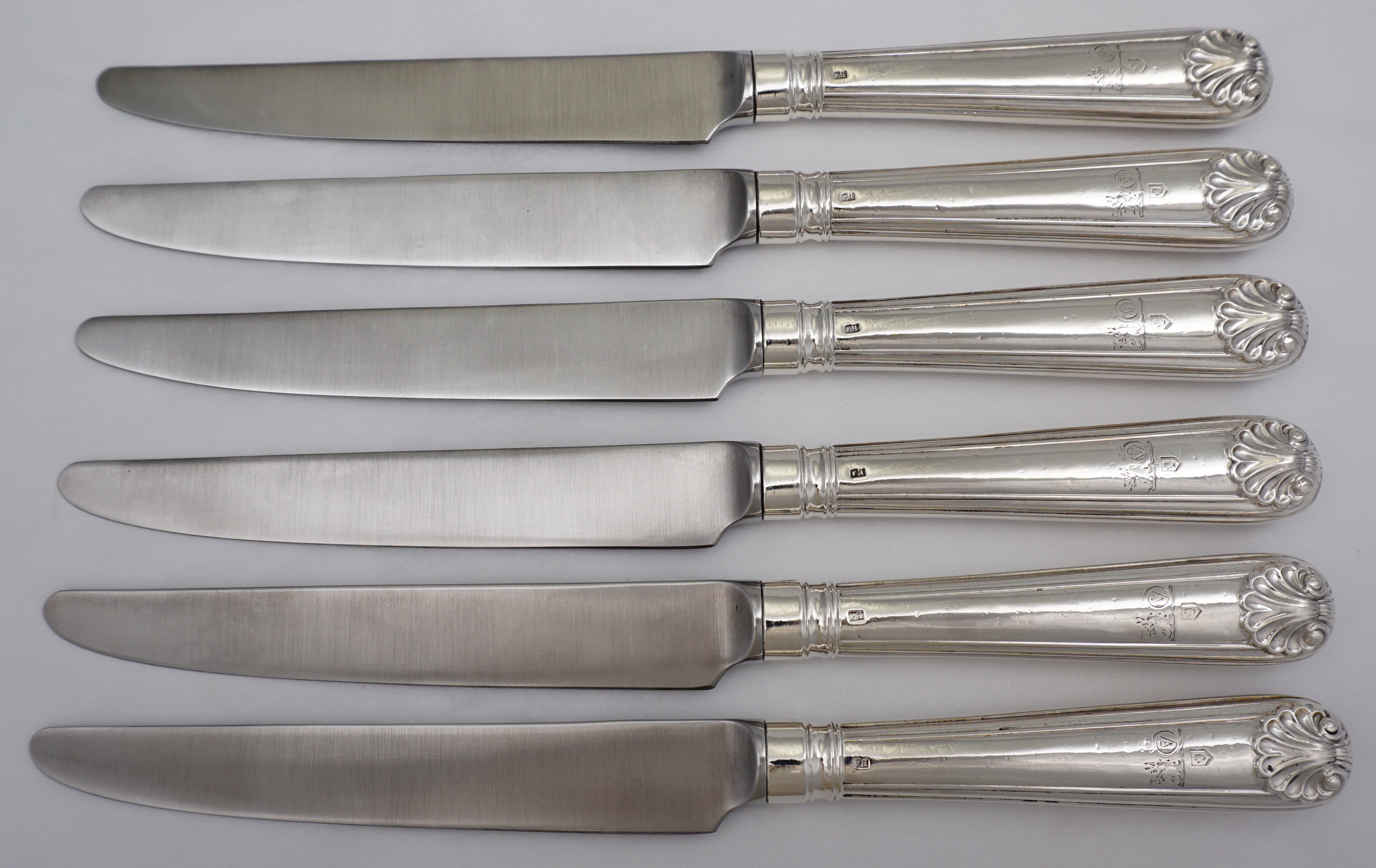 DESCRIPTION | Superb set of six antique English Victorian sterling silver handled Shell pattern table knives with a distinctive crest engraving and fitted with new stainless steel blades. In this example the blades are satin finished finger point but there is the option of parallel blades and both come in either satin or mirror finishes. Traditional pitch loading so keep out of the hot dishwasher. This listing is for six but there are nine available, £80 each, also available are some carvers. |