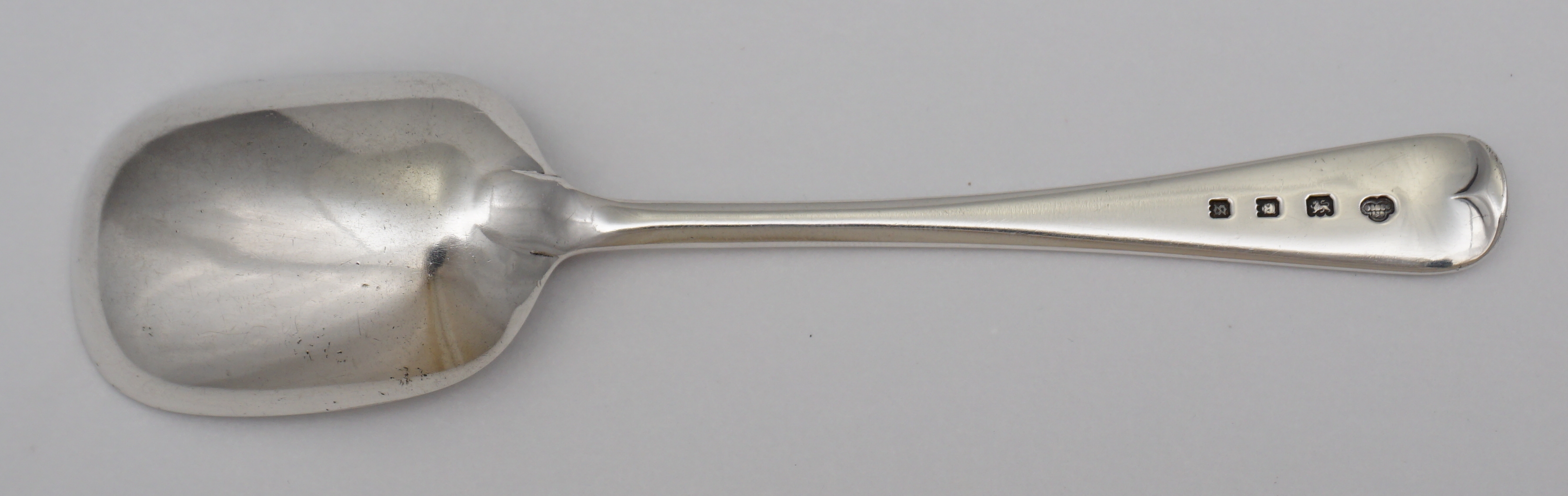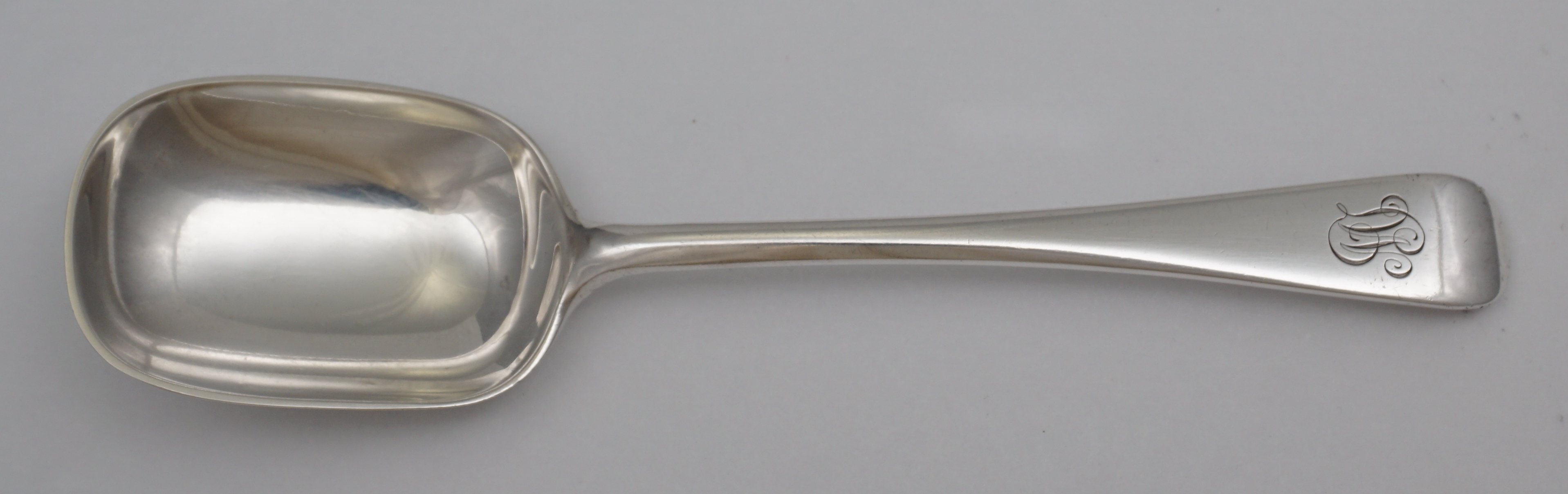 DESCRIPTION | Good quality vintage English solid sterling silver Old English pattern jam spoon with a frontal monogram engraving. |