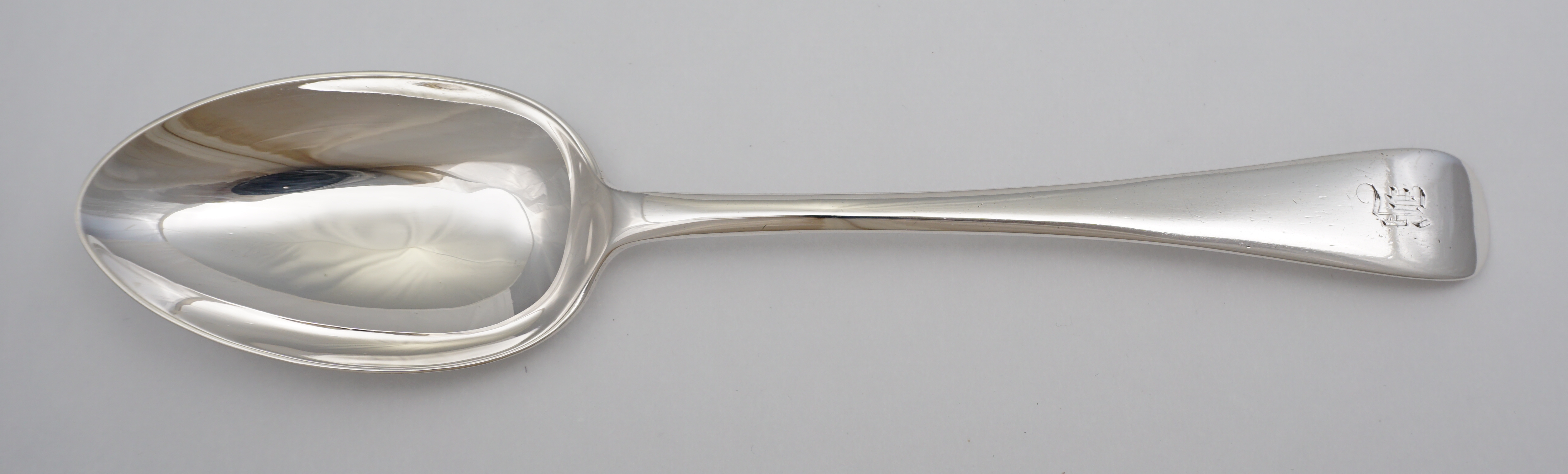 DESCRIPTION | Good antique English Victorian solid sterling silver Old English pattern dessert spoon with a frontal monogram engraving. |