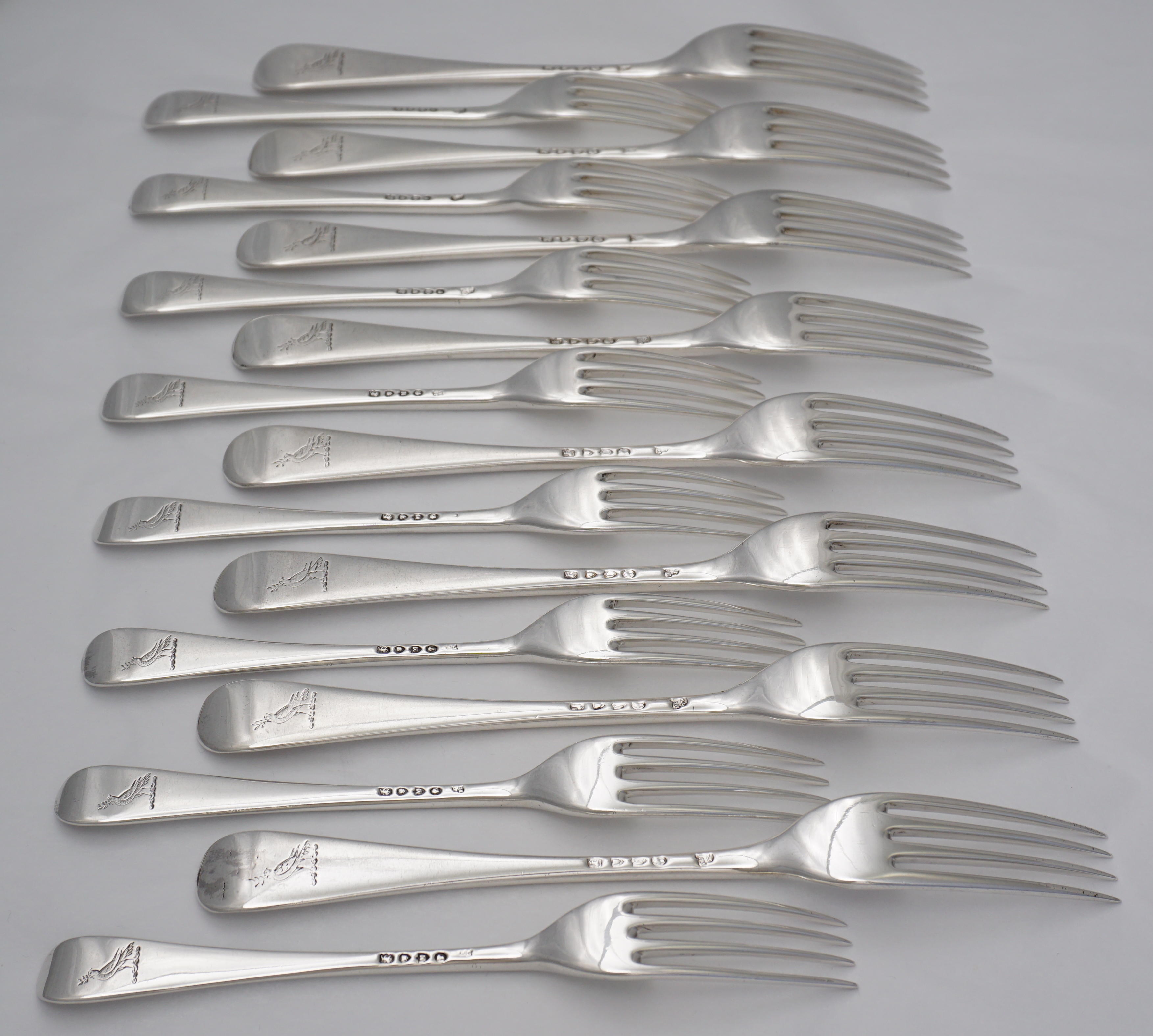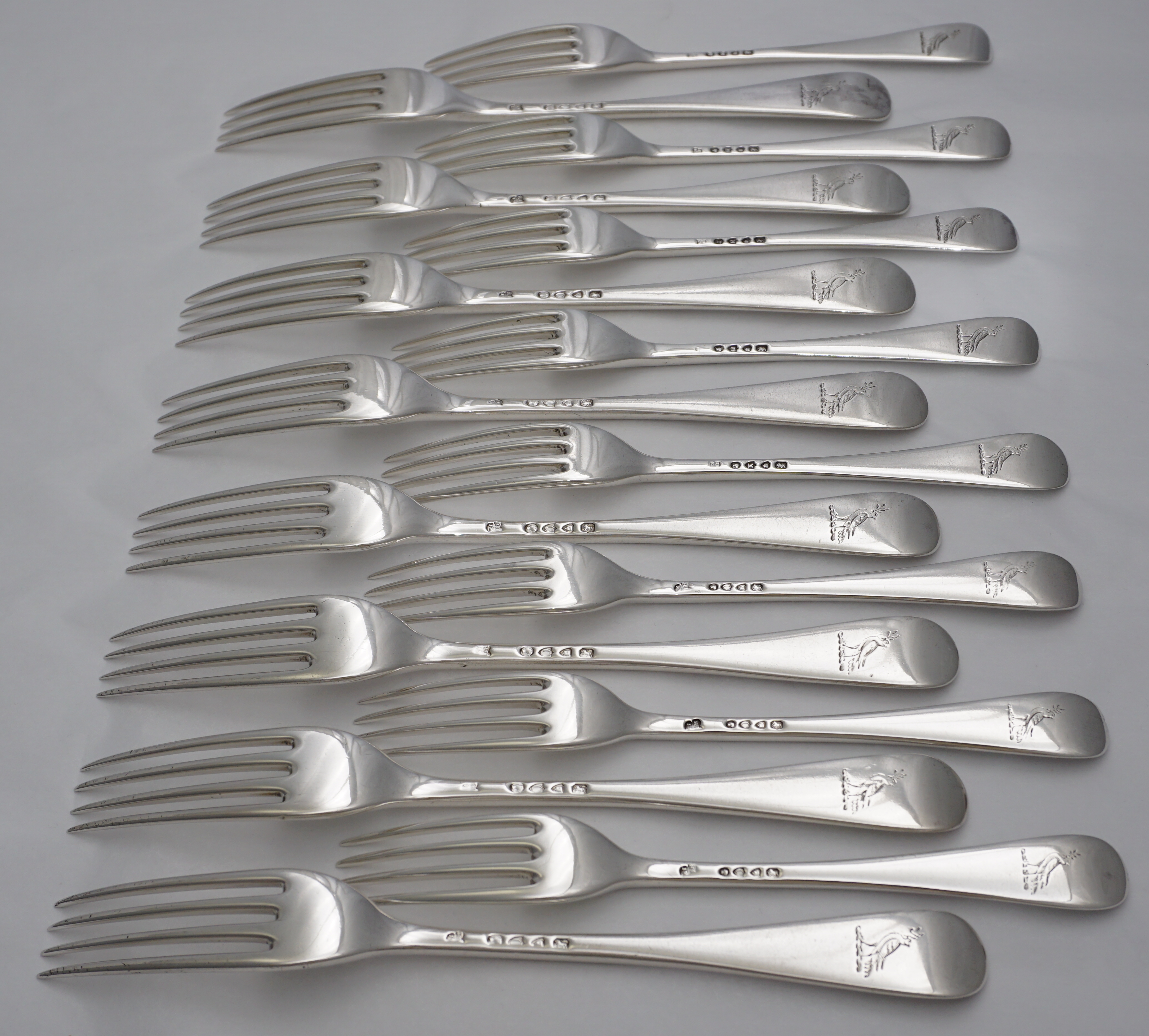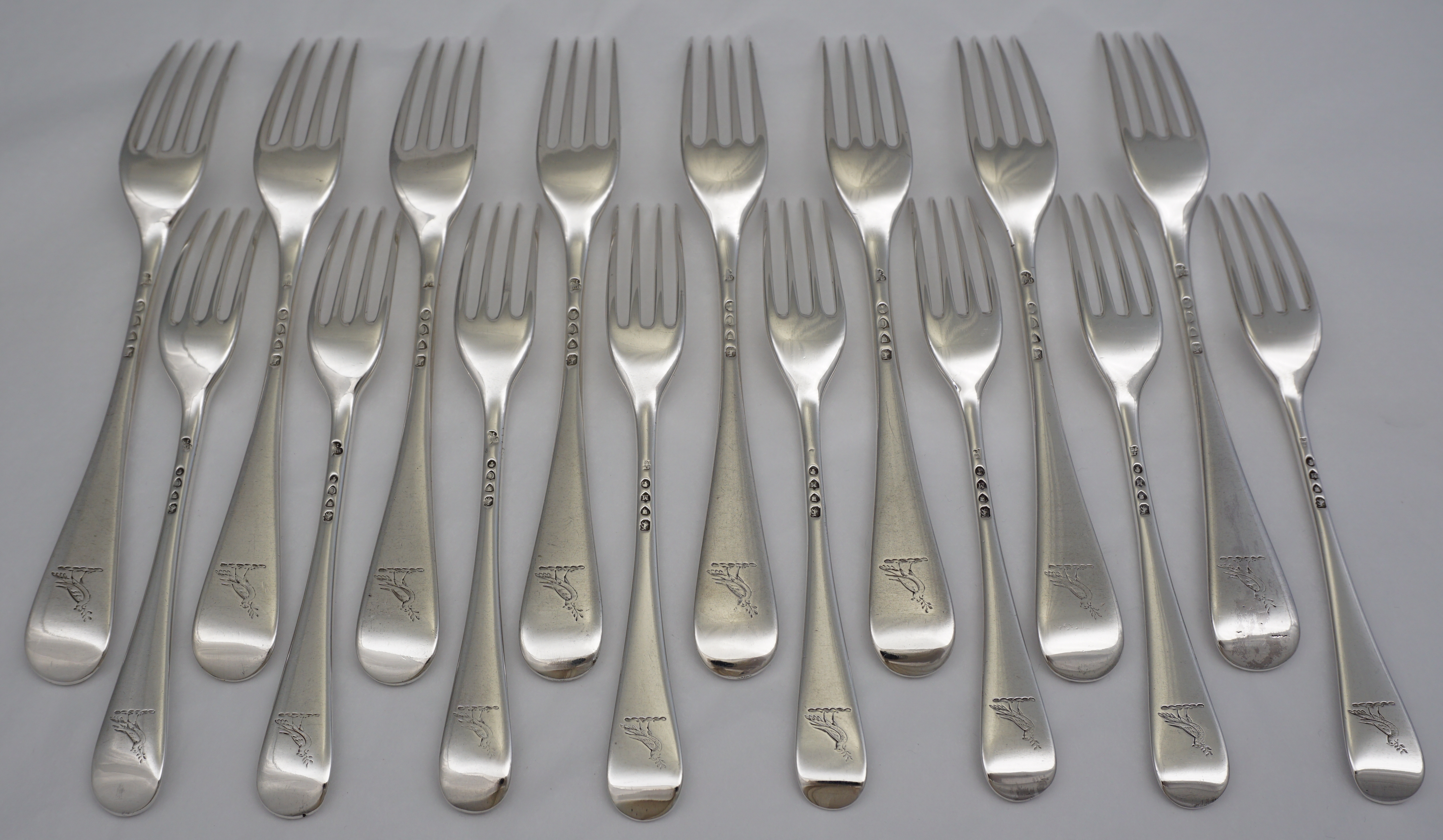 DESCRIPTION | Superb set of sixteen antique English Victorian solid sterling silver Old English pattern forks with a crest engraving verso comprising of eight table forks and eight dessert forks. |