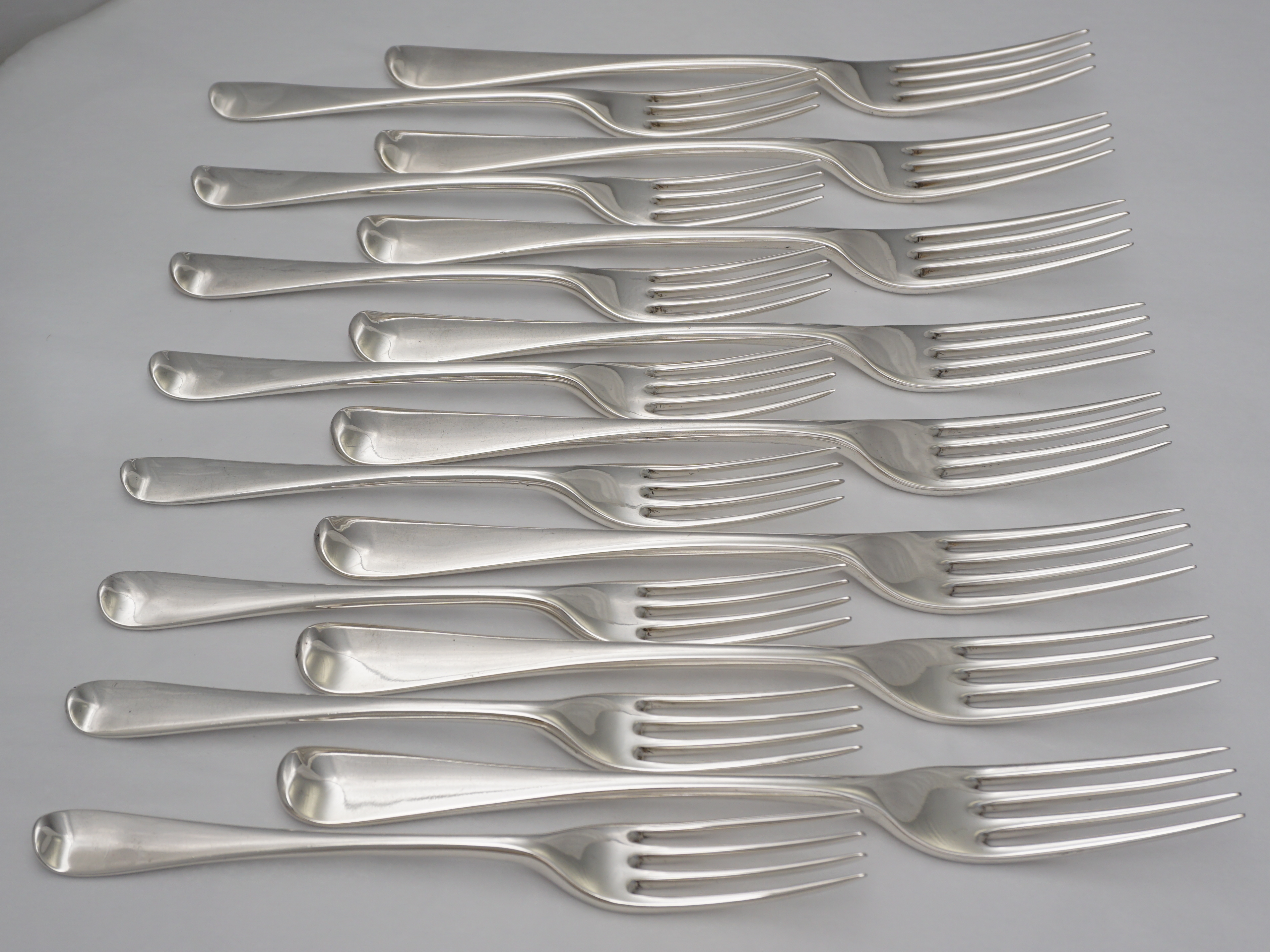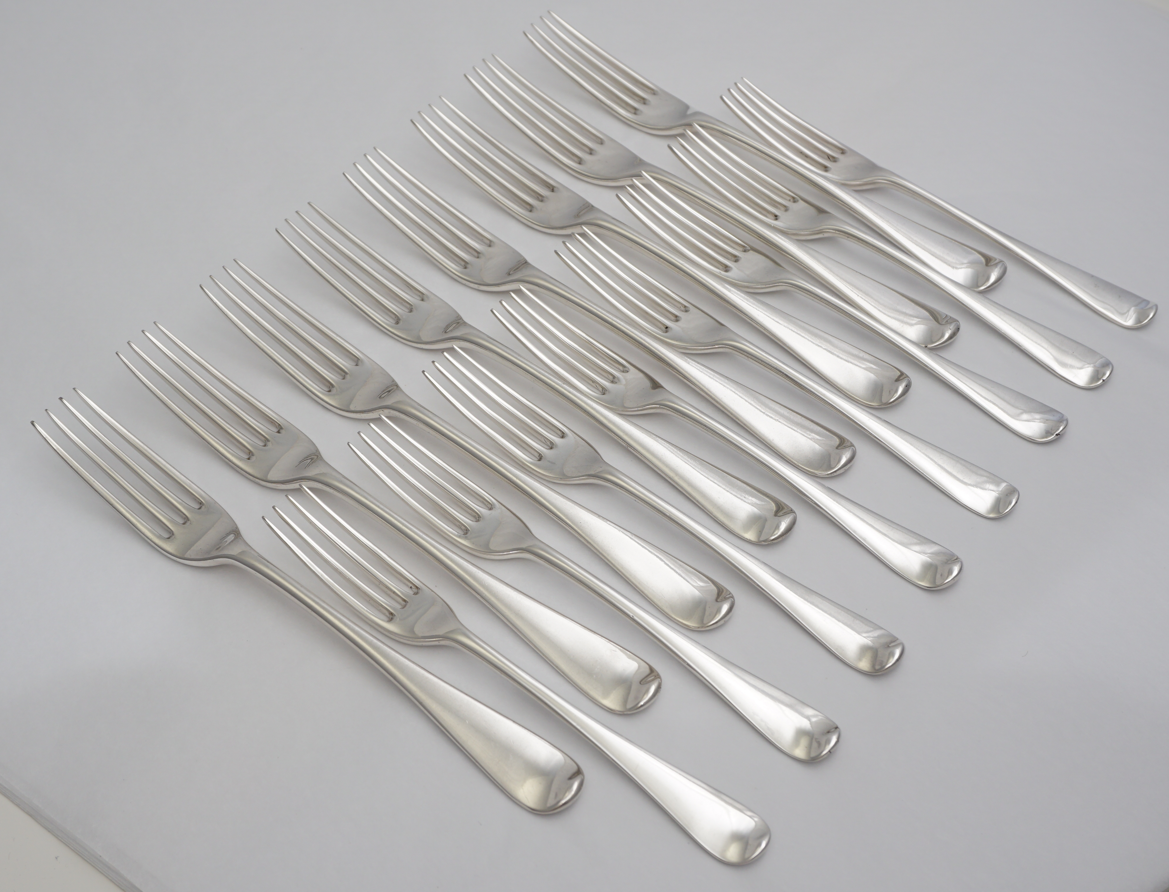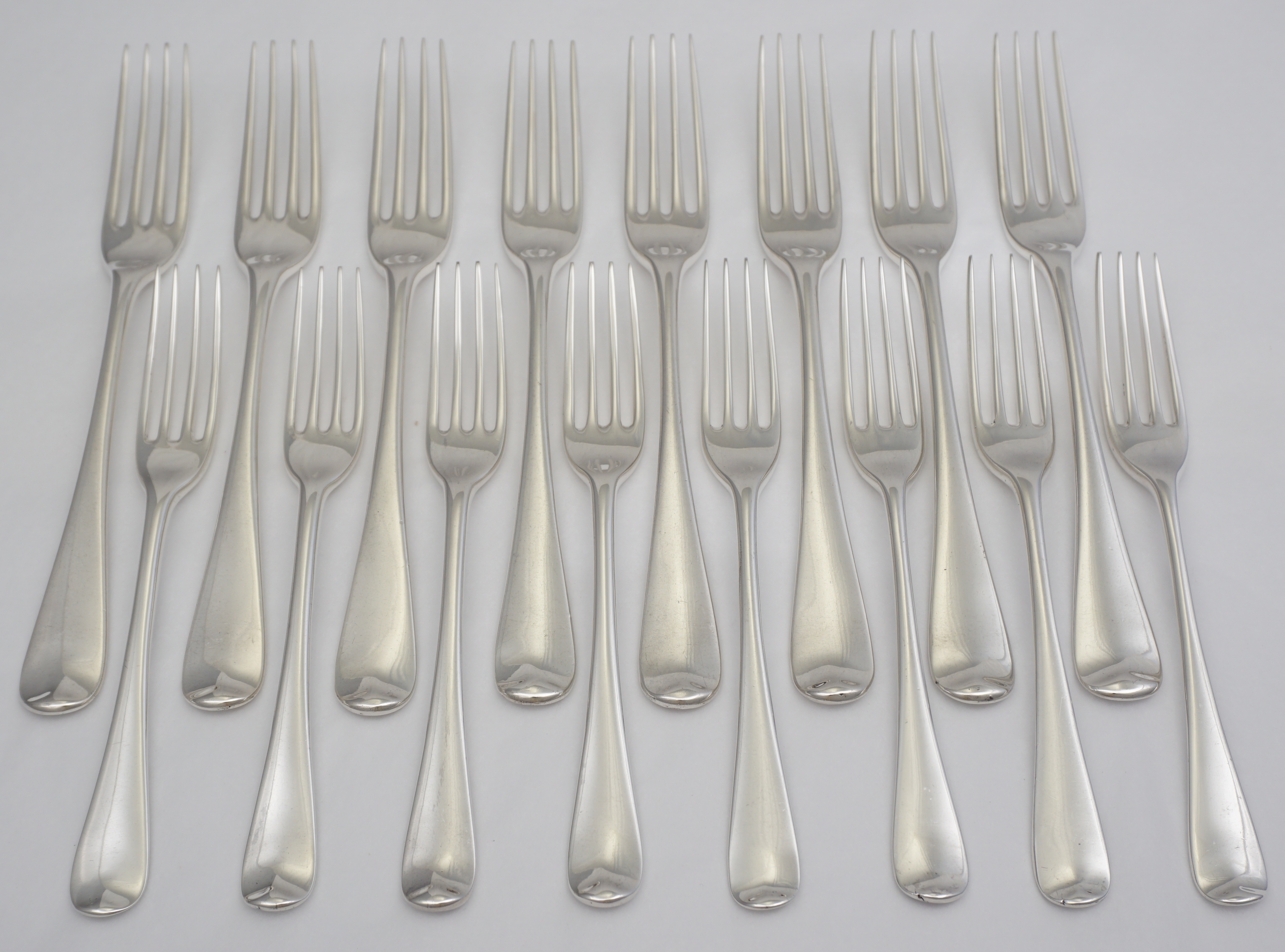 DESCRIPTION | Superb set of sixteen antique English Victorian solid sterling silver Old English pattern forks with a crest engraving verso comprising of eight table forks and eight dessert forks. |