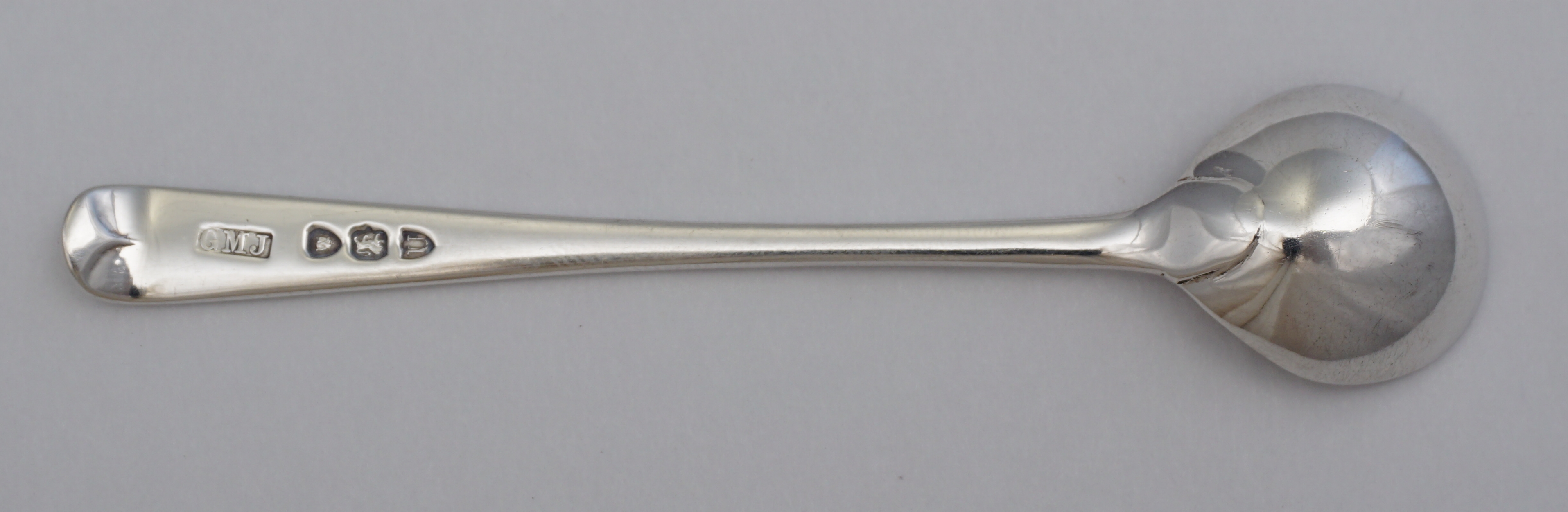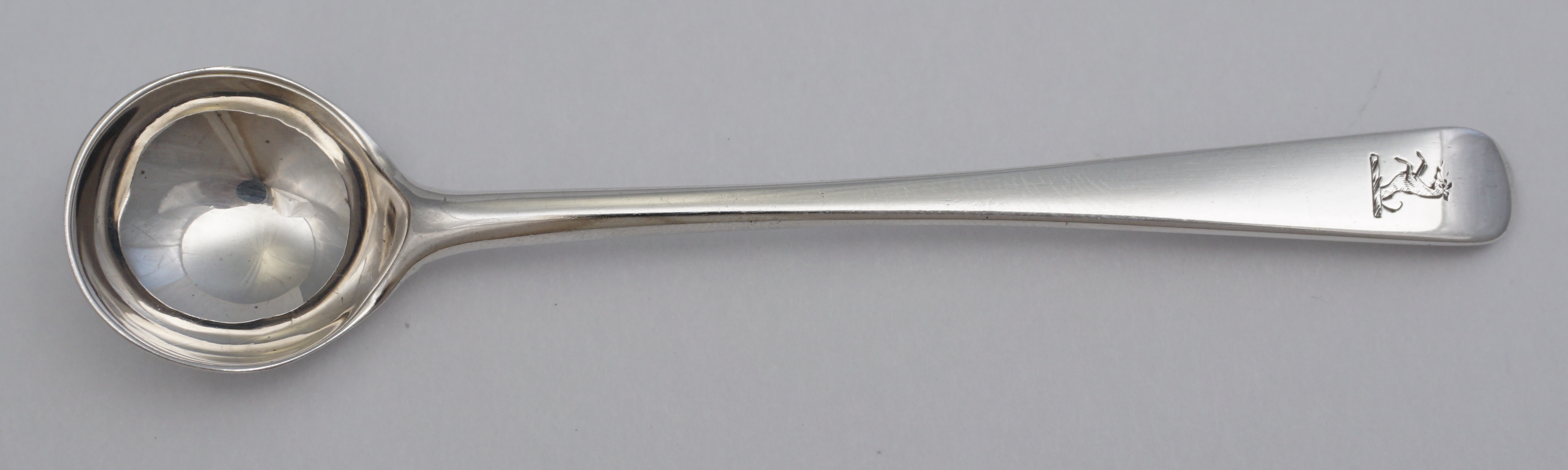 DESCRIPTION | Antique English Victorian solid sterling silver Old English pattern salt spoon with a good frontal crest engraving. |