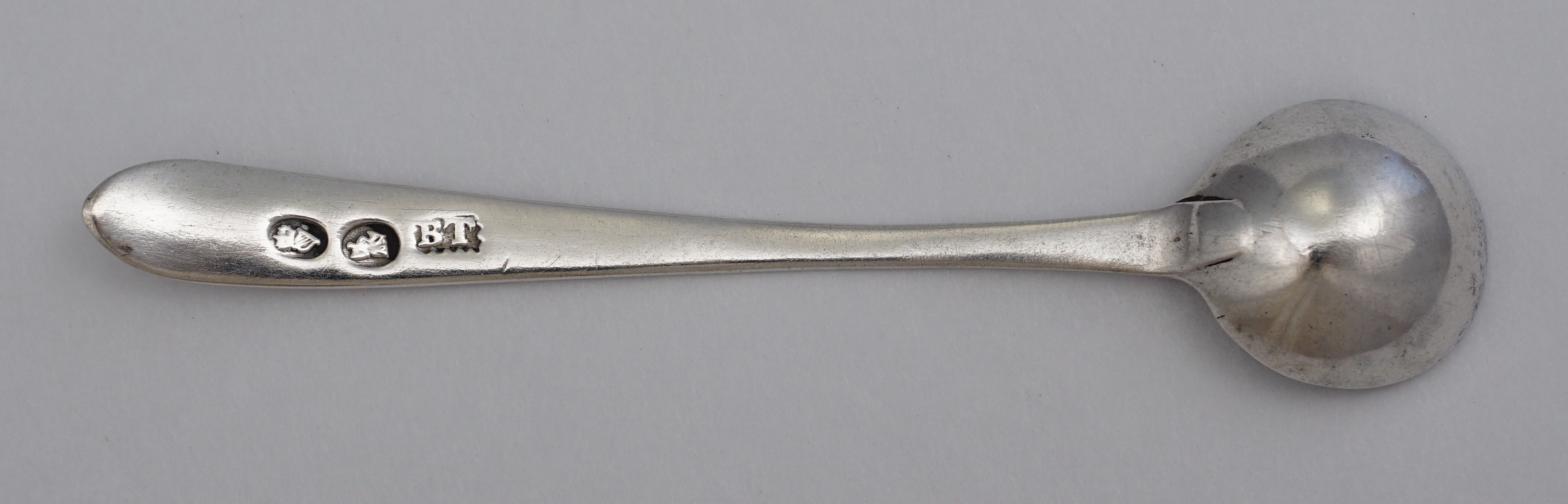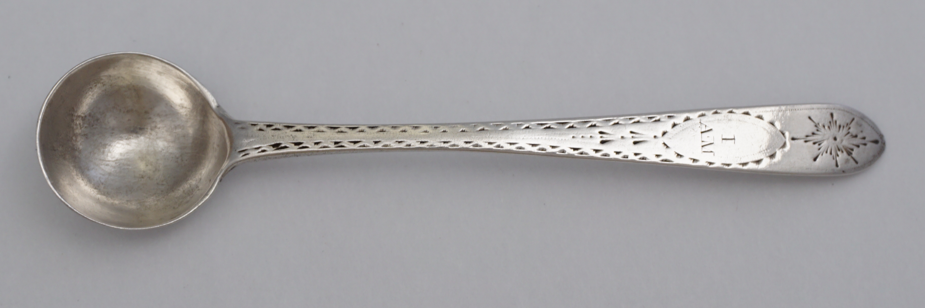 DESCRIPTION | Antique Georgian solid sterling silver Bright-cut Irish pointed Old English Star pattern salt spoon with initial engraved cartouche. |