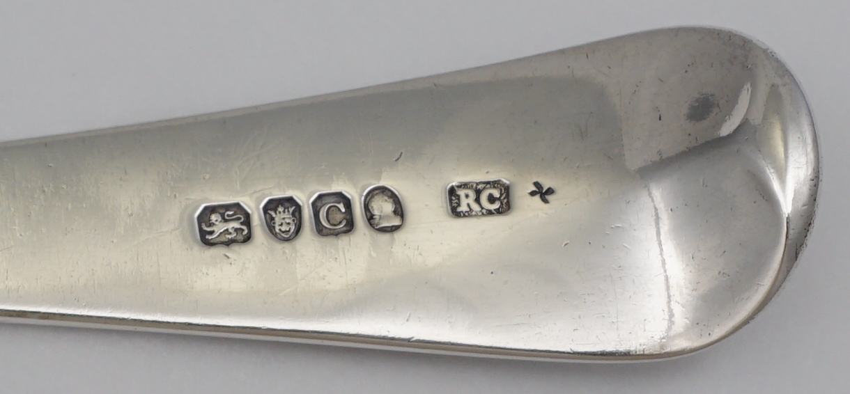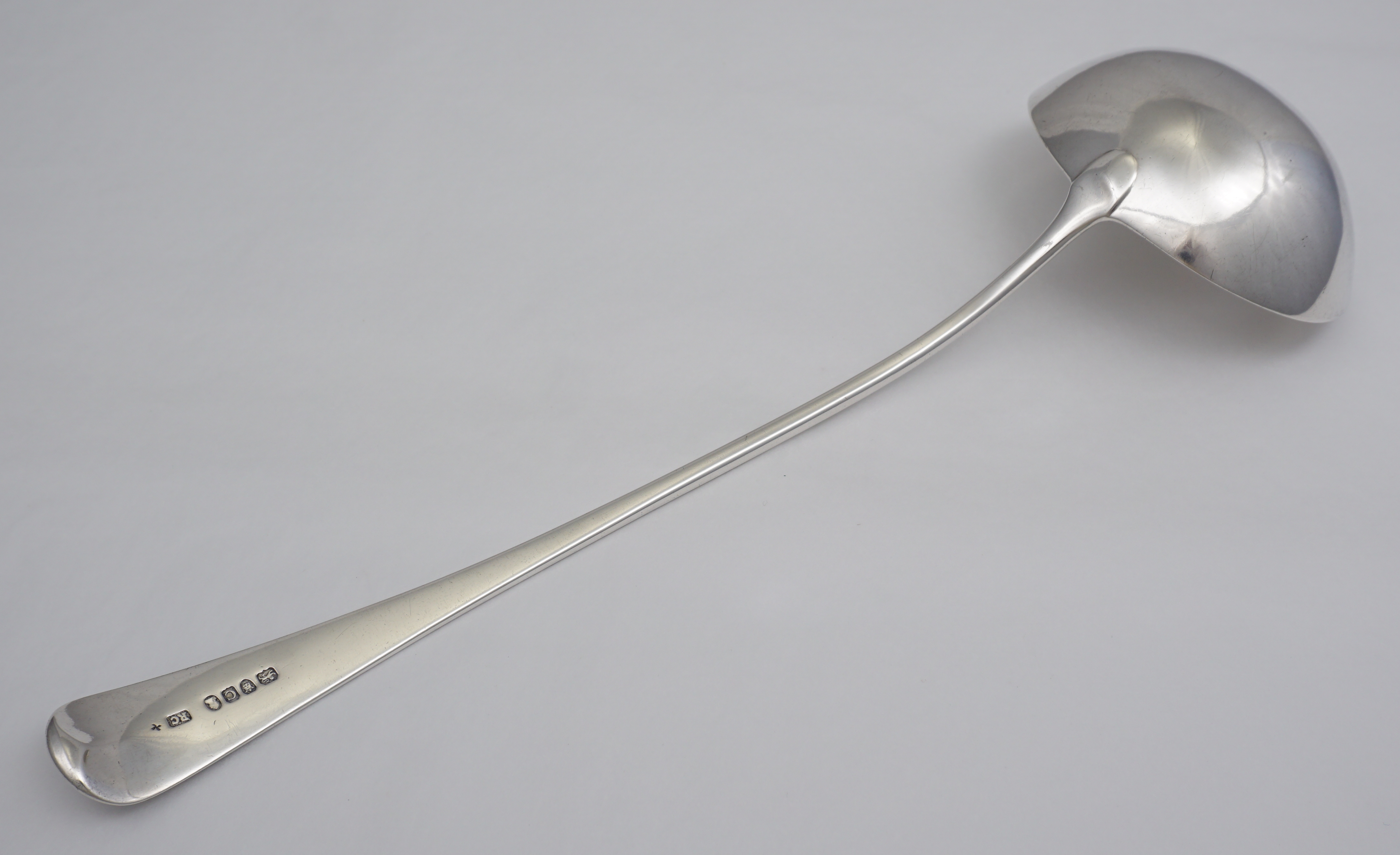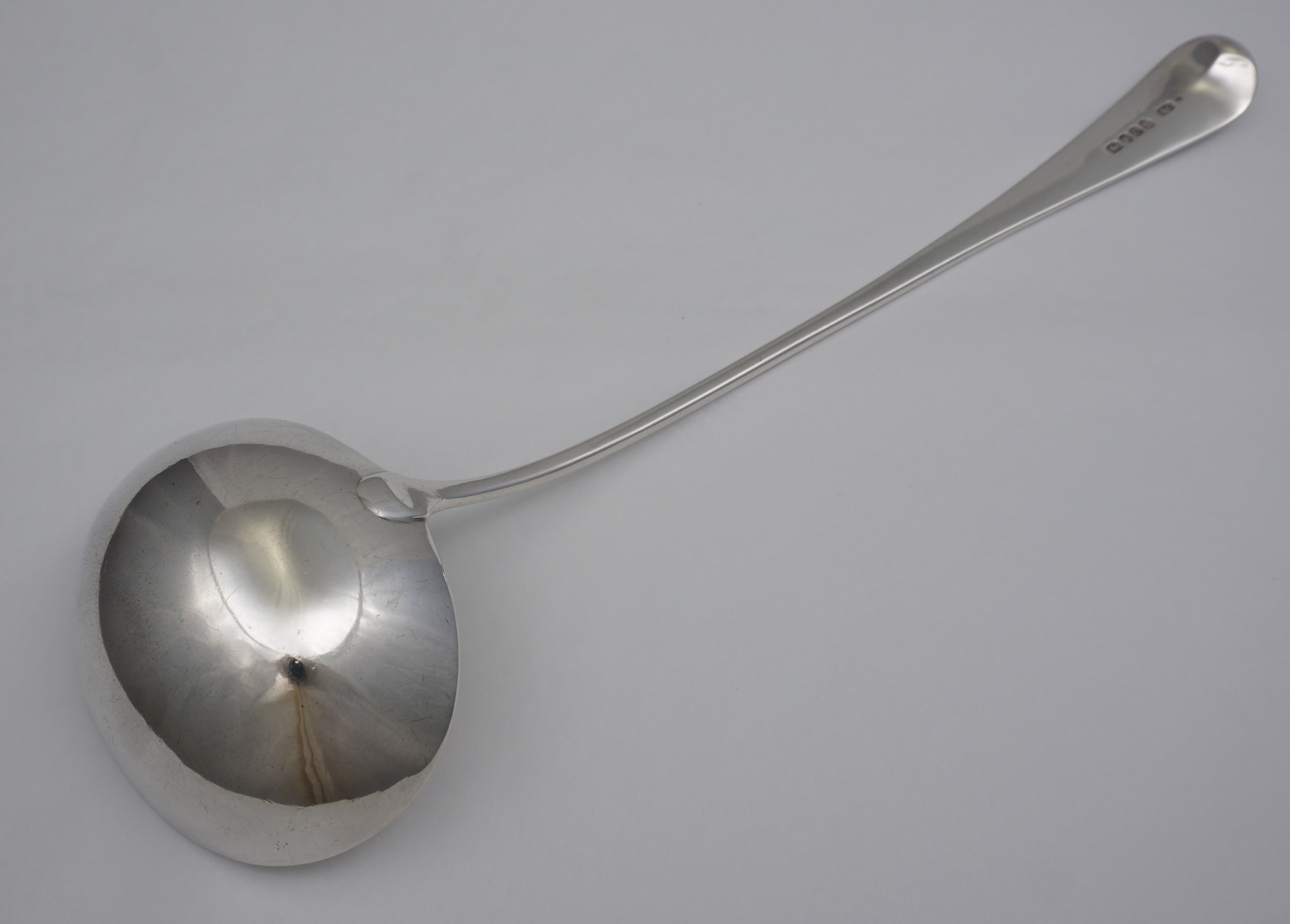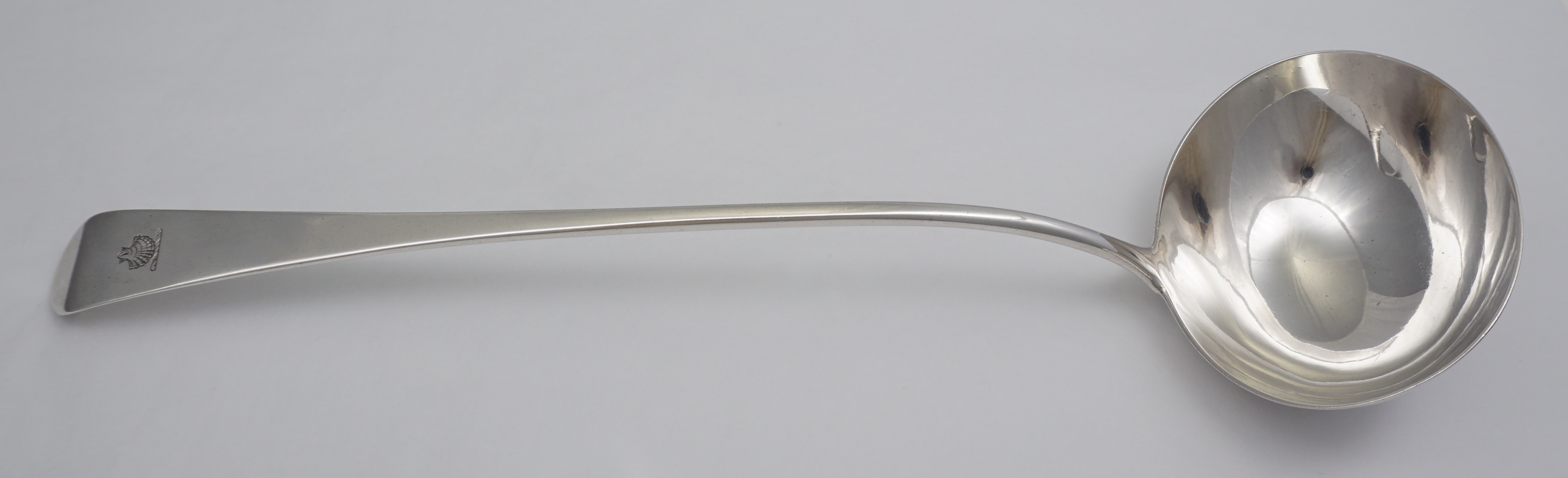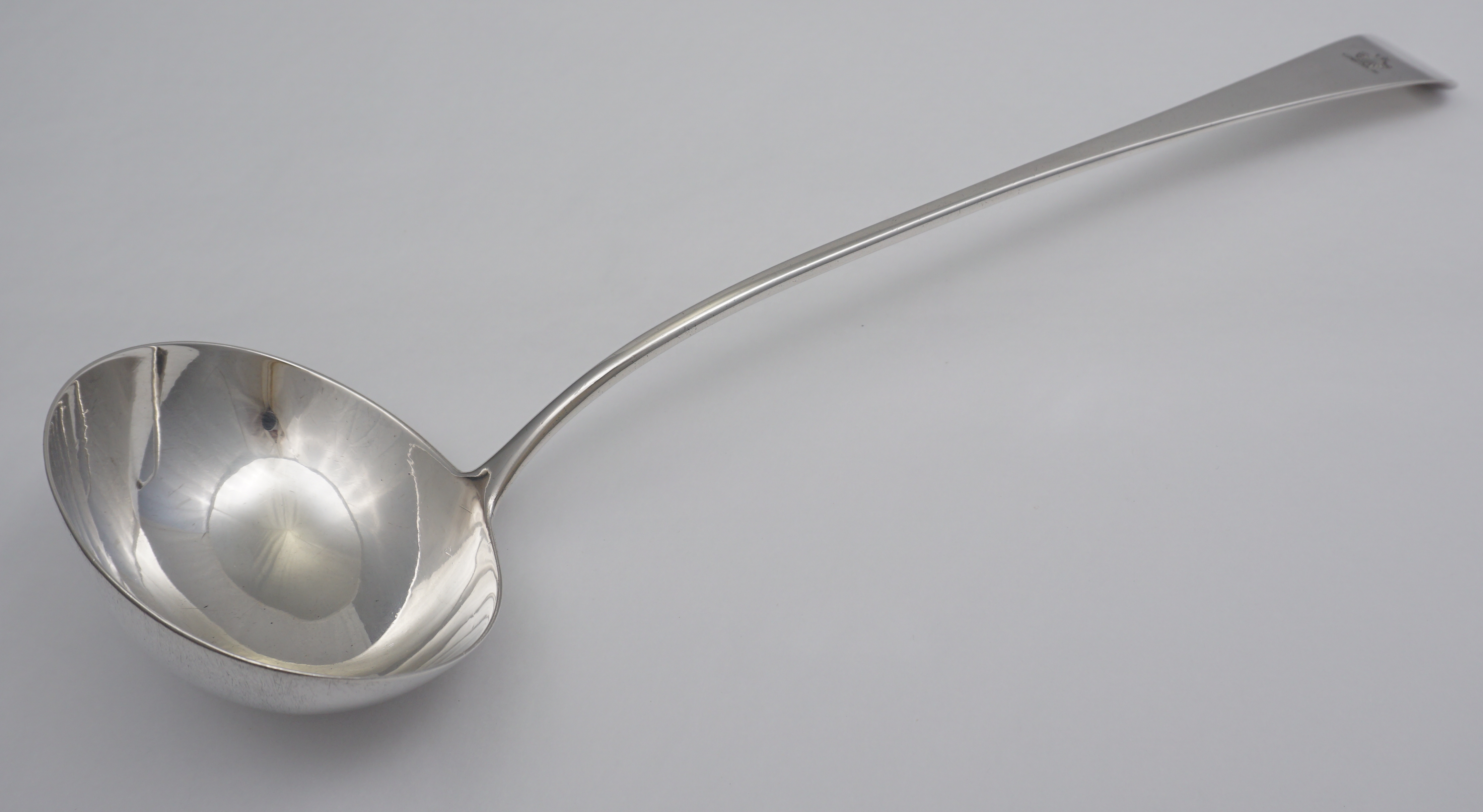 DESCRIPTION | Good antique English Georgian solid sterling silver Old English pattern soup ladle with a frontal crest engraving. |