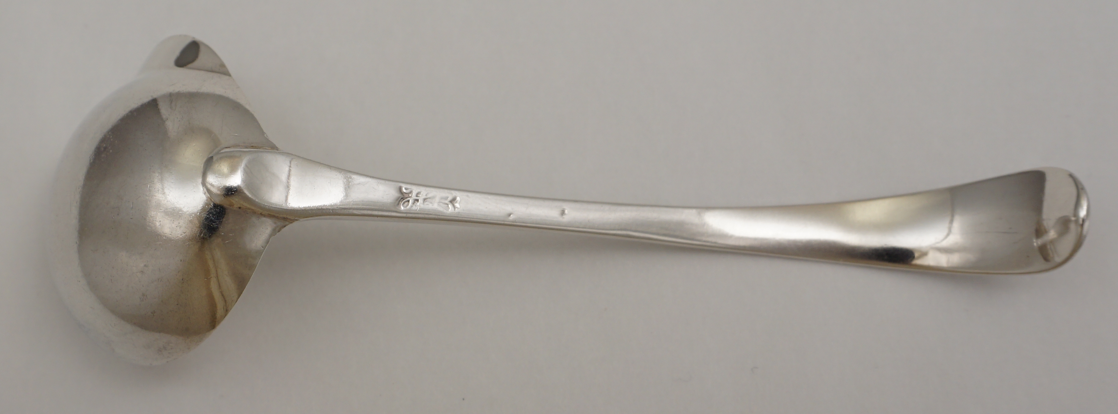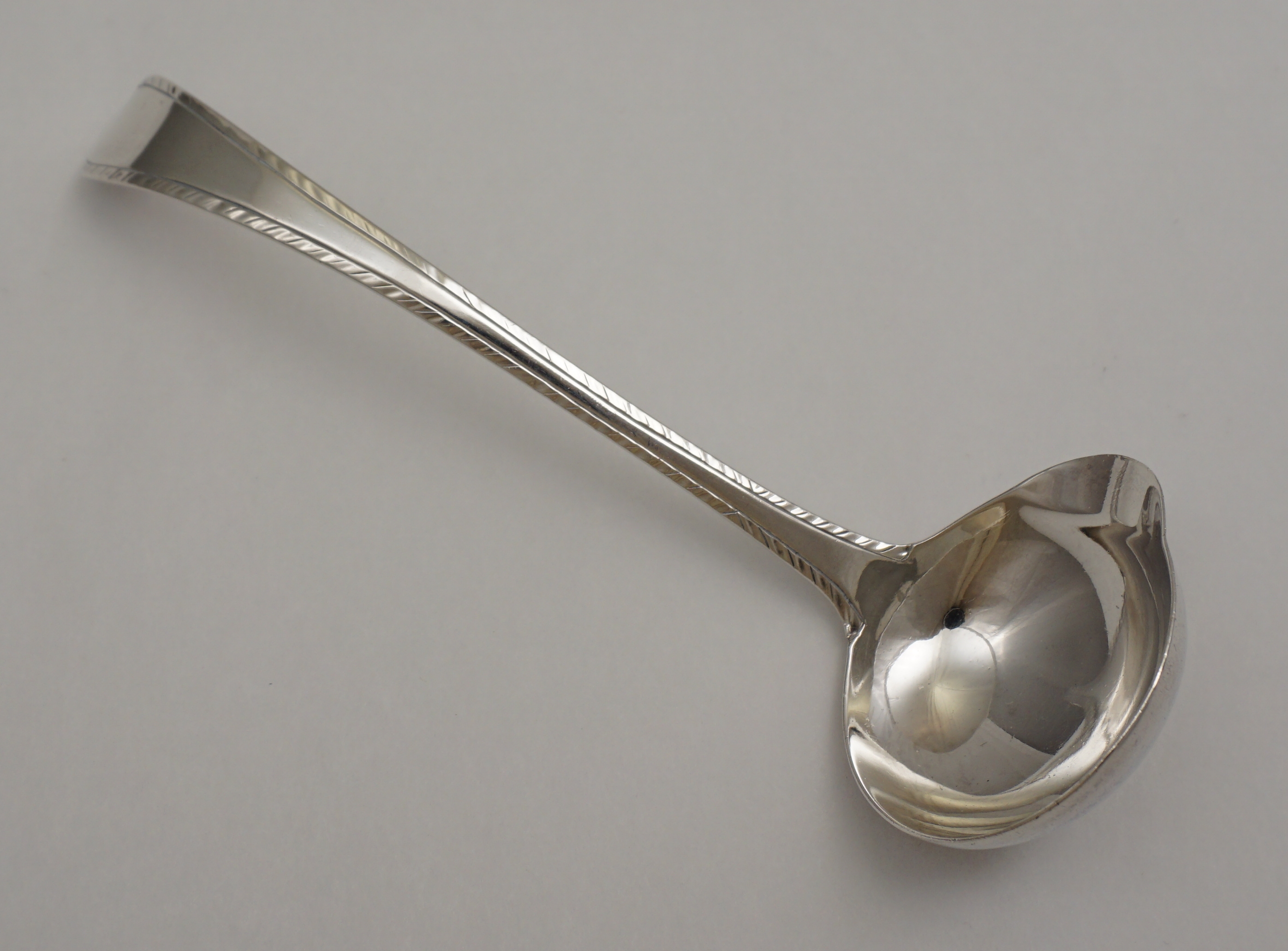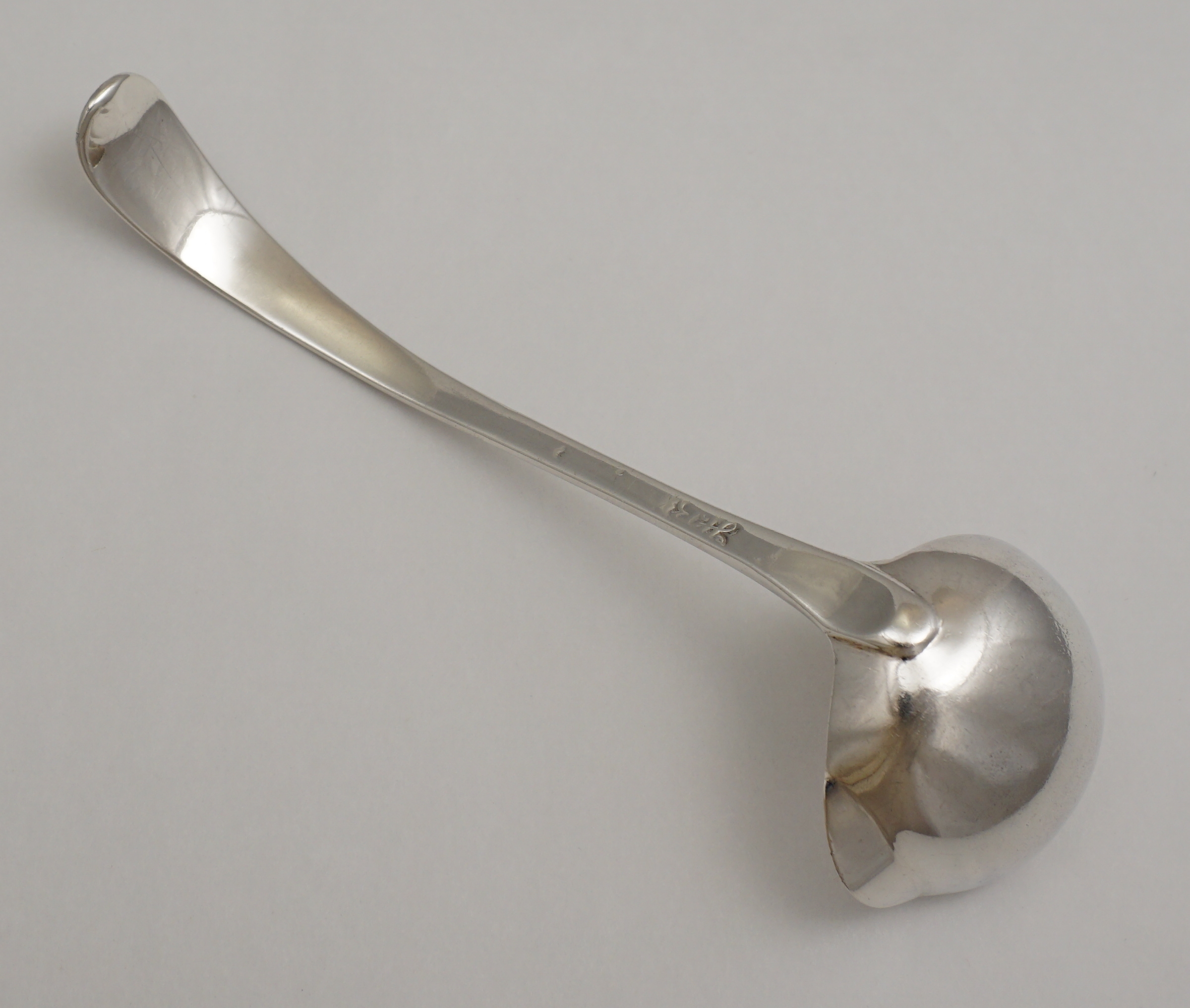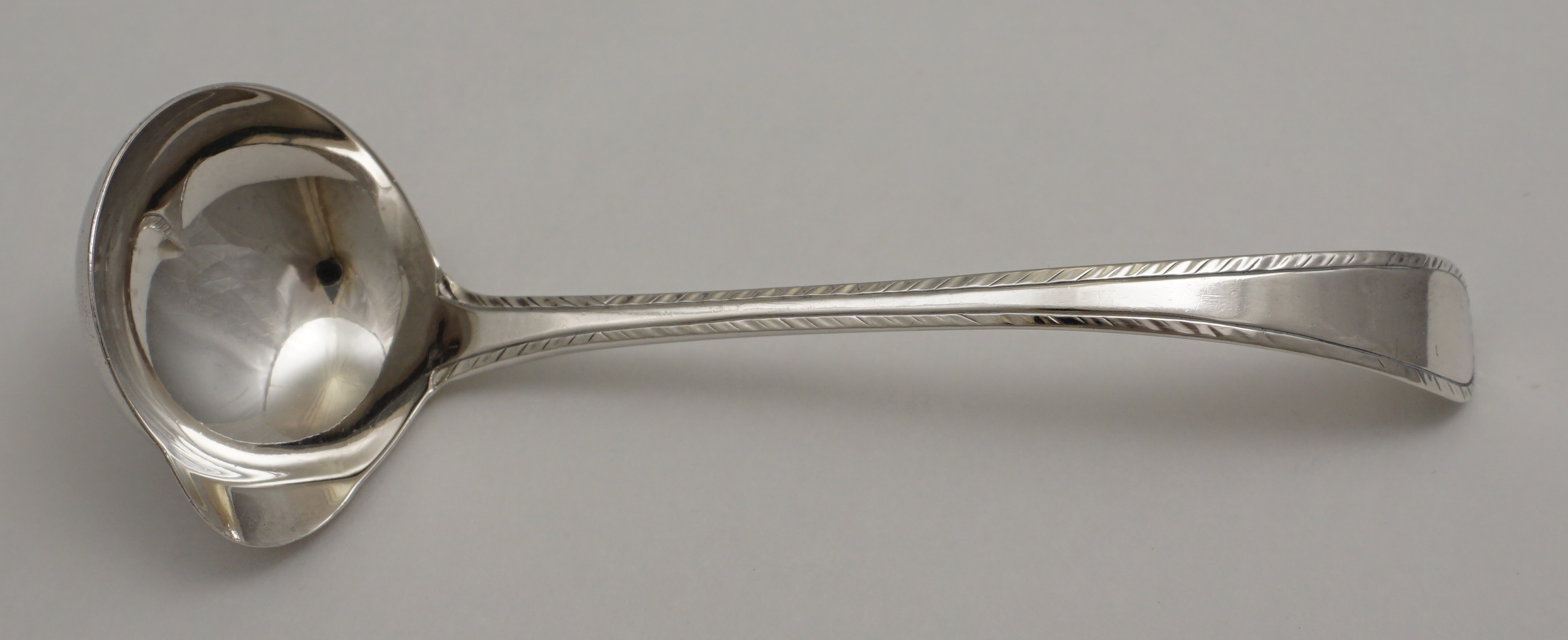 DESCRIPTION | Scarce antique English Georgian solid sterling silver Old English Feather Edge pattern cream ladle with a pouring lip. During this period silver items below a certain size were not required to have a full set of hallmarks and in this instance we have only the maker's mark struck twice |