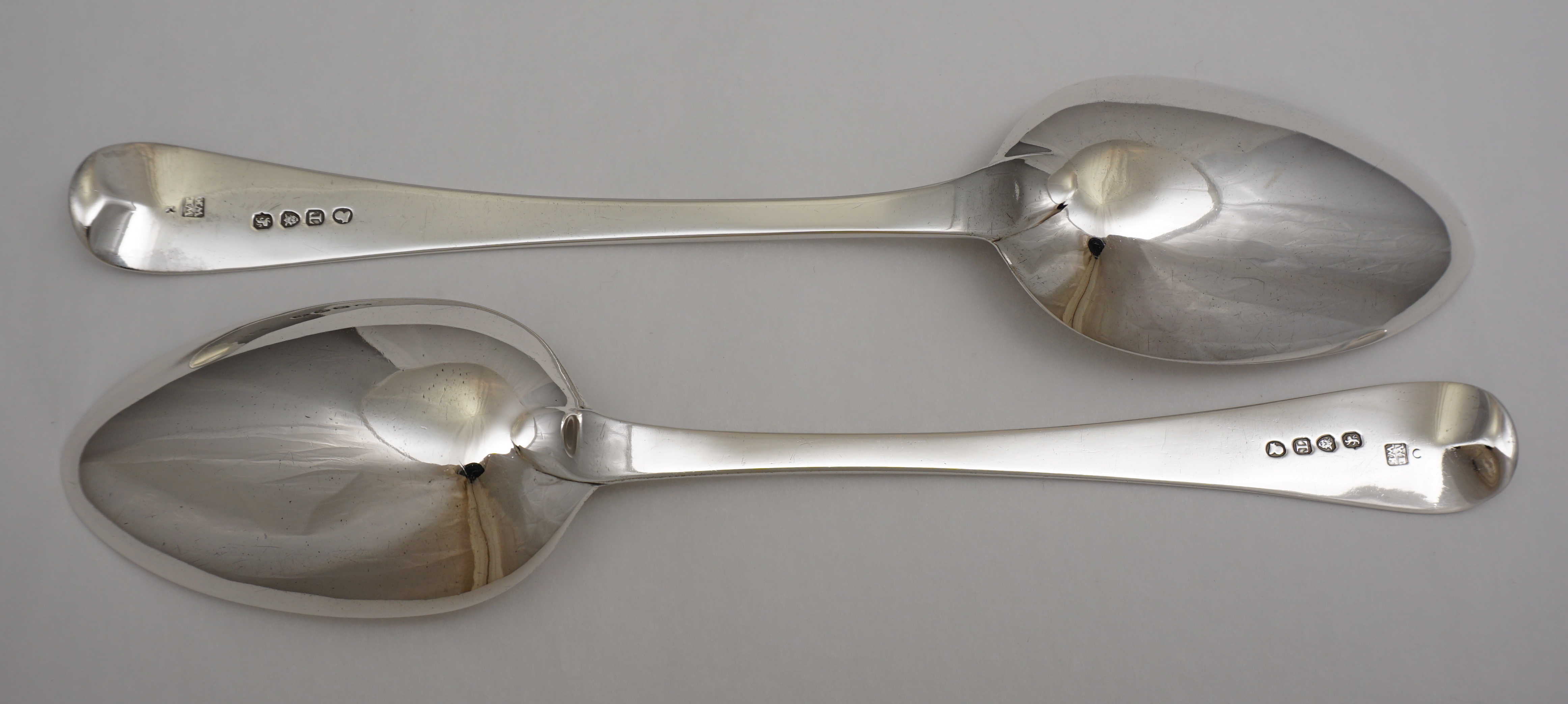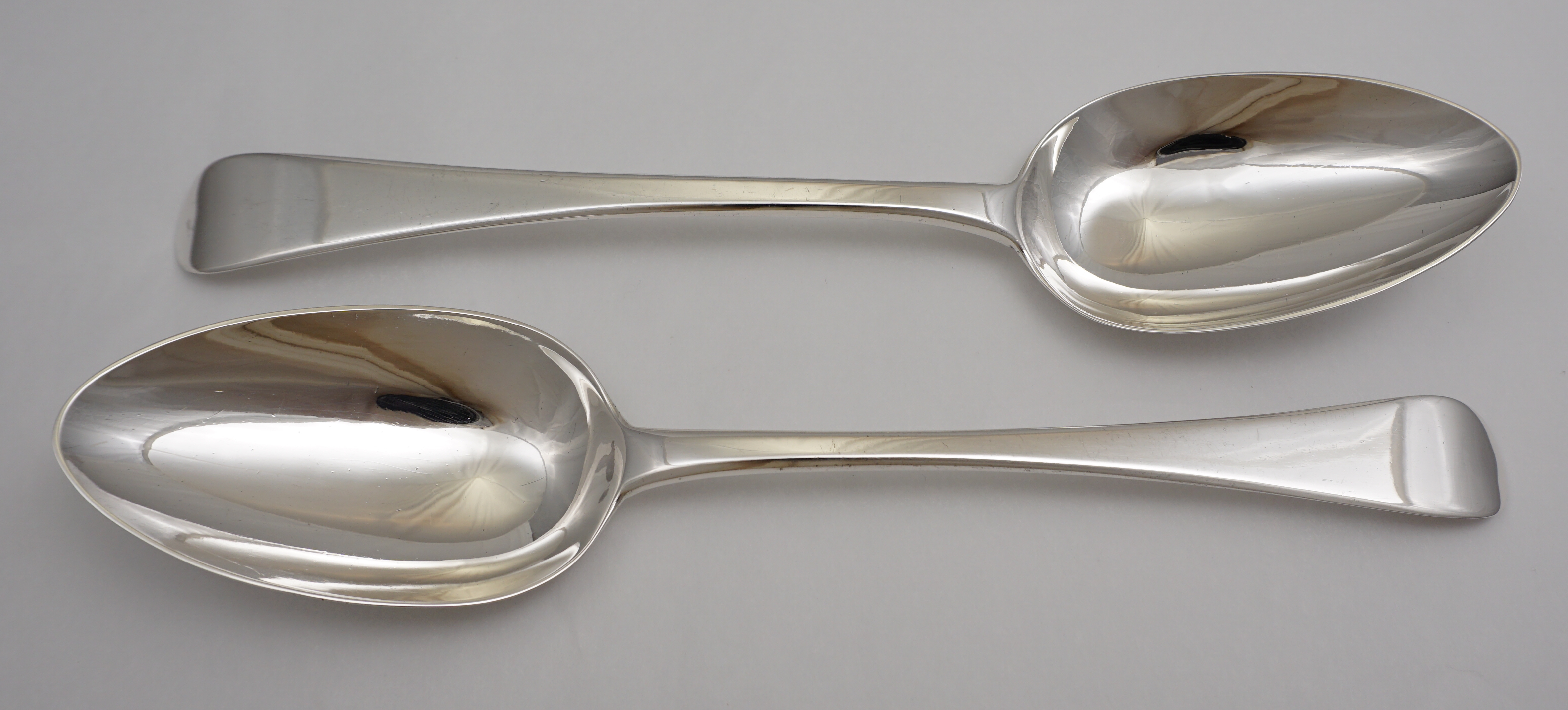 DESCRIPTION | Very good pair of antique English Georgian solid sterling silver Old English pattern table spoons with no engraving or erasure. |