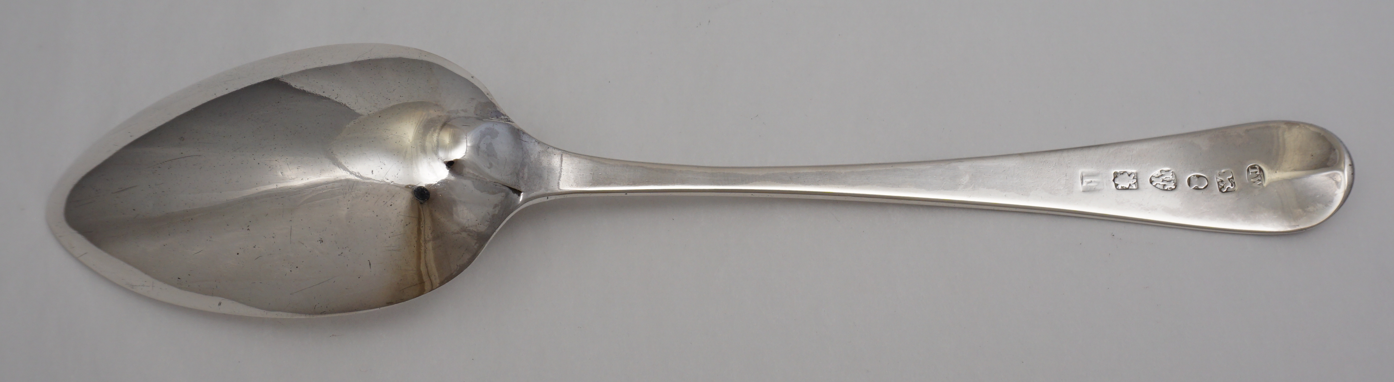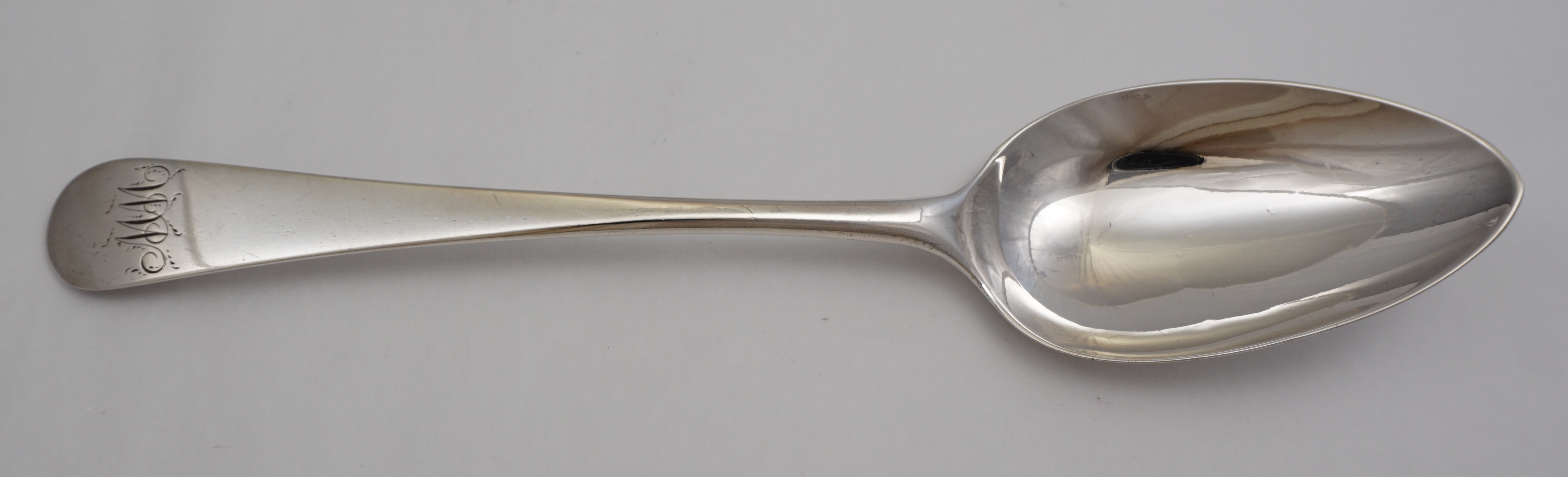 DESCRIPTION | Good antique English Georgian solid sterling silver Old English pattern table spoon with a frontal monogram engraving. |