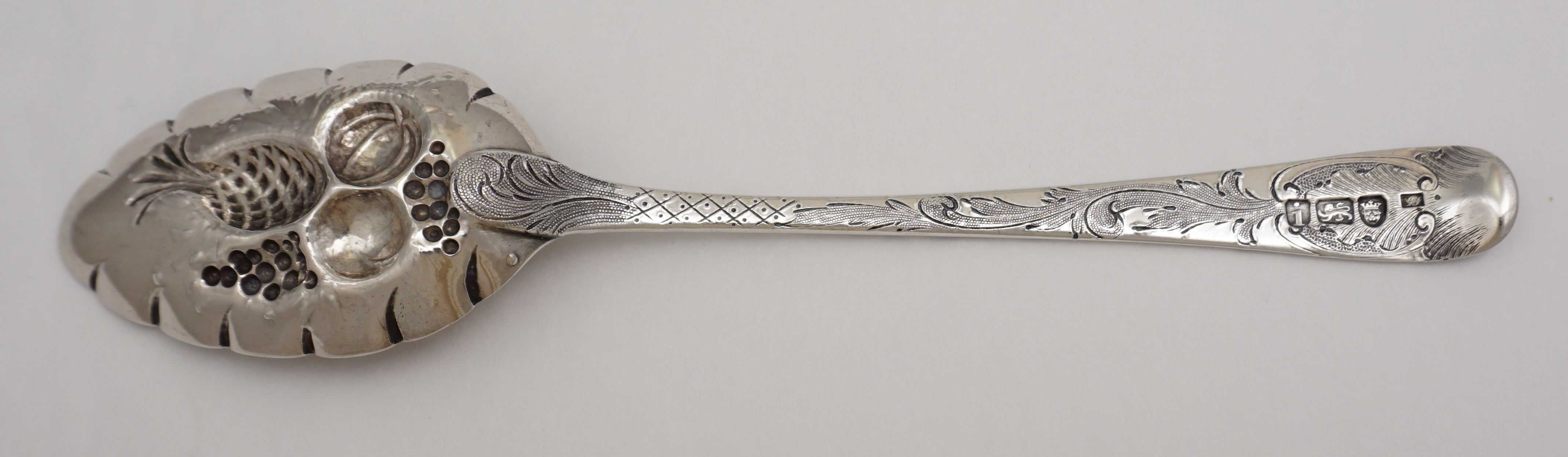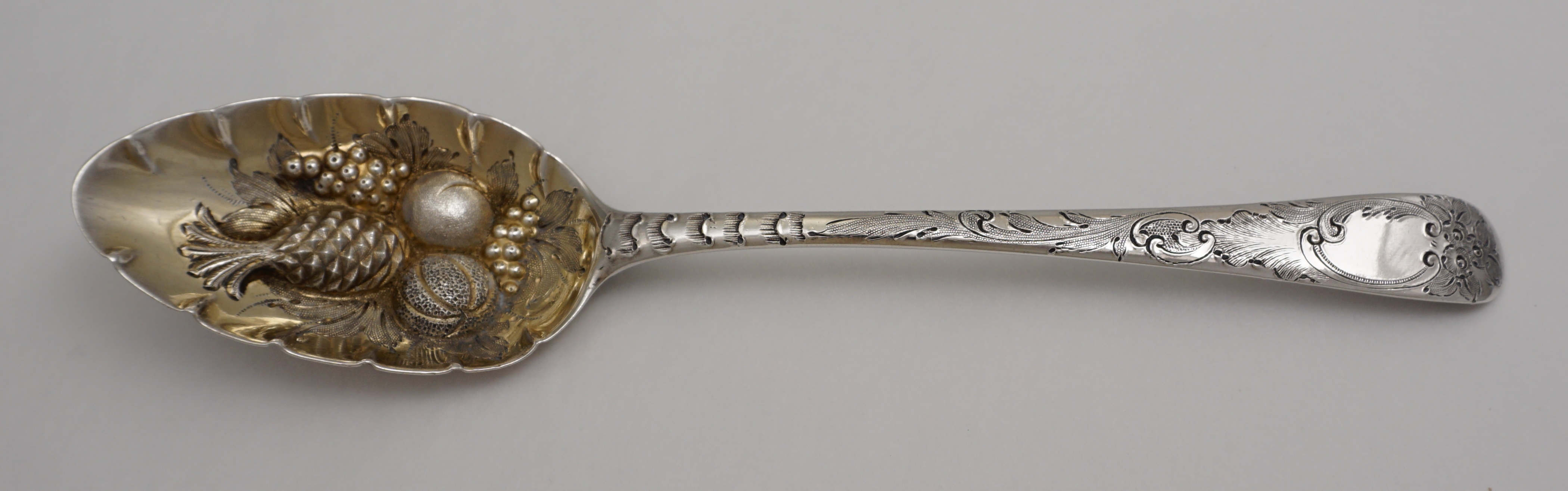 DESCRIPTION | Very pretty antique English Georgian solid sterling silver Old English pattern 'berry' table spoon with a gilded bowl. The decoration is later than the spoon. |