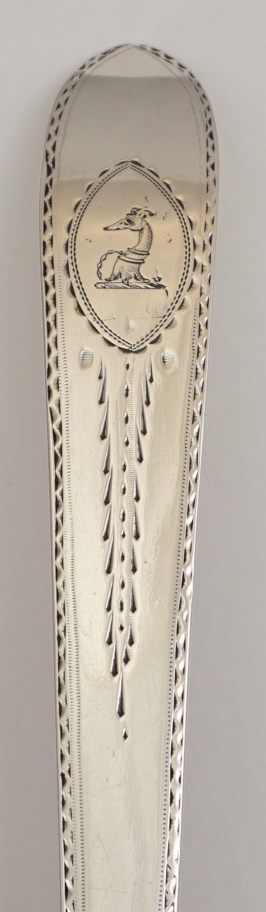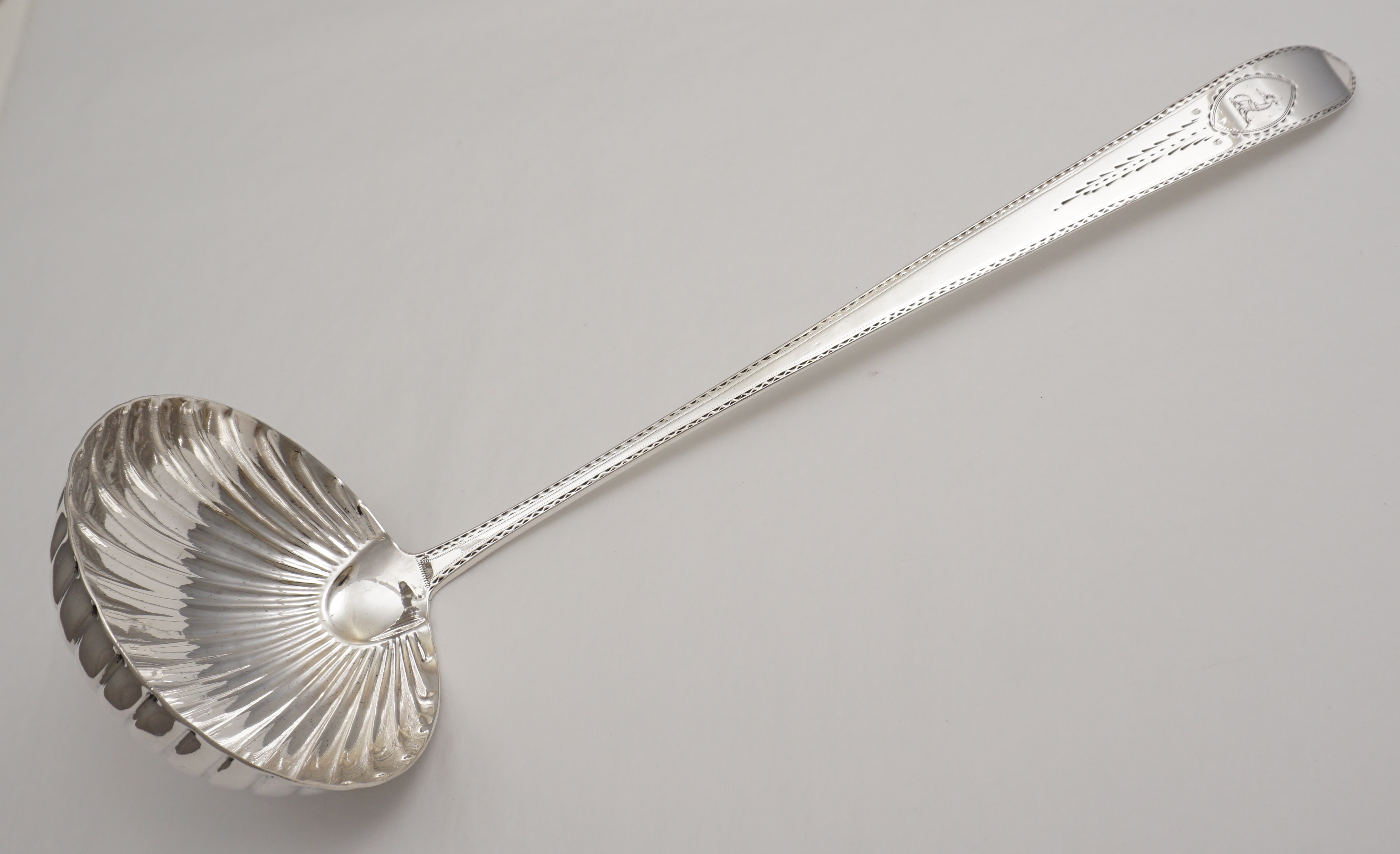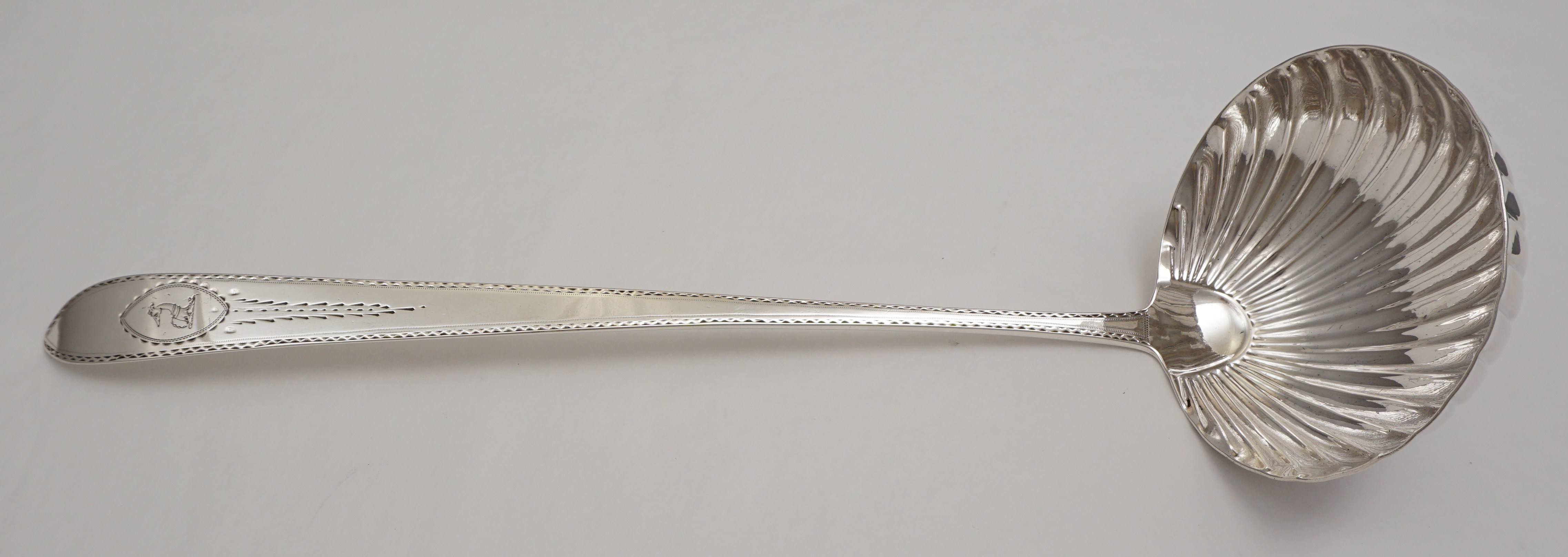 DESCRIPTION | Superb antique Georgian solid sterling silver Bright-cut Edge Irish pointed Old English pattern soup ladle with a frontal crest engraving within a bright-cut cartouche, shell bowl and beautiful hallmarks. |